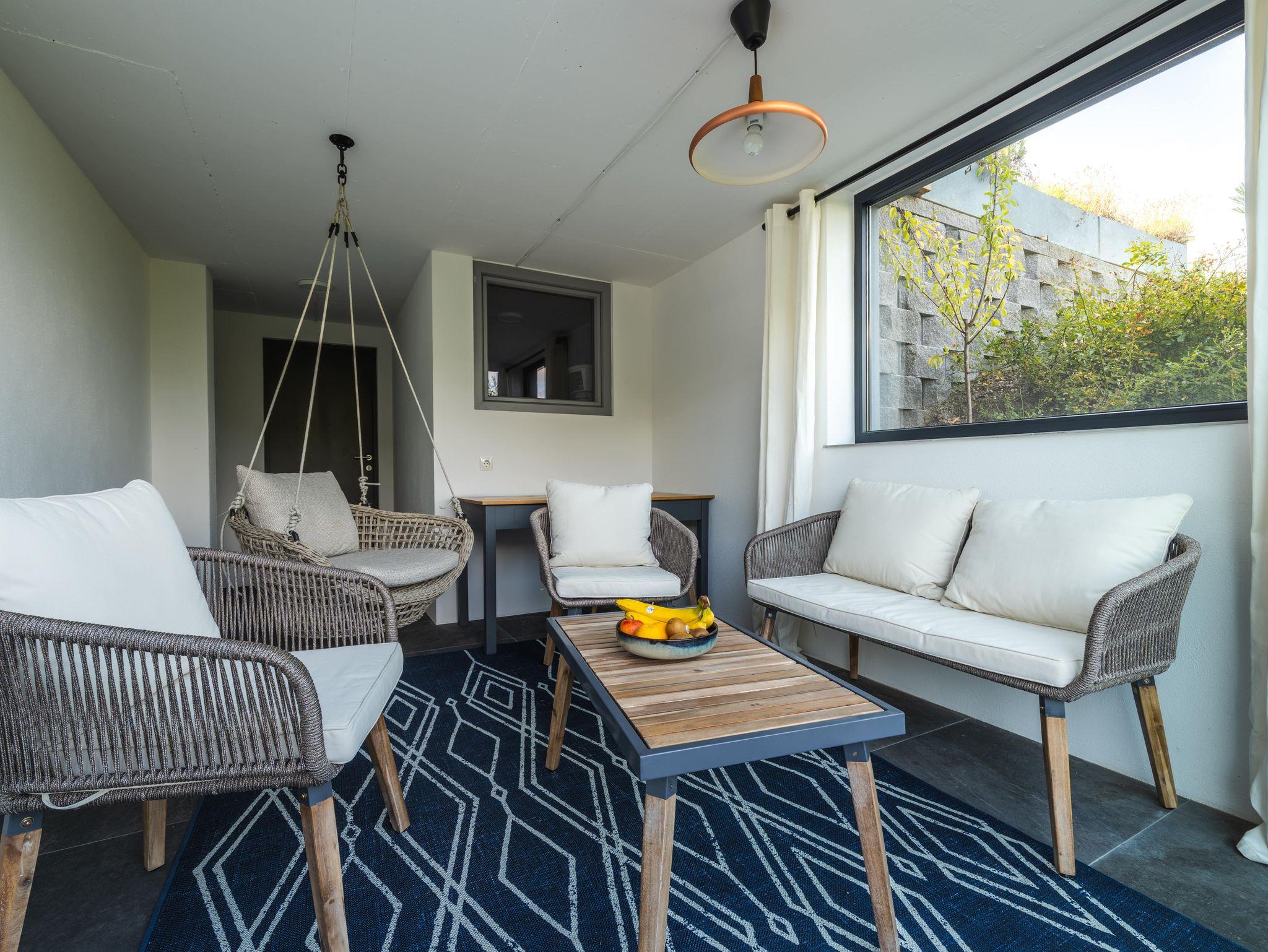 Es verfügt über zwei Schlafzimmer mit jeweils bequemen Doppelbett und Zugang zur Terrasse, sowie ein modernes Badzimmer. In dem gemütlichen Wohnzimmer finden weitere Personen auf der Schlafcouch süße Träume und können vom Duft der Kaffeemaschine aus der offenen, vollausgestatteten Wohnküche (neu) geweckt werden.