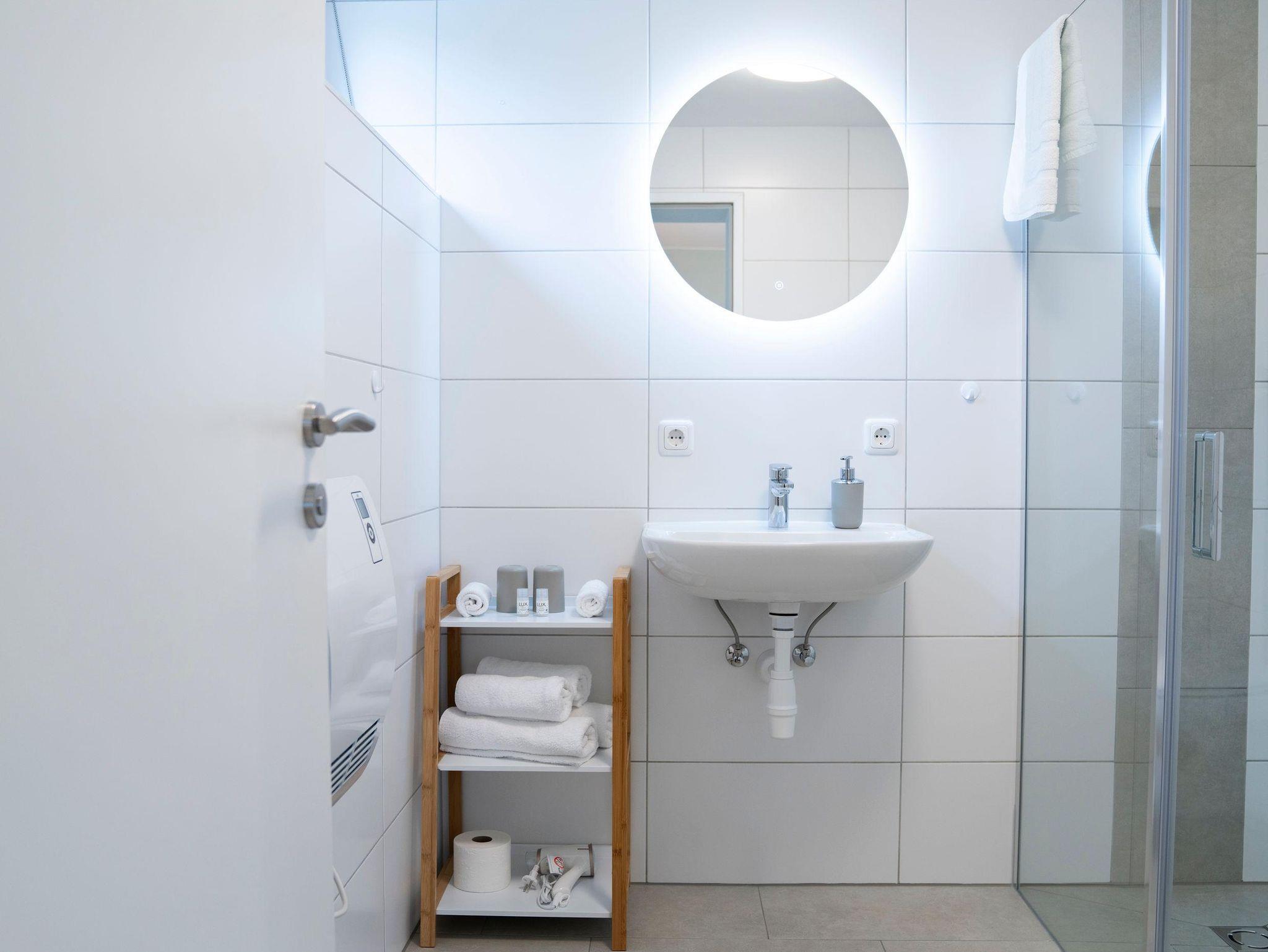 • Badezimmer mit Dusche, Toilette, Waschbecken, Spiegel, Fön