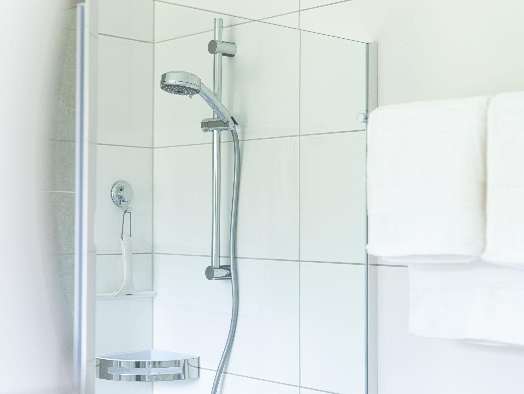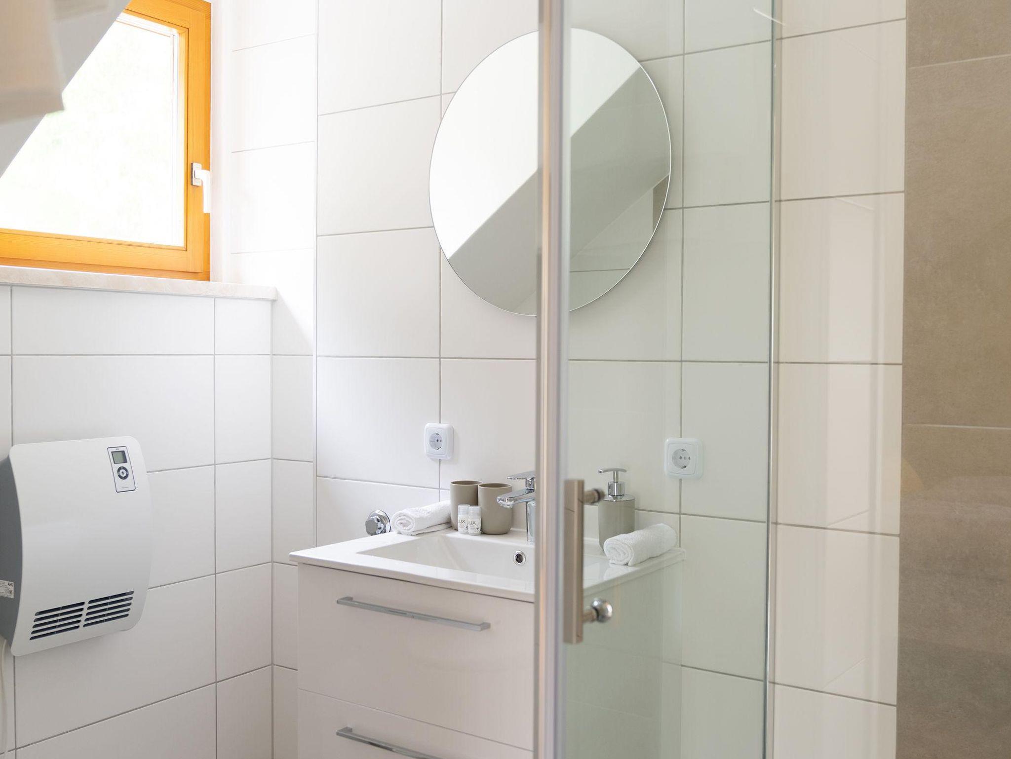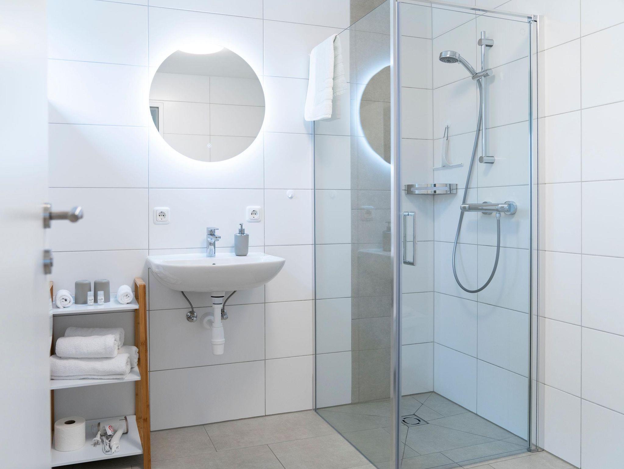 • Badezimmer mit Dusche, Toilette, Spiegel, Fön, Waschbecken mit Schrank