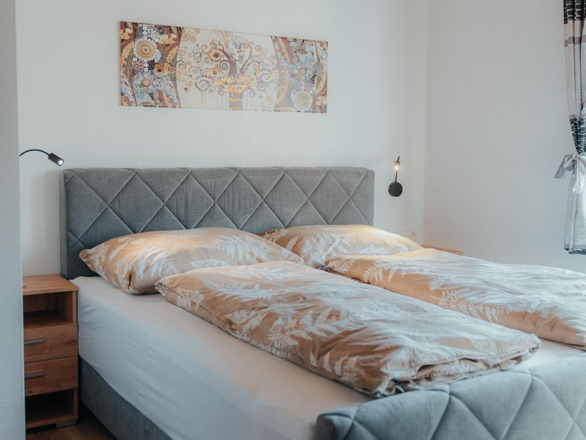Die Wohnung hat eine Gesamtfläche von 58m² und ist in zwei Schlafzimmer mit Boxspringbetten und Kasten aufgeteilt. Es gibt auch eine Wohnküche mit einer Couch und einem Fernseher sowie einer Sitzgruppe für 4 Personen. Die Küche ist voll ausgestattet mit einem Kühlschrank, Geschirrspüler, E-Herd, Dunstabzug und anderen Geräten. Eine Garderobe ist ebenfalls vorhanden. Die gesamte Wohnung verfügt über eine Fußbodenheizung und einen großen Balkon mit Sitzmöglichkeiten. Das Badezimmer ist mit einer Dusche, einem WC und einem Handtuchtrockner ausgestattet.