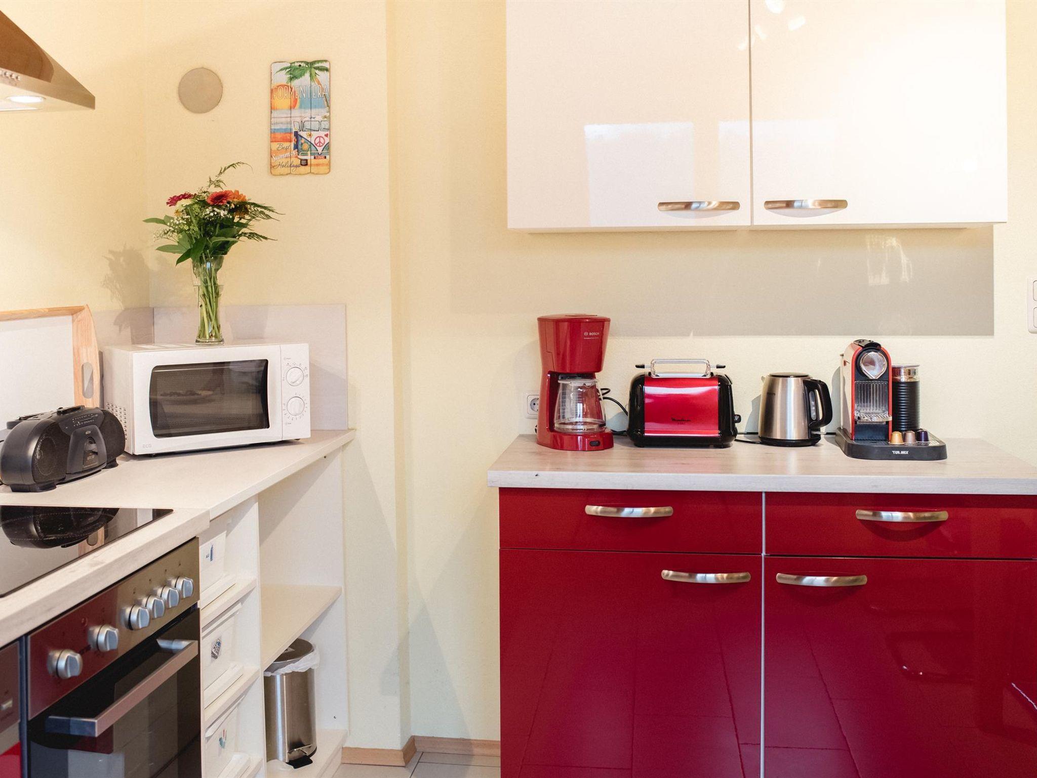 Im Schlafzimmer befindet sich ein großes Doppelbett und im Wohnzimmer gibt es ein großes Sofa, auf welchem zwei weitere Erwachsene oder Kinder schlafen können. Beide Zimmer verfügen über einen Balkon mit schöner Aussicht. Die Küche ist voll ausgestattet (Herd, Backofen, Mikrowelle, Toaster, Kaffeemaschine - Filter und Nespresso, Wasserkocher, Spülmaschine und Reinigungsmittel). Die Sitzecke in der Küche ist der ideale Ort, um Ihre Mahlzeiten gemeinsam zu genießen. Handtücher und Bettwäsche werden kostenlos zur Verfügung gestellt!