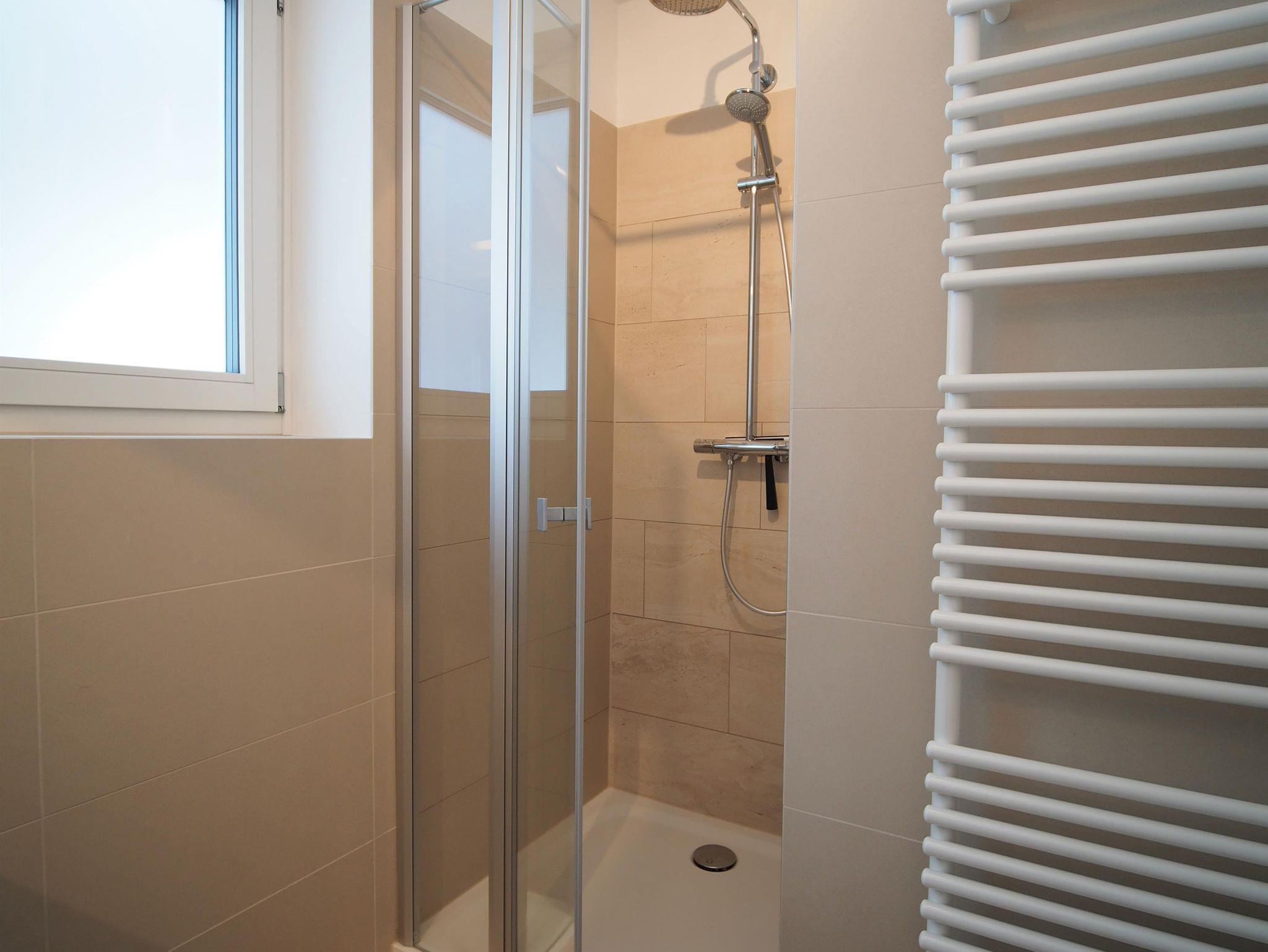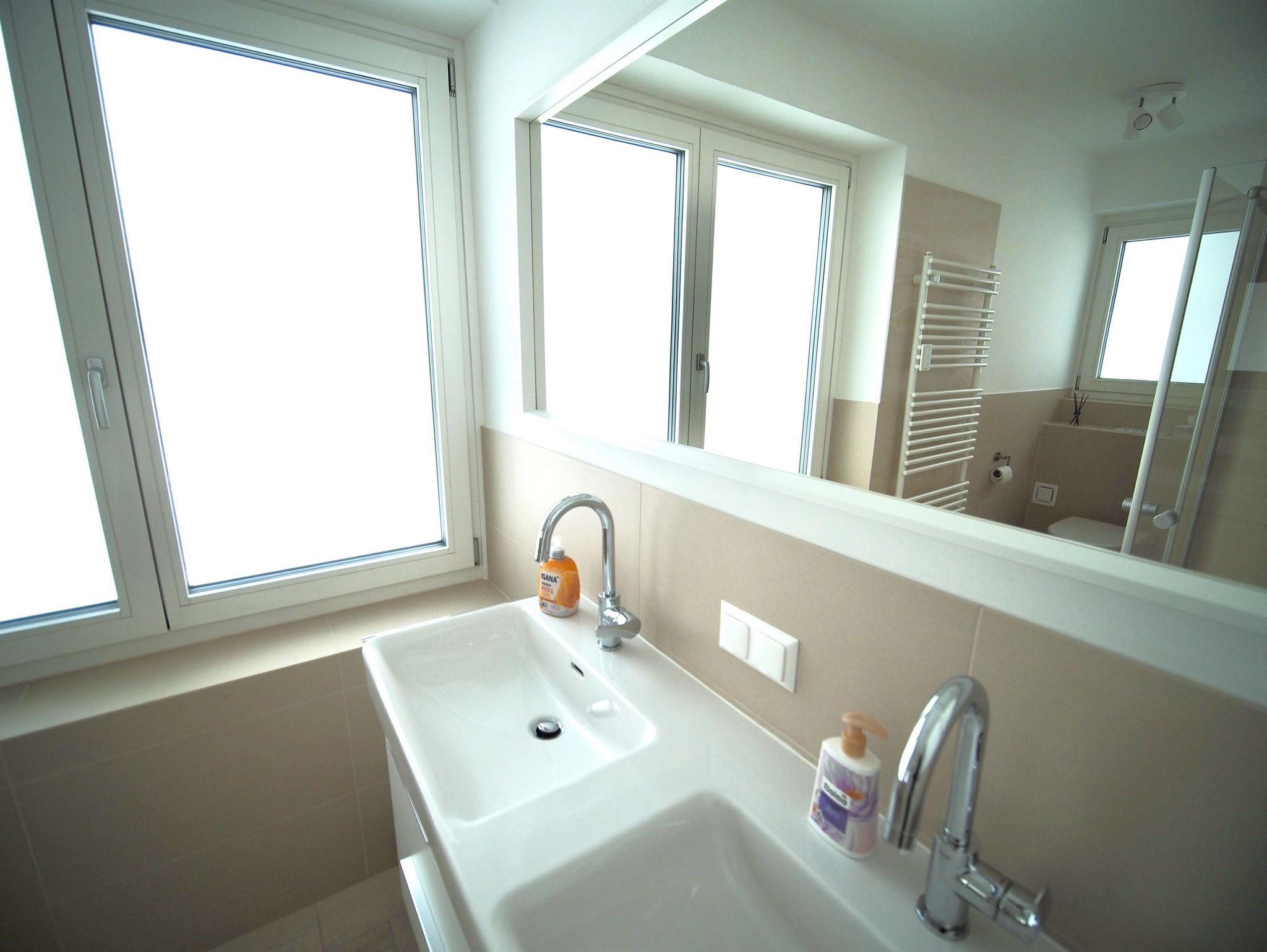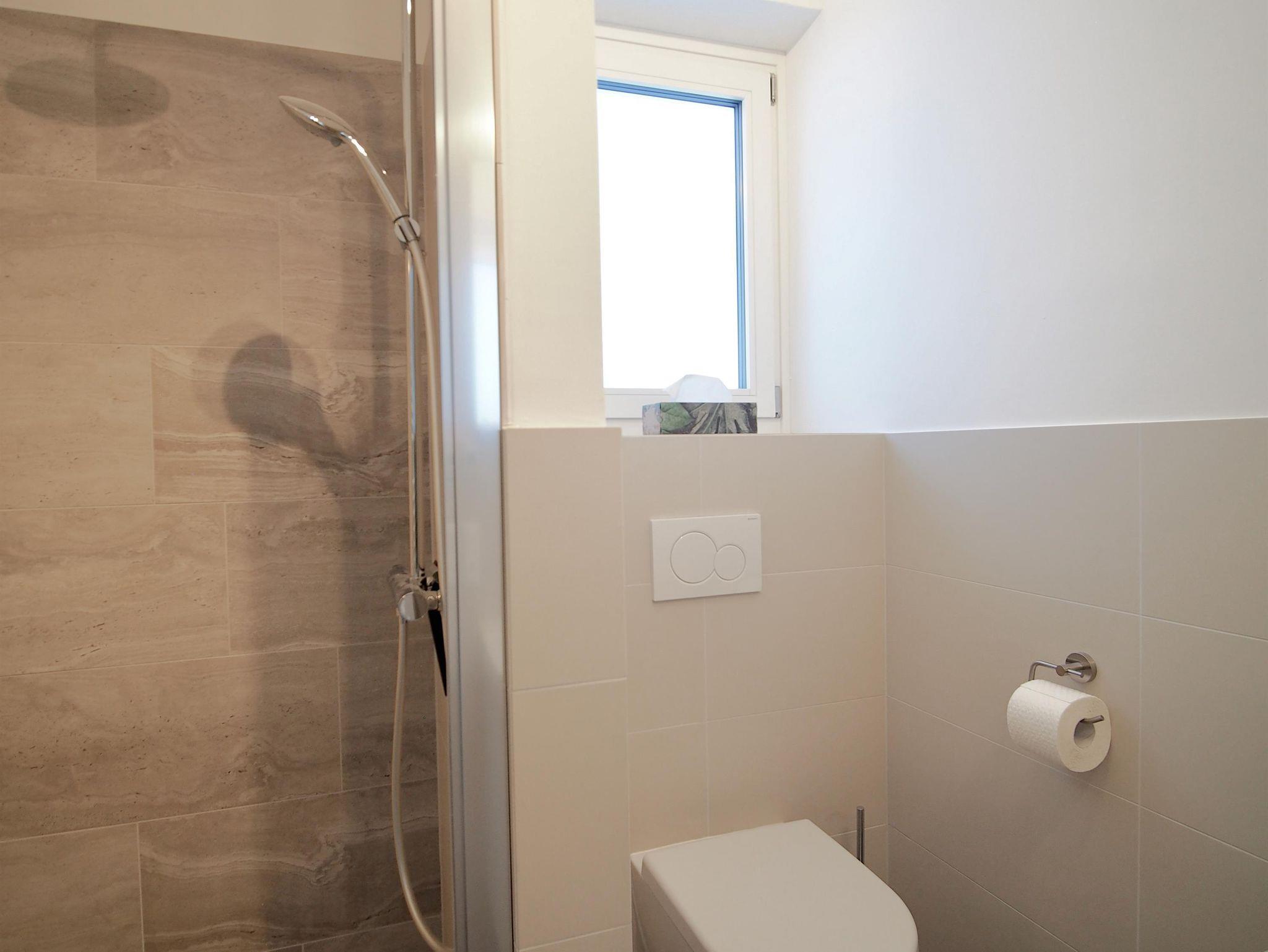 Insgesamt stehen drei Duschbäder mit WC zur Verfügung, im oberen Stockwerk zwei und im unteren Stockwerk ein weiteres. Die Küche bietet ausreichend Möglichkeit für zehn Personen zu kochen. Ein extra großes Induktionskochfeld, ein Backofen mit zahlreichen Sonderfunktionen, ein Mikrowellenherd und ein grosser doppeltüriger Kühlschrank sollten hierbei helfen. Alle Elektrogeräte und die meisten Einrichtungsgegenstände sind bedienungsfreundlich und neu.
