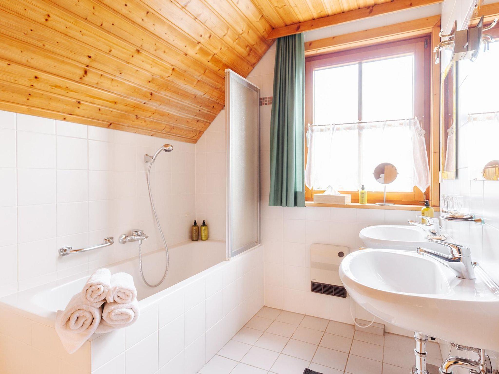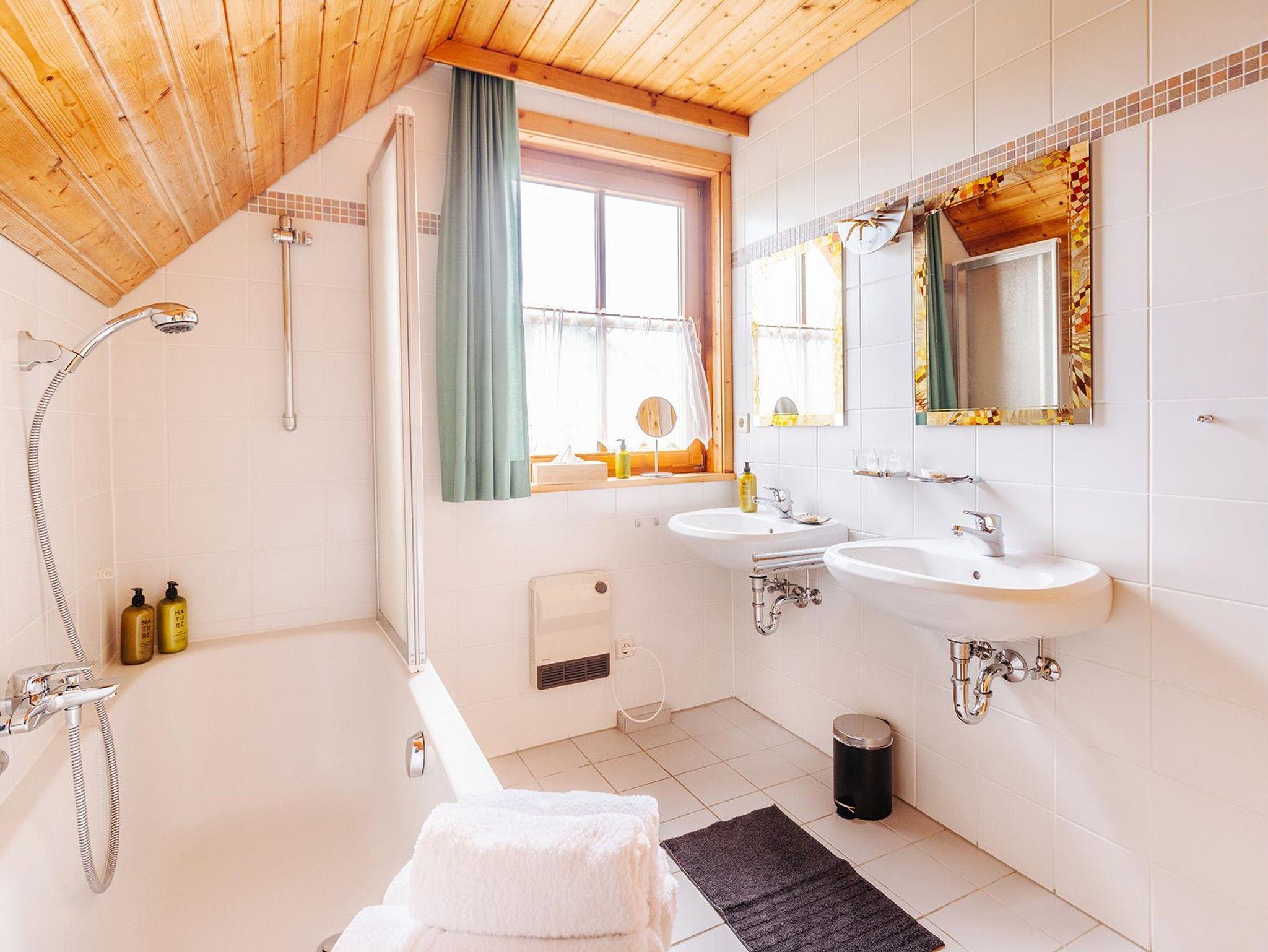 • Badezimmer mit Badewanne & Doppelwaschbecken, Föhn, hochwertigen Bio-Pflegeprodukten, Hand- & Badetücher
