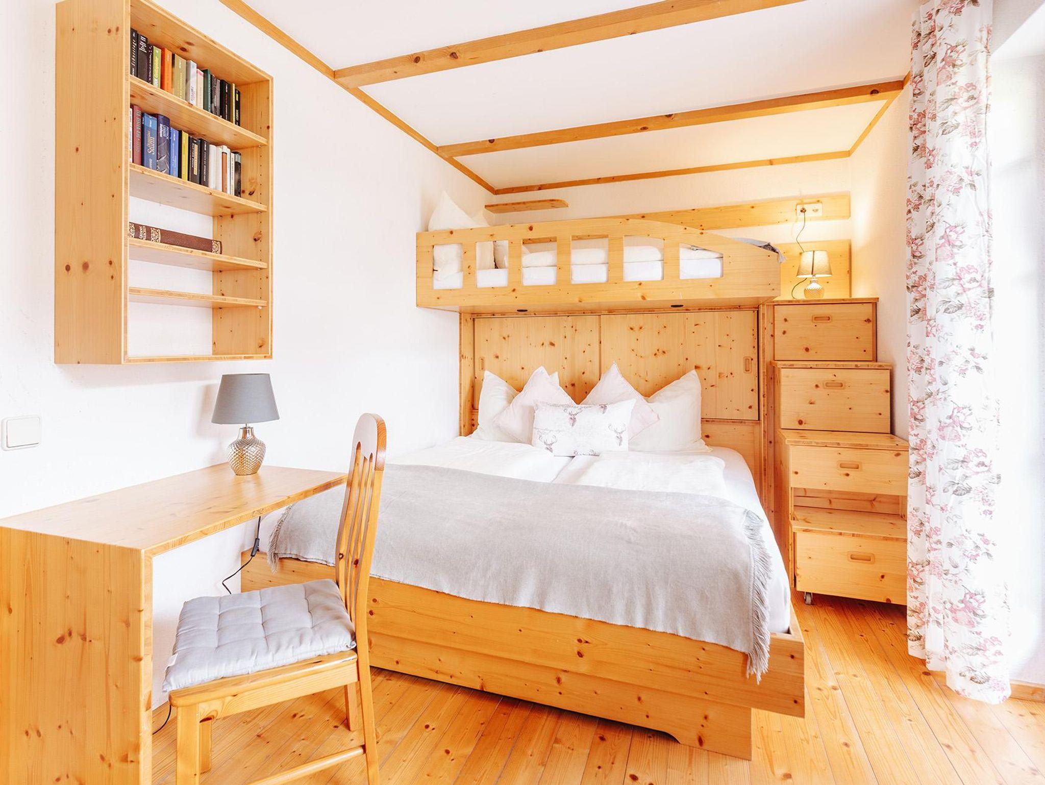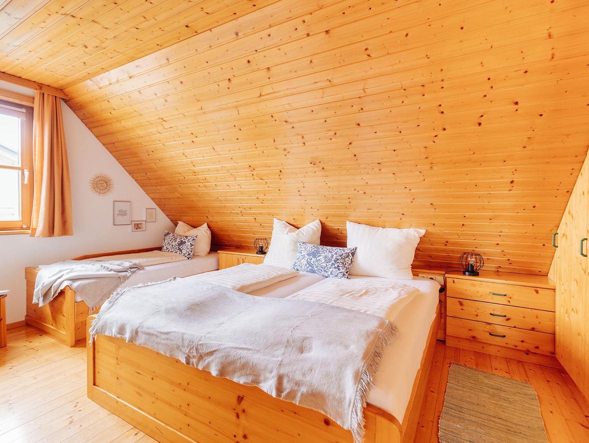• Ein Schlafzimmer mit einem Doppelbett und einem Einzelbett sowie ein Schlafzimmer mit zwei Einzelbetten mit Vollholzmöbel und Baumwollbettwäsche