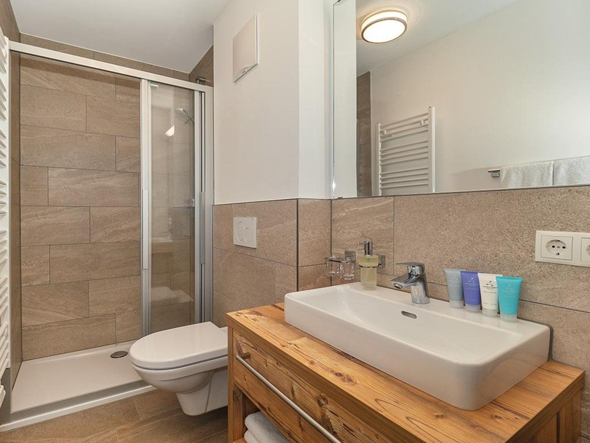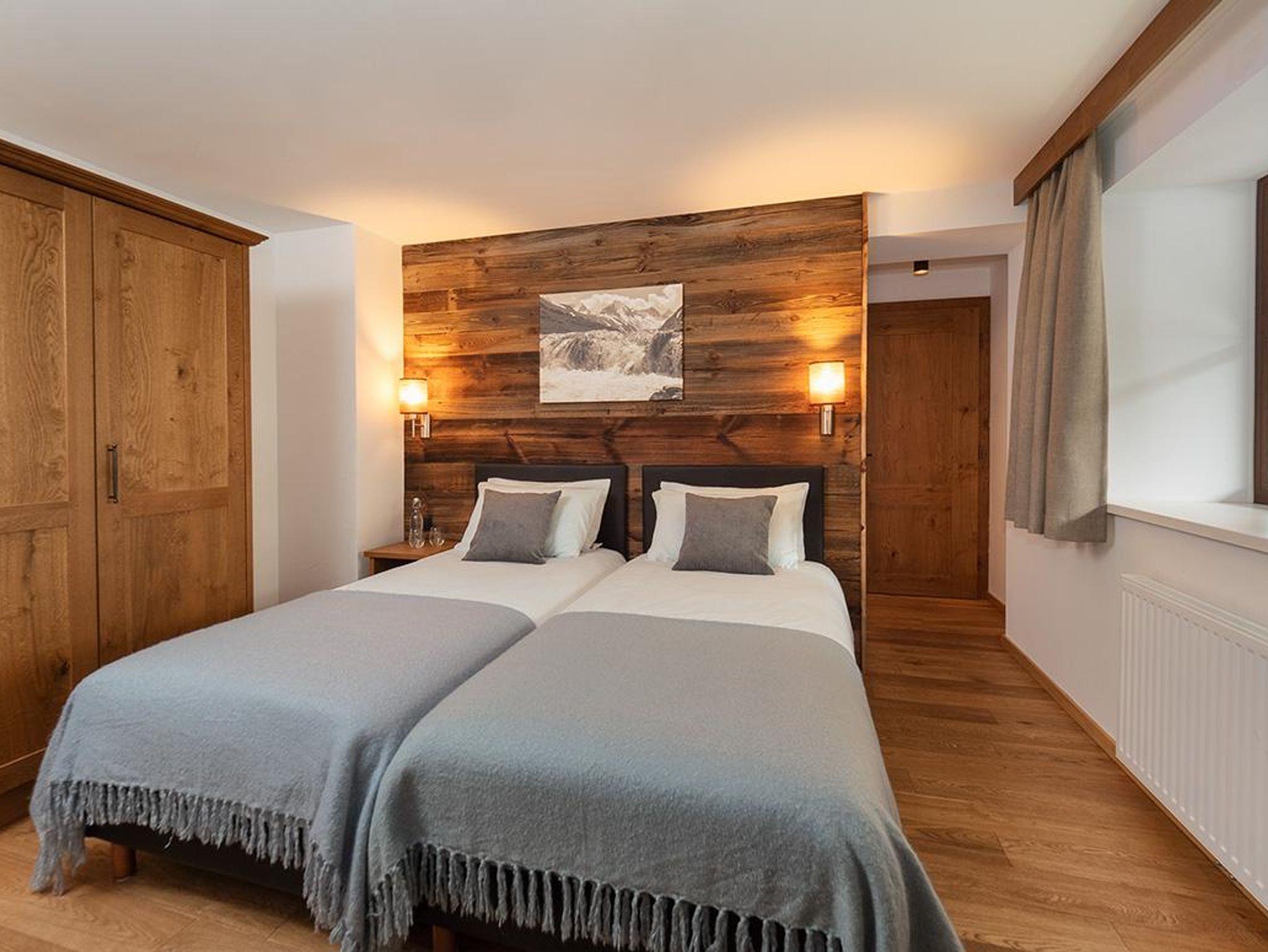 Das Chalet Viridi bietet Platz für bis zu 4 Personen auf einer Wohnfläche von 75m². Die zwei großzügigen, rustikalen Schlafzimmer sind mit einem bequemen, teilbaren Boxspring-Doppelbett, einem geräumigen Kleiderschrank und einem Nachttischchen ausgestattet. Jedes Schlafzimmer verfügt über ein eigenes modernes Badezimmer mit Waschbecken, Dusche oder Badewanne, WC, Haarföhn und einem Handtuchtrockner.