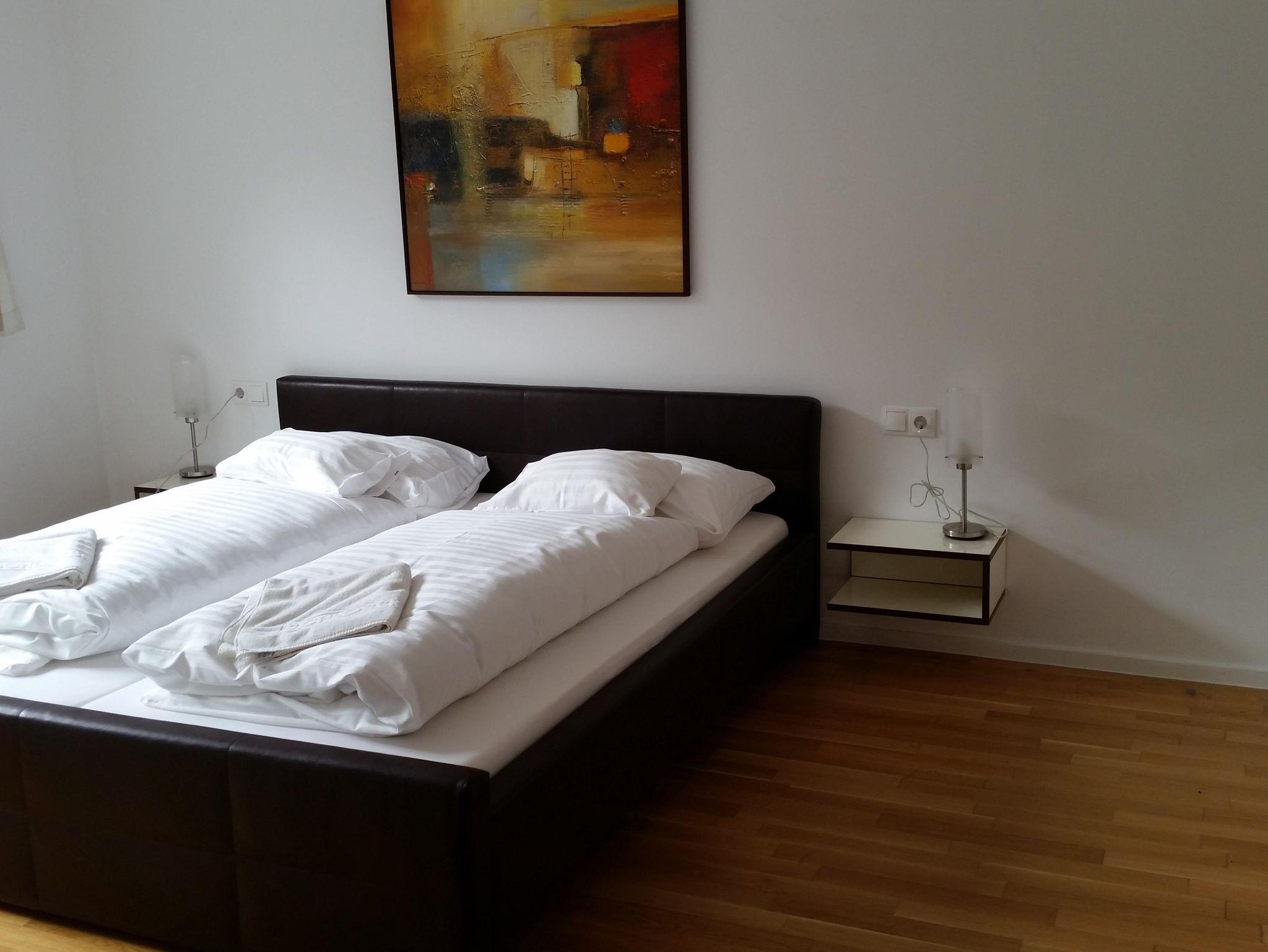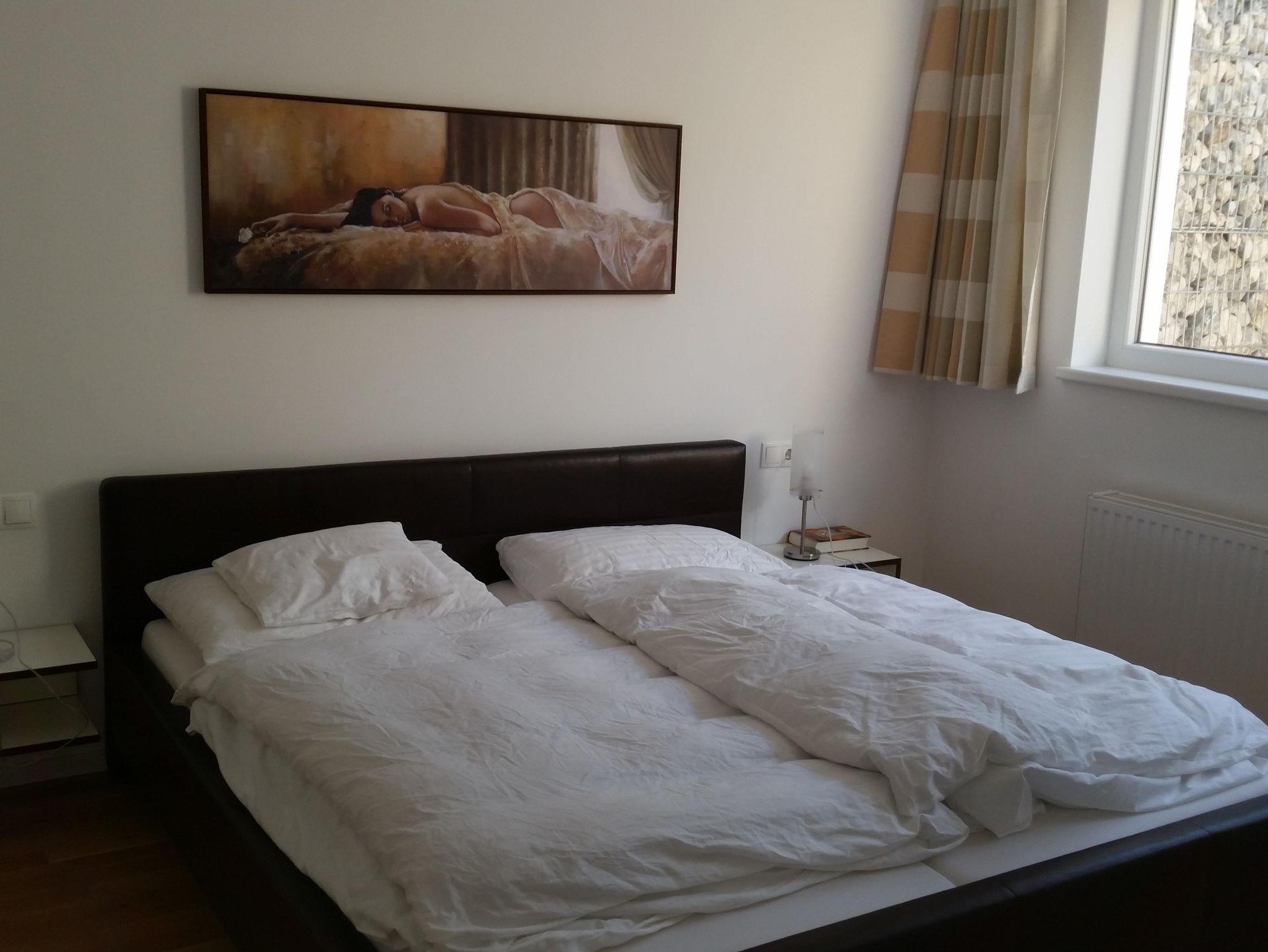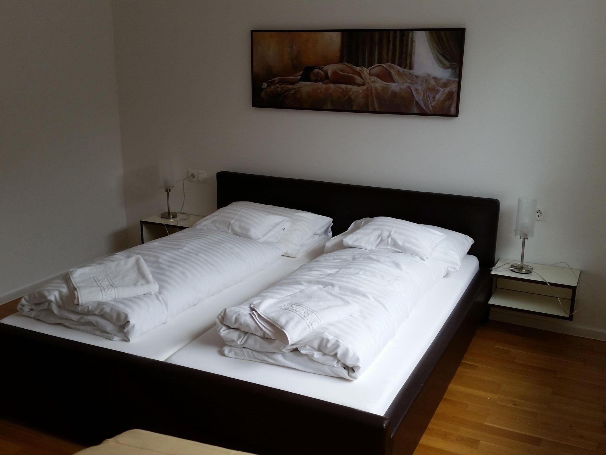 Dich erwarten 2 Schlafzimmer (einmal Doppelbett und Einzelbett [Das Einzelbett ist von 1,80 Metern Länge.], einmal Doppelbett), Wohnküche, sowie 2 Badezimmer (einmal inklusive Badewanne, WC und Waschbecken - einmal inklusive Dusche, WC und Waschbecken).