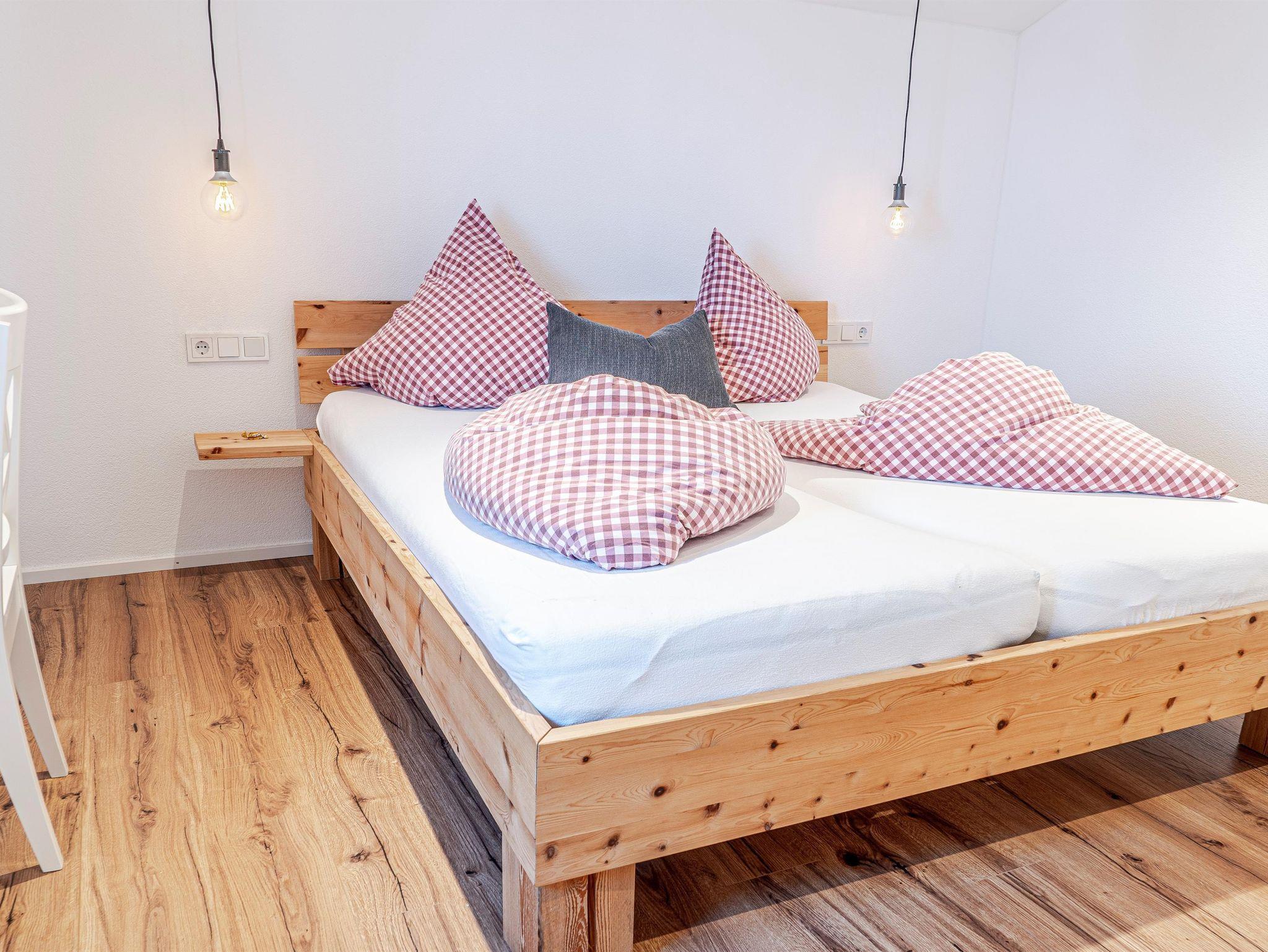 Alle Ferienwohnungen verfügen über eine vollausgestattete Küchenzeile, einen Wohn-Essbereich, Balkon mit Panoramablick, Schlafzimmer mit Zirbenbett sowie ein Bad mit Regendusche und WC.