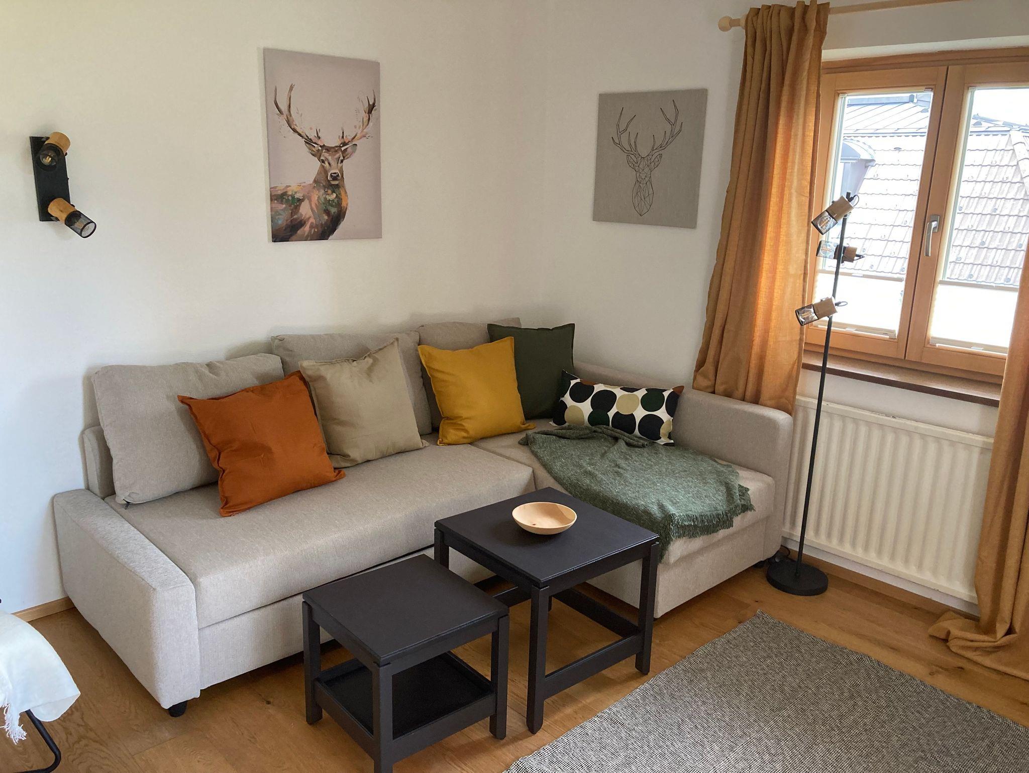 Garderobe, Schlafzimmer mit Doppelbett, Wohnzimmer mit Ausziehcouch, Wohnküche, Bad mit