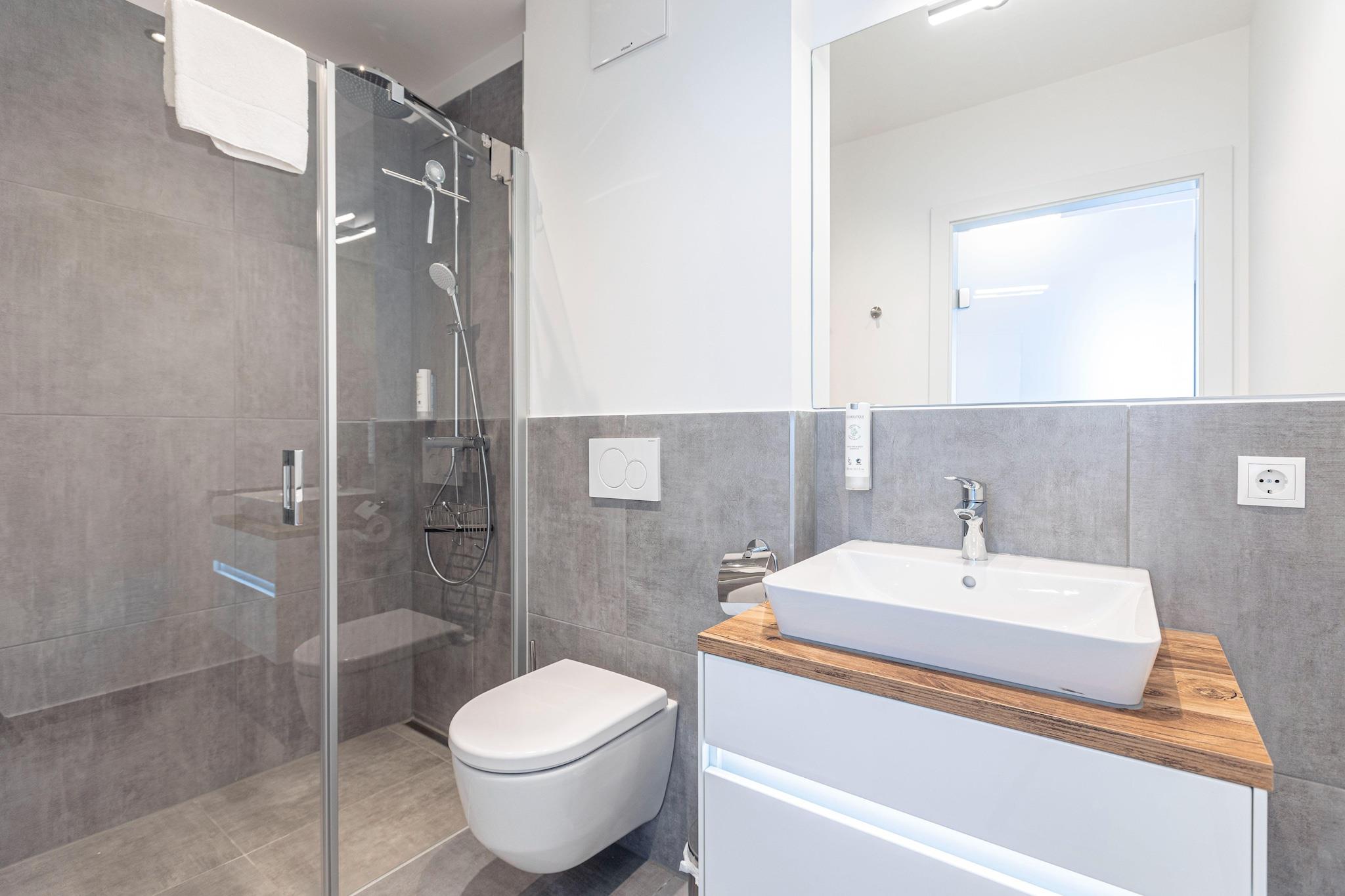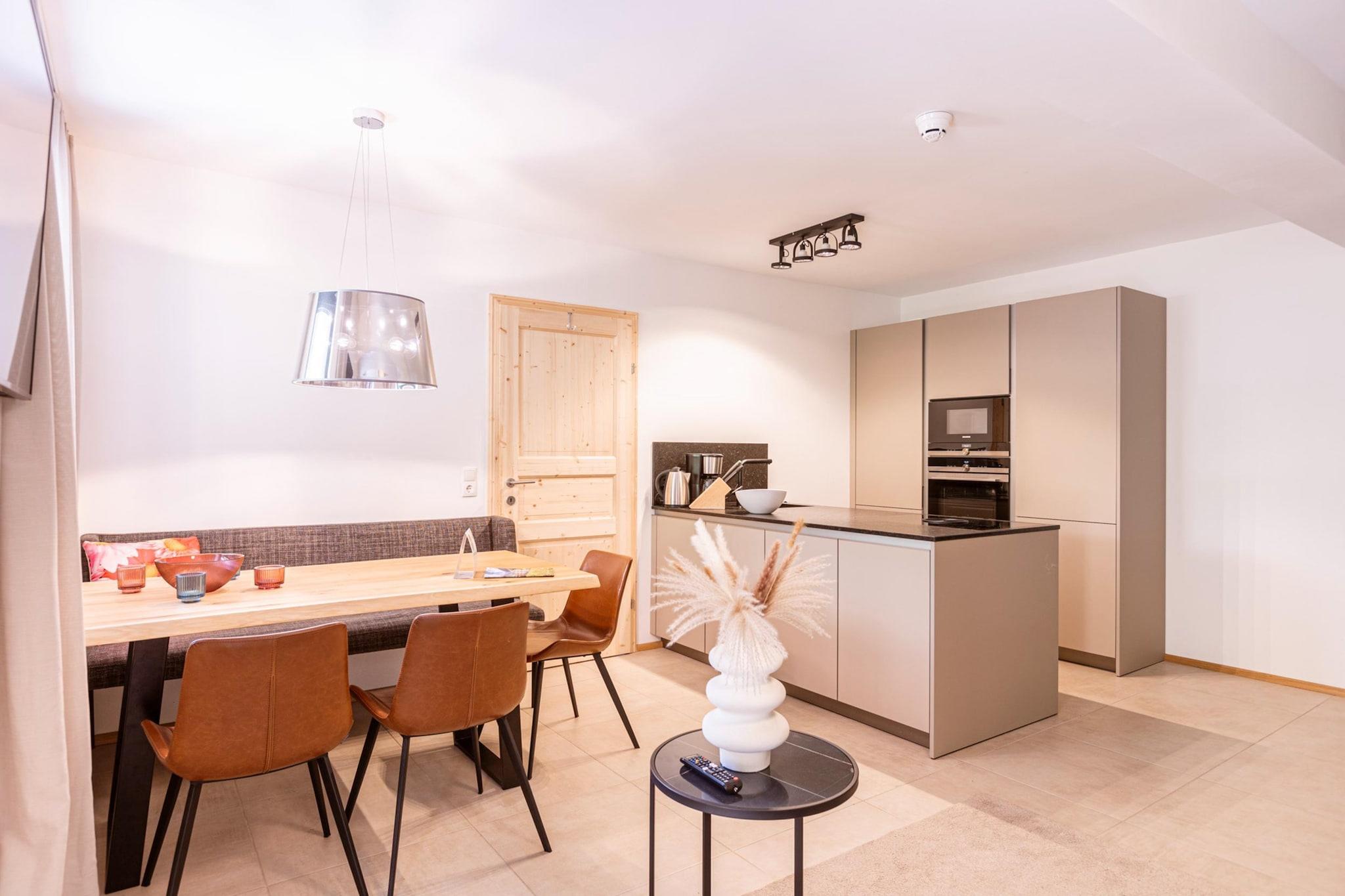 "Upptäck komfort och elegans i vår lägenhet på bottenvåningen, designad för upp till 6 gäster. Denna eleganta tillflyktsort, som sträcker sig över 55 m², erbjuder den perfekta blandningen av moderna bekvämligheter och lugna omgivningar. Lägenheten har två inbjudande sovrum, alla inredda med plyschbox- resårdubbelsängar, vilket garanterar en avkopplande vistelse. Två välutrustade badrum har duschar, toaletter och hårtorkar för din bekvämlighet. Koppla av i det rymliga vardagsrummet med matplats, som har en mysig sittgrupp och en platt-TV. I vardagsrummet finns också en bäddsoffa för 2 personer, perfekt för extra gäster. Gå ut på terrassen från vardagsrummet för att njuta av den friska luften och utsikten. Det fullt utrustade köket är en kulinarisk njutning, komplett med bestick, köksredskap, en keramikhäll, ugn, kyl med frysfack och en diskmaskin. Ytterligare bekvämligheter inkluderar en brödrost, vattenkokare och kaffebryggare. Ett startset med diskmaskinsflikar, diskmedel, en svamp, soppåsar, städmaterial och en kökshandduk tillhandahålls för din ankomst. För gäster som reser med husdjur är hundar välkomna på begäran (extra avgift tillkommer). Njut av gratis Wi-Fi under hela din vistelse. Ytterligare funktioner: - Lugnt läge i utkanten av skogen - Tillgång till en allmän hälsoavdelning med finsk bastu och en uppvärmd infinitypool utomhus - TennengauPLUS-kort ingår för exklusiva lokala rabatter Poolens öppettider: - Vinter (01.10 - 30.04): kl. 16.00 - 19.00 - Sommar (01.05 - 30.09): kl. 10.00 - 18.00