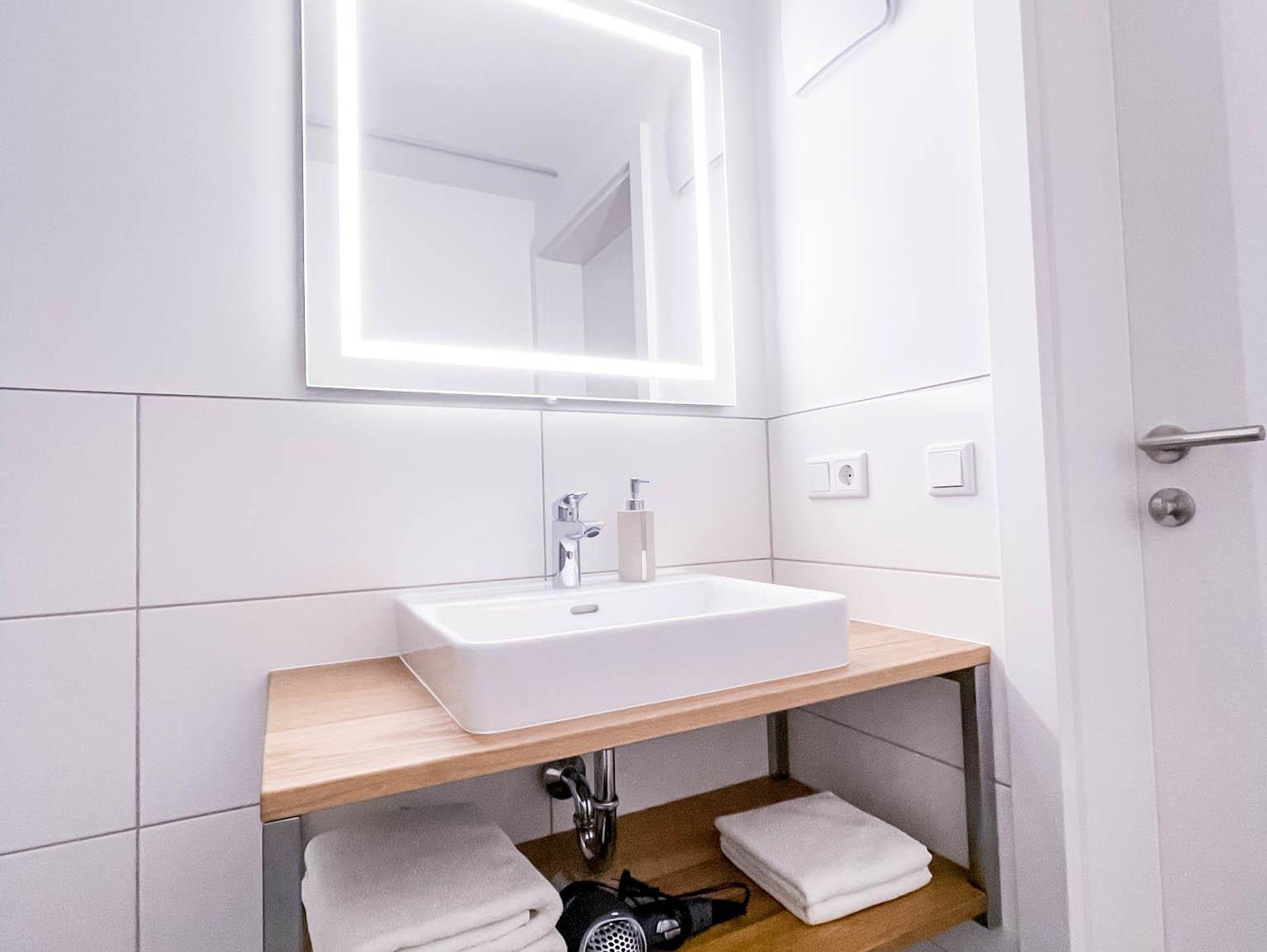 Die Wohnung verfügt über ein Badezimmer mit Dusche und Fön sowie ein separates WC.