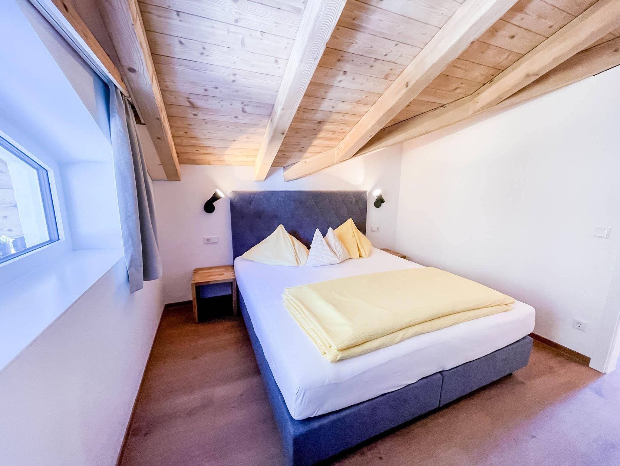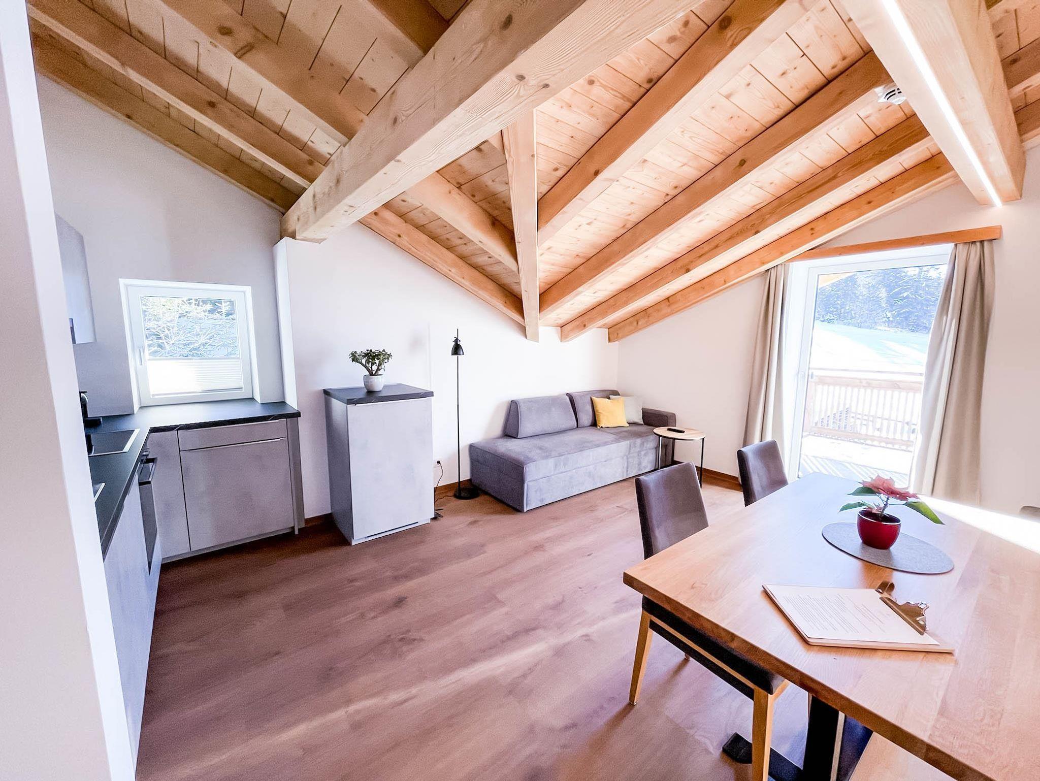 Dieses Appartement der mittleren Kategorie im 2. Stock hat ein besonderes kuscheliges Flair durch den sichtbaren Holzdachstuhl und eine leichte Dachschräge. Der Wohn-Essbereich hat eine Südausrichtung mit Zugang zum wohnungseigenen Balkon. Die Küche ist voll ausgestattet und im Wohnbereich gibt es einen Flat-screen TV.