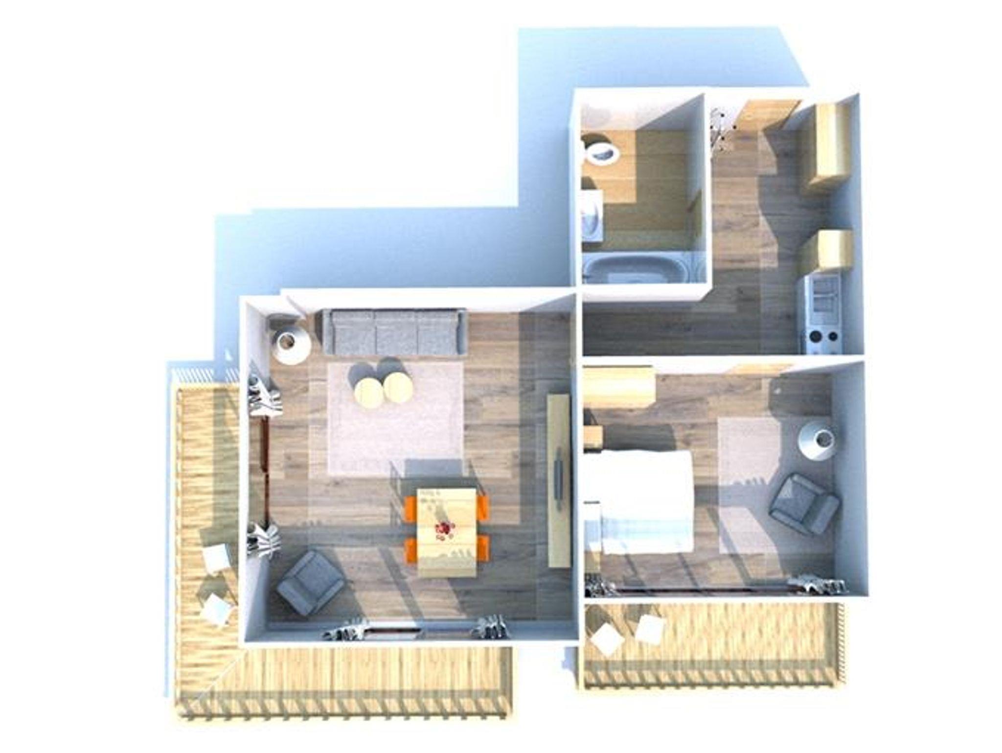 1 Schlafzimmer mit 1 Doppelbett, Wohn-Schlafzimmer mit Essbereich und Küche (Kochplatte, Backofen, Mikrowelle, Kaffeemaschine, Geschirrspüler, Teekocher, Geschirrset, Kühlschrank mit Gefrierfach), TV, Safe, 1 Badezimmer mit Badewanne oder Dusche und WC, Balkon