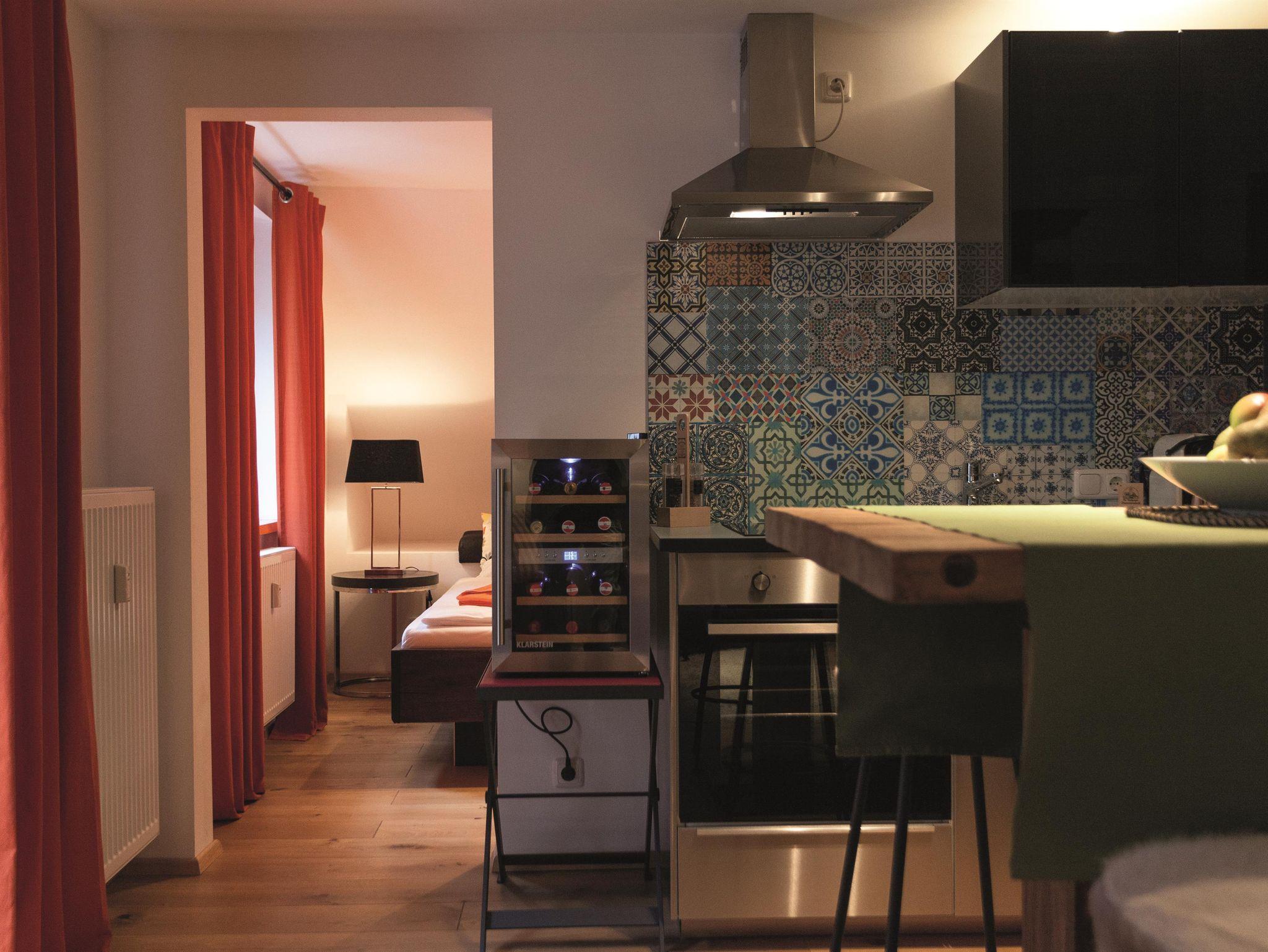 Im 3. Stock bietet das Studio-Apartment 3 auf 35 m² Platz für bis zu vier Personen. Es verfügt über ein Doppelbett und ein Schlafsofa sowie eine kleine Küchenzeile und einen Essbereich. Außerdem gehört ein kleiner Balkon und ein privates Badezimmer zur Ausstattung.