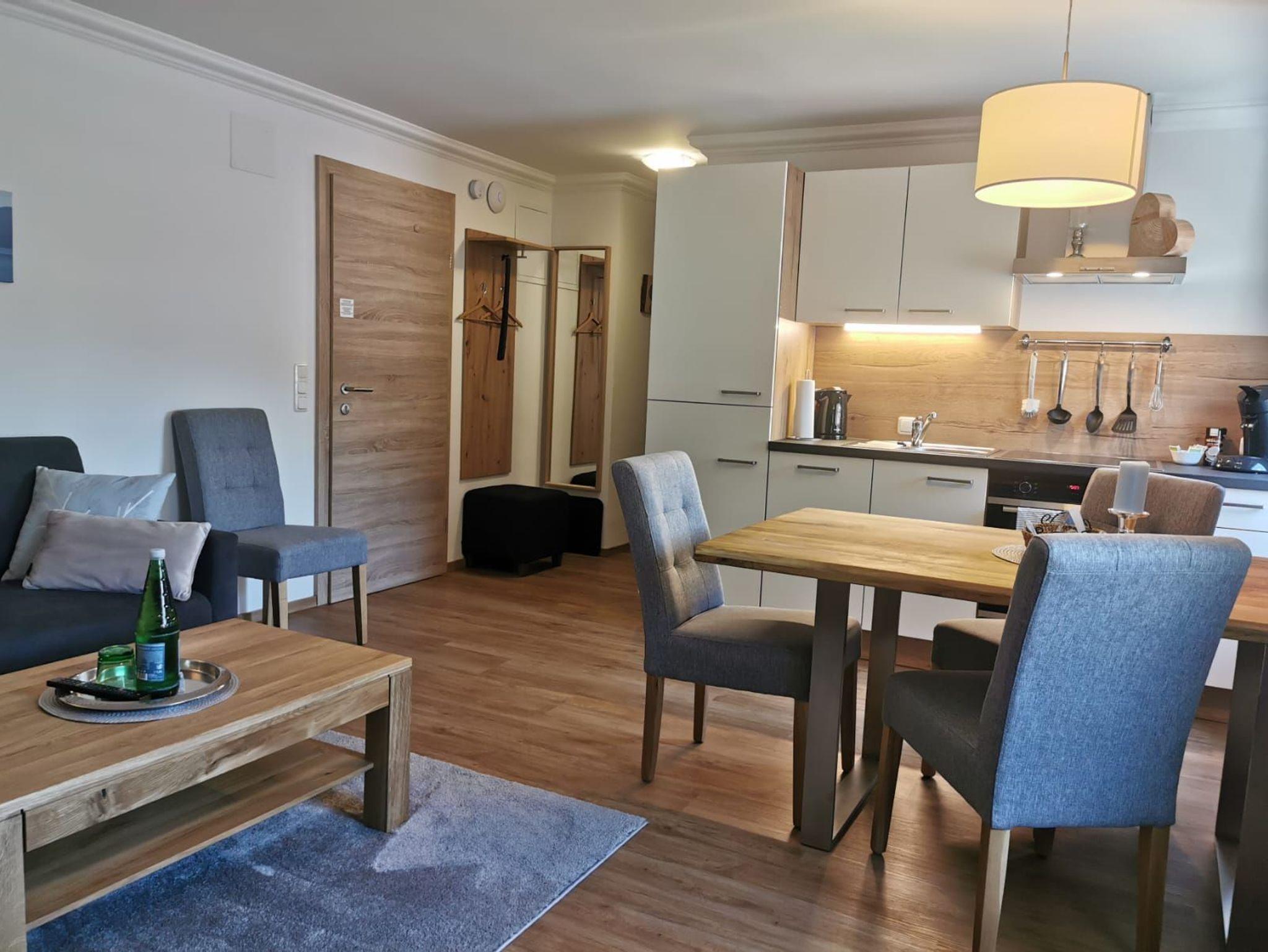 Ihre Unterkunft besteht aus einem Wohnraum mit gemütlicher Sitzecke mit Flat-TV, ausziehbarer Couch und einer Essecke mit Tisch, einer vollständig ausgestatteten Küche mit Herd, Kühl- Gefrierschrank, Kaffeemaschine,