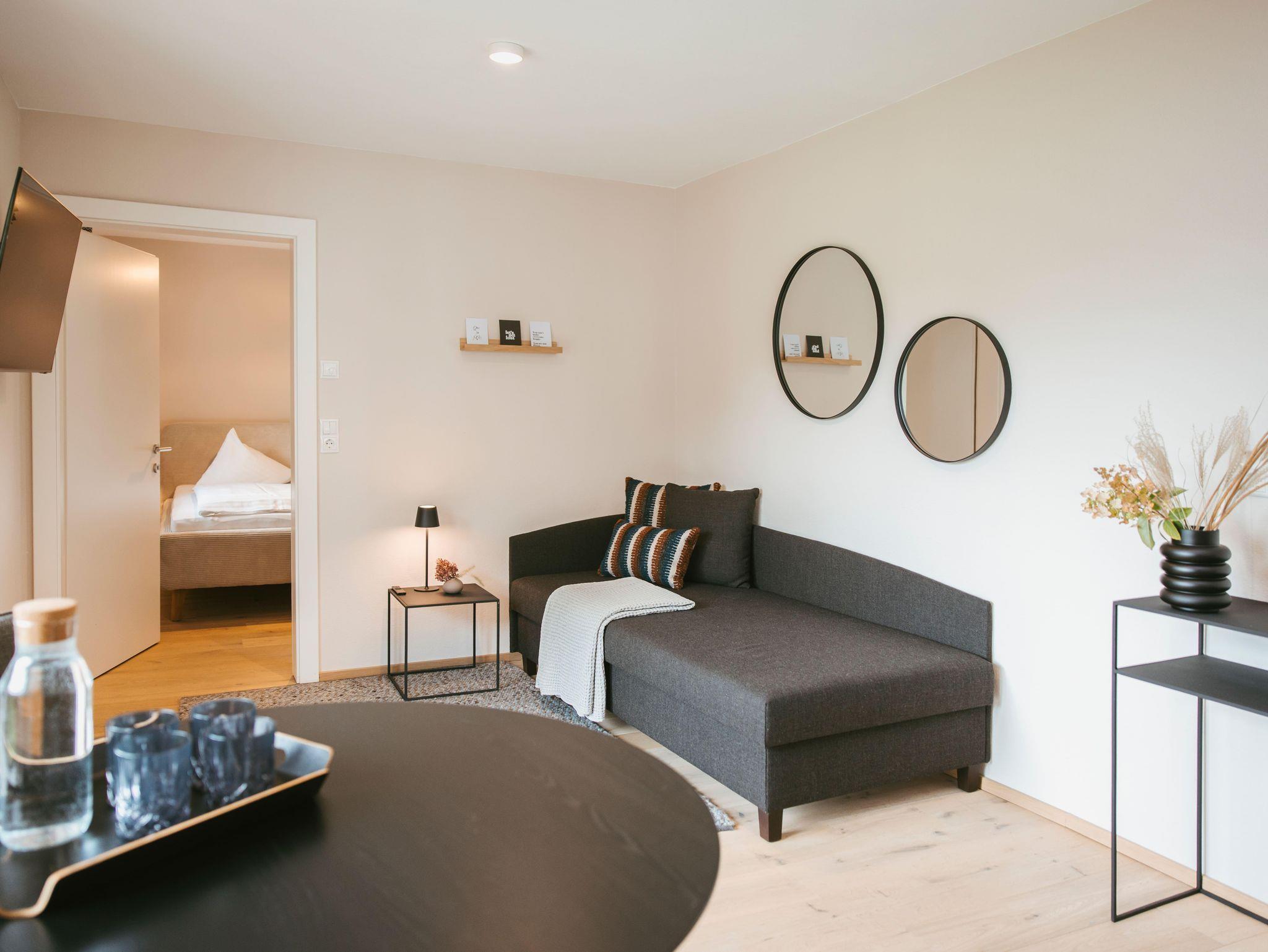 Das Apartment Franz befindet sich im ersten Stock des Nebenhauses und bietet Platz für bis zu drei Personen. Zwei Erwachsene schlafen im separaten Schlafzimmer mit Doppelbett, eine dritte Person auf der gemütlichen Couch im Wohnbereich.