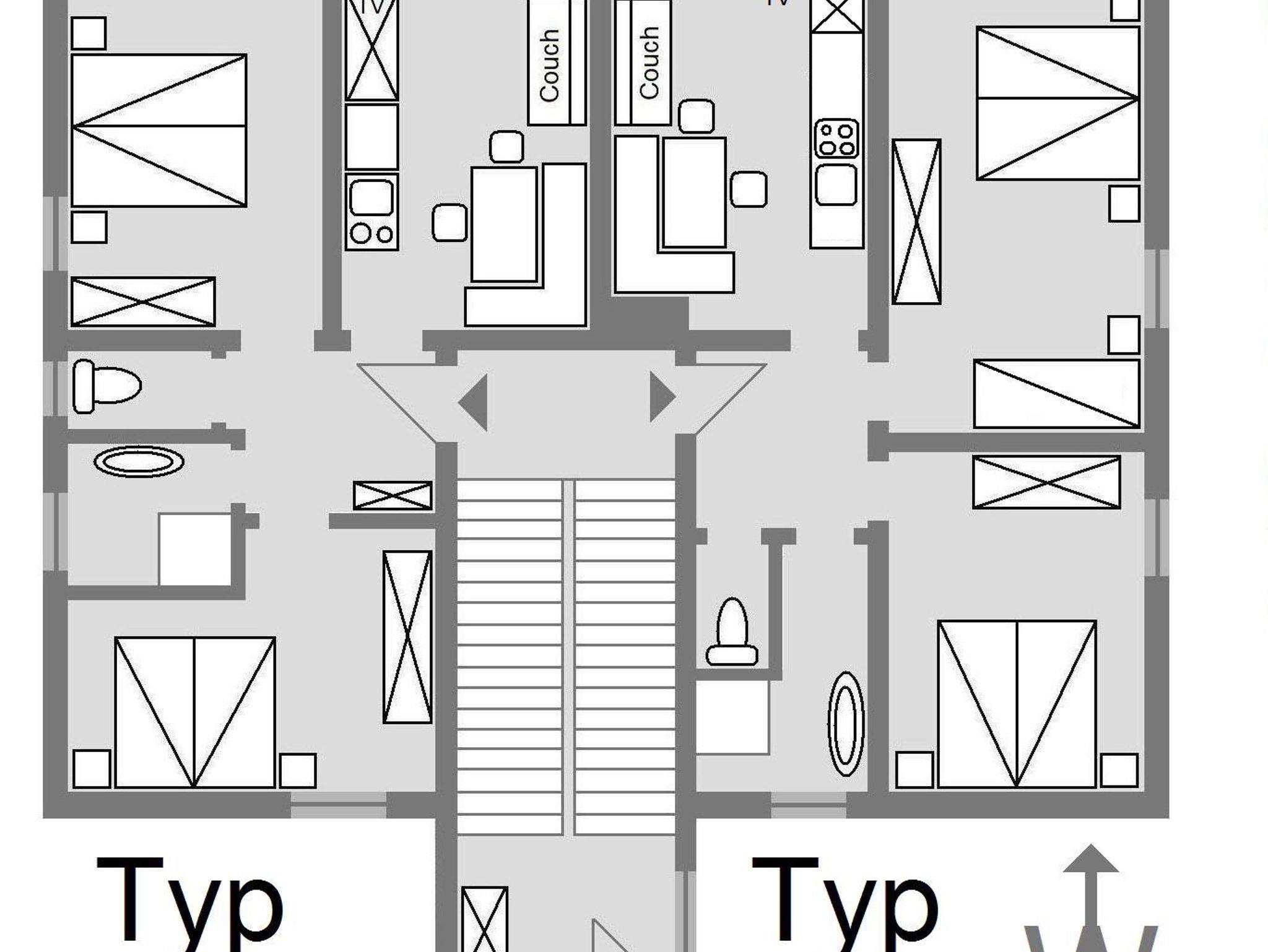 Wir haben 2 Ferienwohnungen Typ A, die ca. 55 m2 groß sind. Wohnung 1 im 1.Stock links und Wohnung 3 mit Dachschrägen im 2.Stock links. Hier besteht die Wohnküche aus einem einfachen Küchenblock mit 2 Herdplatten einer Spüle und Kühlschrank. Ein Sofa mit Essecke und TV runden die Wohnküche ab. Es gibt 2 getrennte Schlafzimmer mit je einem Doppelbett. Ein Zustellbett für eine 5. Person kann in einem der Schlafzimmer aufgestellt werden, ein Gitterbett wie ein Kinderhochstuhl ist in jeder Wohnung vorhanden. Das Badezimmer ist mit Waschbecken und einer Dusche ausgestattet, vom WC getrennt. Von der Wohnküche wie von einem der Schlafzimmer aus, kommen Sie auf den Balkon mit Blick auf den Garten, Liegewiese bzw. Spielplatz des Hauses. In den Wohnungen liegt ein Laminatboden.