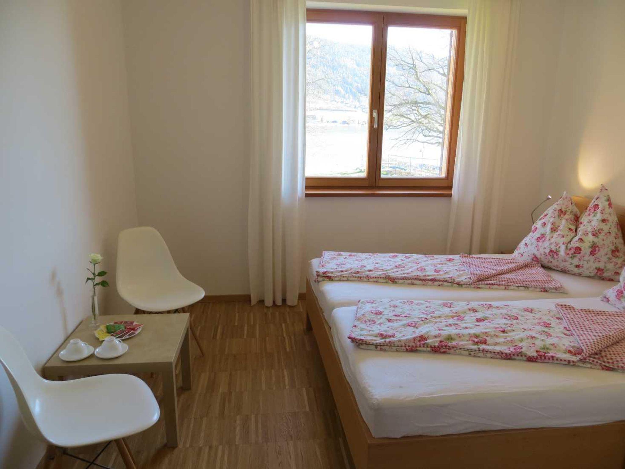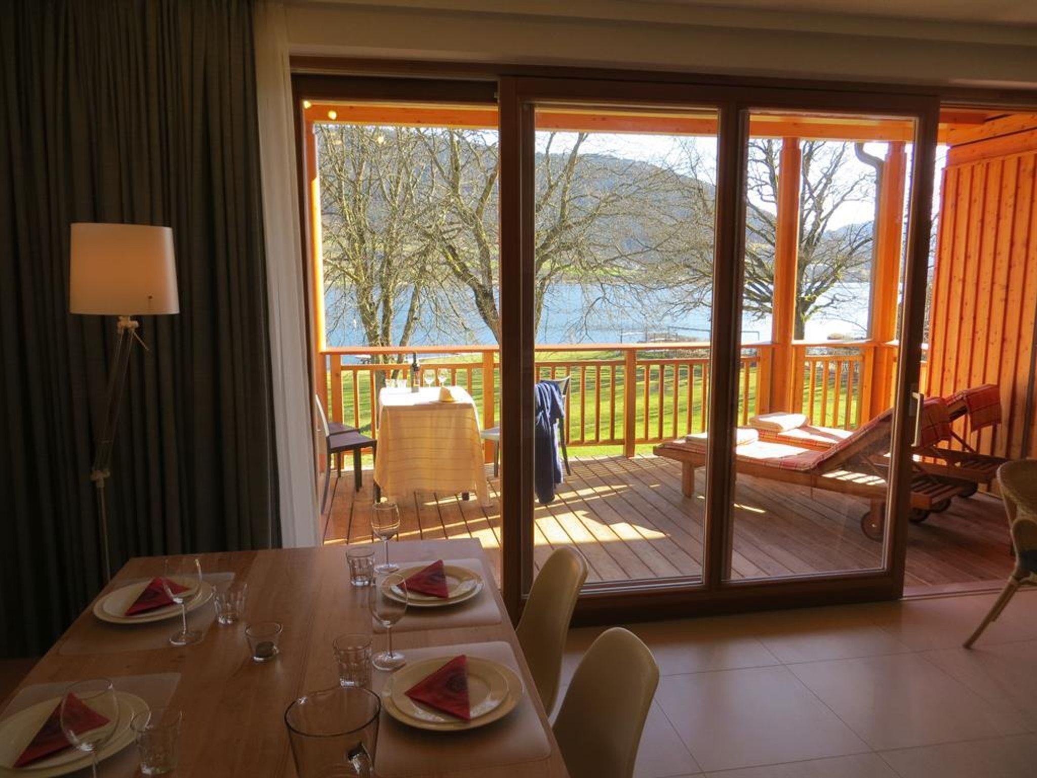 Großer überdachter Wohnbalkon mit Tisch und Liegen, Südlage, direkt am See und Strandbad. Externer Sonnenschutz, 2 Schlafzimmer, großer Wohnraum mit Küche, Geschirrspüler, Backofen, Ceranfeld, Wasserkocher, Kaffeemaschine, gemütlicher Esstisch, geräumiges Badezimmer mit zwei Waschbecken und Föhn, Betten 4 bis 6 Personen.