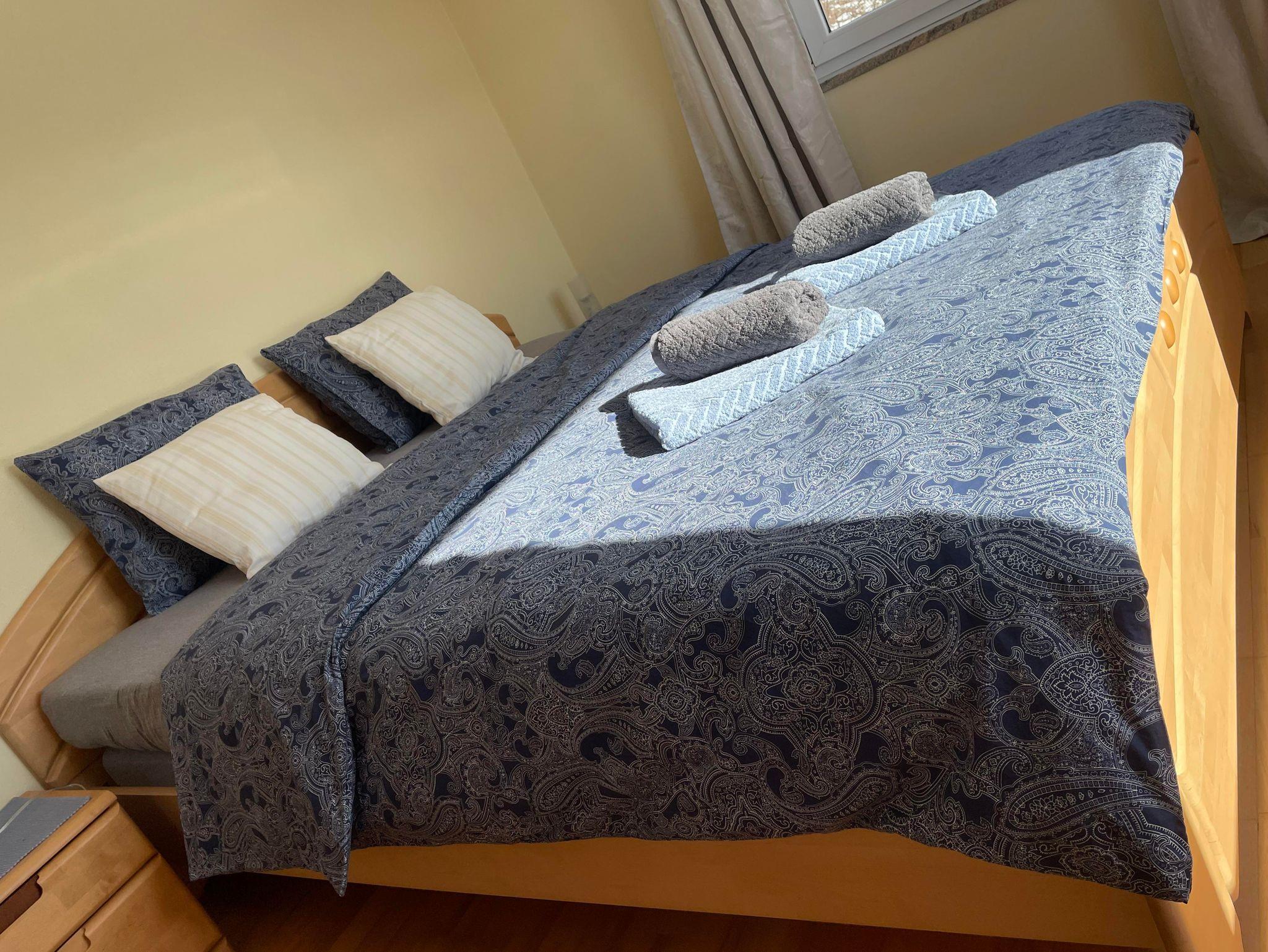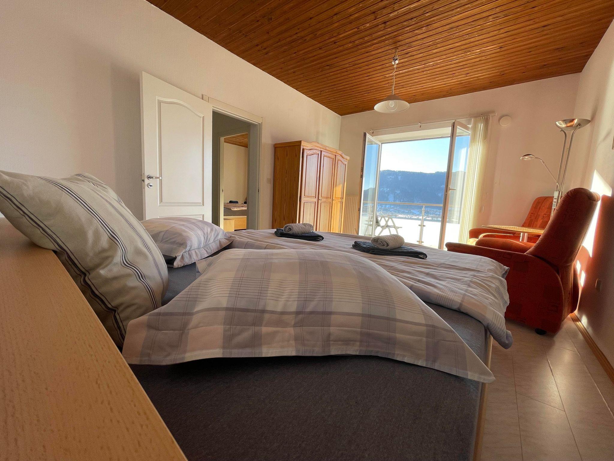 Mit dieser Ferienwohnung stehen Ihnen vier geräumige Schlafzimmer zur Verfügung. Zwei Schlafzimmer befindet sich im 1. Stockwerk, zwei weiteren Schlafzimmer befinden sich im 2. Stockwerk. Im 1. Stockwerk befindet sich das große Bad, sowie eine separate Toilette. Ein weiteres, kleineres Bad mit einer Dusche und WC finden Sie im 2. Stockwerk. Des Weiteren stehen Ihnen neben dem geräumigen Wohn-/Esszimmer ein weiteres Rückzugszimmer zur Verfügung. Im Anschluss an das geräumige Wohn-/Esszimmer finden Sie eine geräumige Terasse mit direktem Gartenzugang.