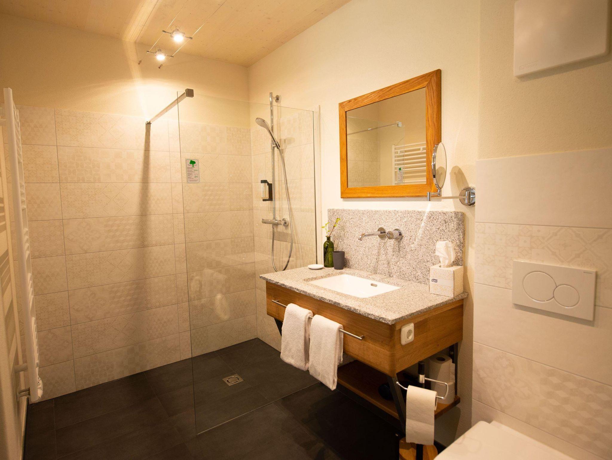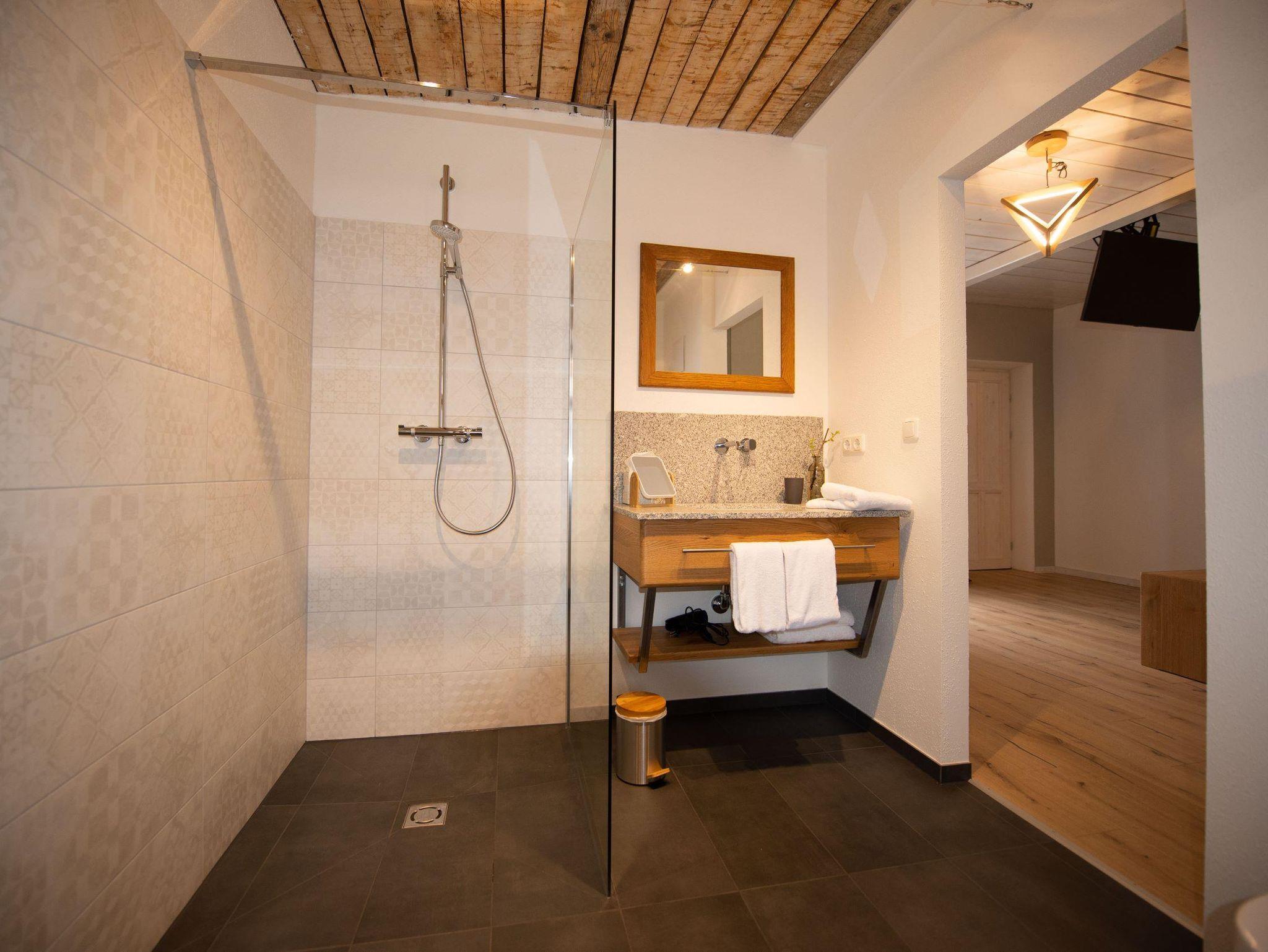 Zusätzlich verfügt das Zimmer über eine eigene Terrasse, auf der Gäste die Natur genießen können. Dort finden sich Sitzmöglichkeiten sowie eine bequeme Liege mit einem Tisch, perfekt für entspannte Momente im Freien. Im Zimmer selbst gibt es zudem einen Fernseher und WLAN-Zugang, um den Gästen Komfort und Unterhaltung zu bieten.