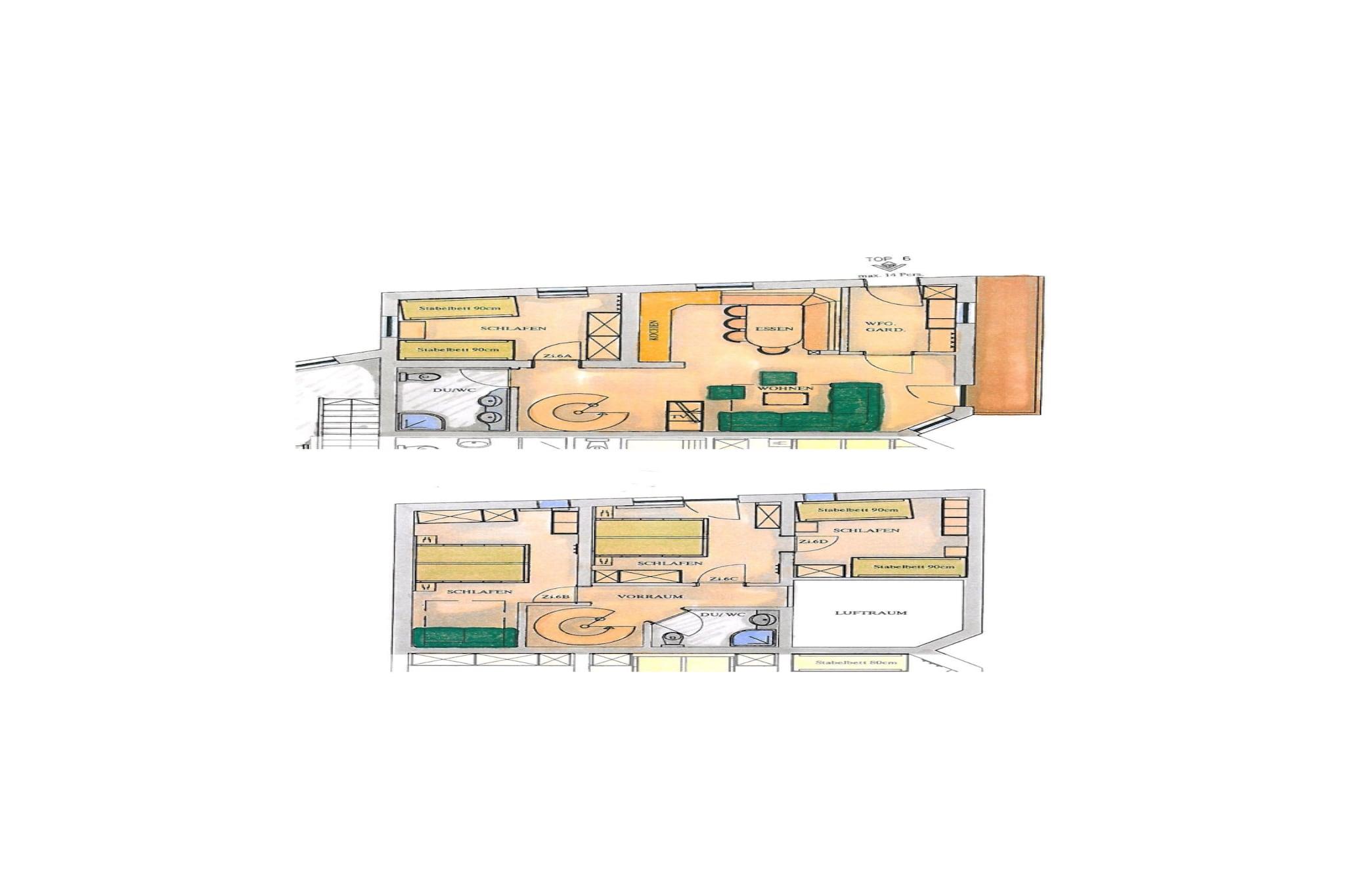 På våning 1: (Entré, Vardagsrum(bäddsoffa, TV, sitthörna), öppet kök(matbord, radio, vattenkokare, spis(Spis med 4 kokplattor, keramisk), kaffebryggare, ugn, mikrovågsugn, diskmaskin, kylskåp(+ frys)), sovrum(enkelsäng, enkelsäng), badrum(dusch, toalett ), balkong, terrass) Vindsvåning: (sovrum(dubbelsäng), sovrum(dubbelsäng, bäddsoffa), Anslutande sovrum(enkelsäng, enkelsäng), badrum(dusch, toalett )) skidförvaring(delas med andra gäster ), torktumlare(delas med andra gäster , betalt), tvättmaskin(delas med andra gäster , betalt), parkering, parkering, parkering, parkering, swimmingpool(delas med andra gäster )