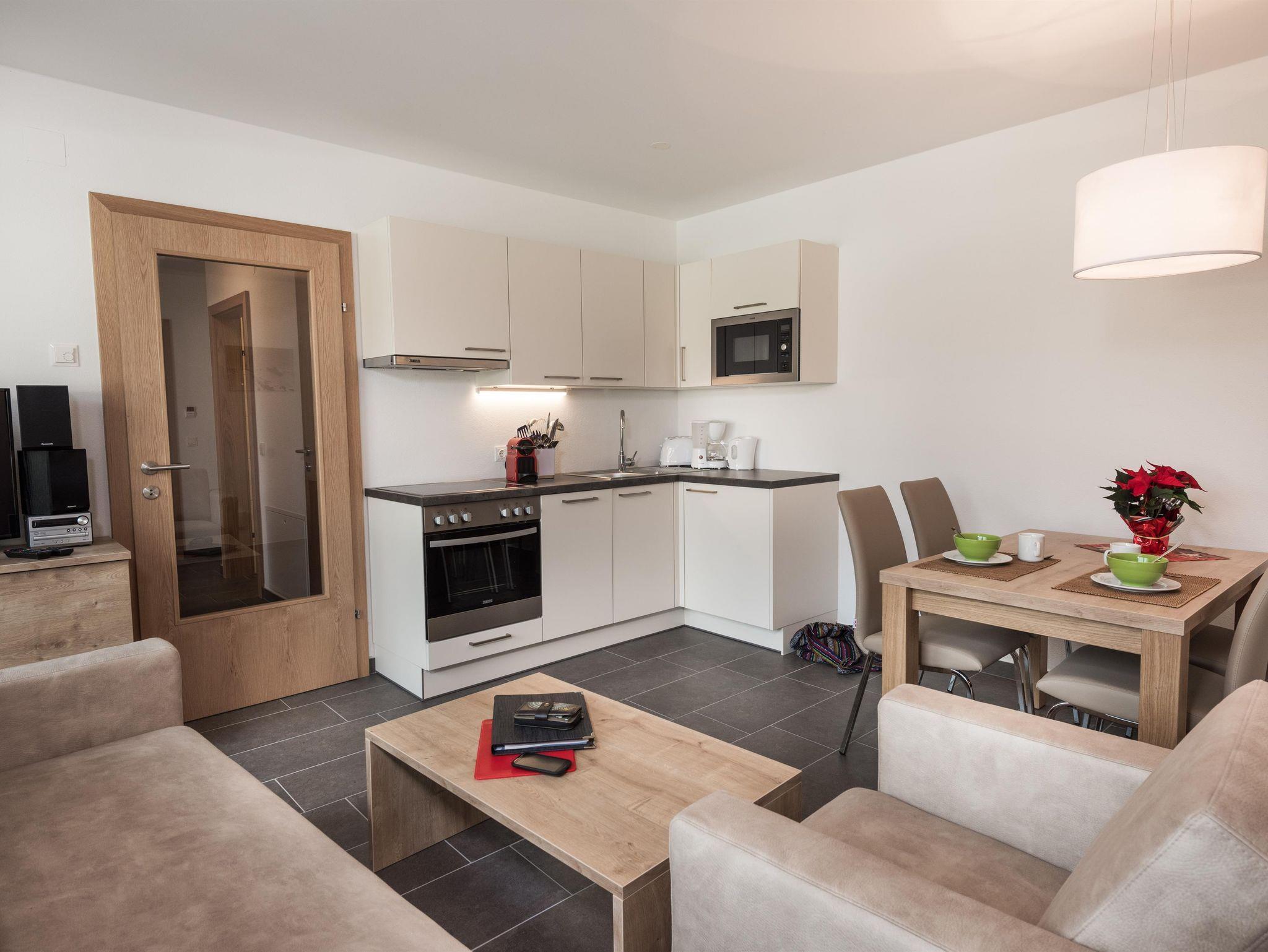 **** Niveau für 2–4 Personen, Wohnraum mit 40 m² im 2. Stock, 1 Schlafzimmer (Doppelbett, Kleiderschrank, Vorraum mit Garderobe, 1 Bad, Hochwertige großzügige Einbauküche (im Wohnbereich integriert, LCD Fernseher, Musikanlage, Kostenloses W-LAN, Balkon oder Terrasse, Bettwäsche und Handtücher inklusive