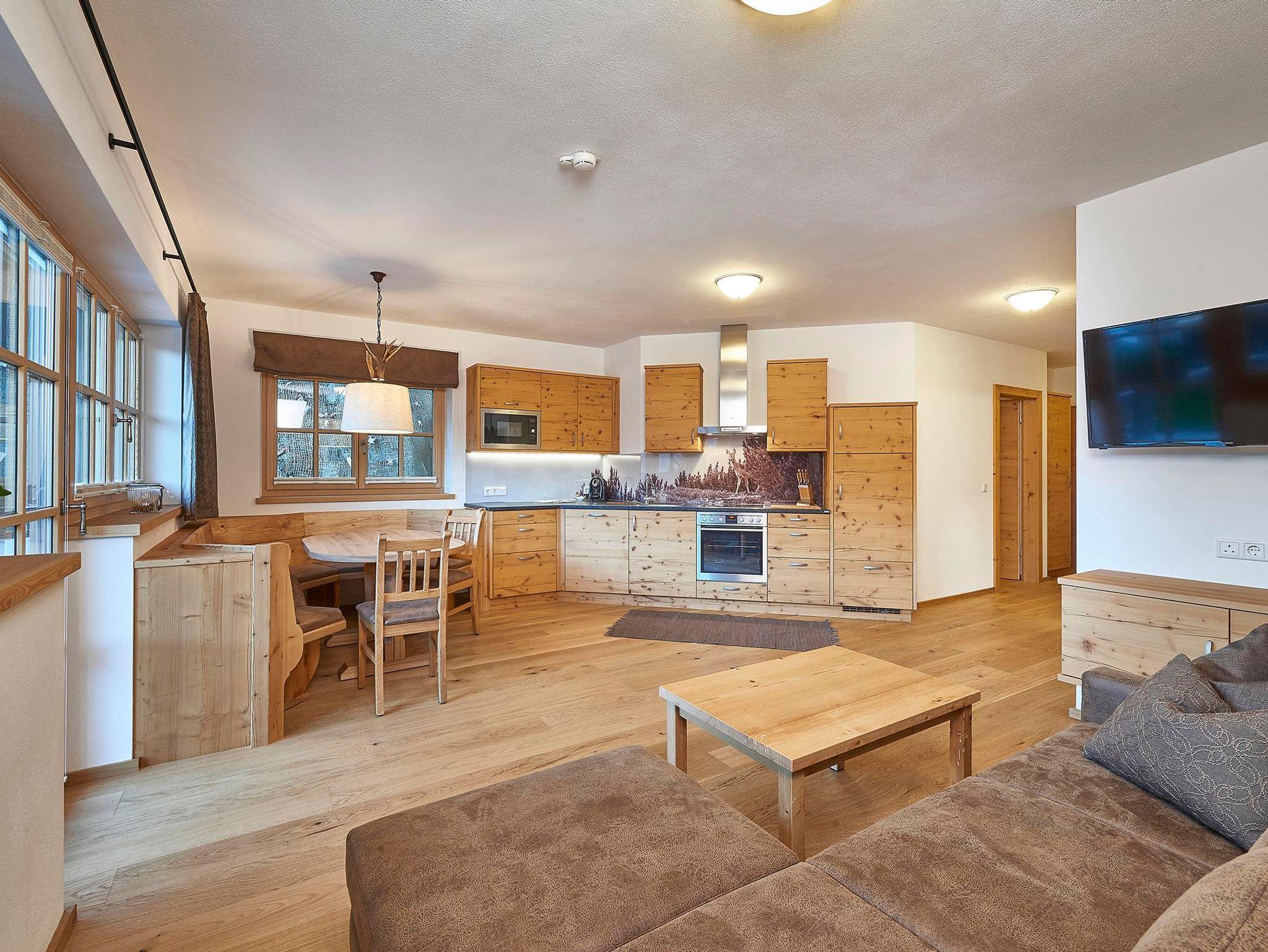 • Vollwertige Kücheneinrichtung (Ceran-Kochfeld, Mikrowelle, Geschirrspüler, Teller, Besteck, usw.)