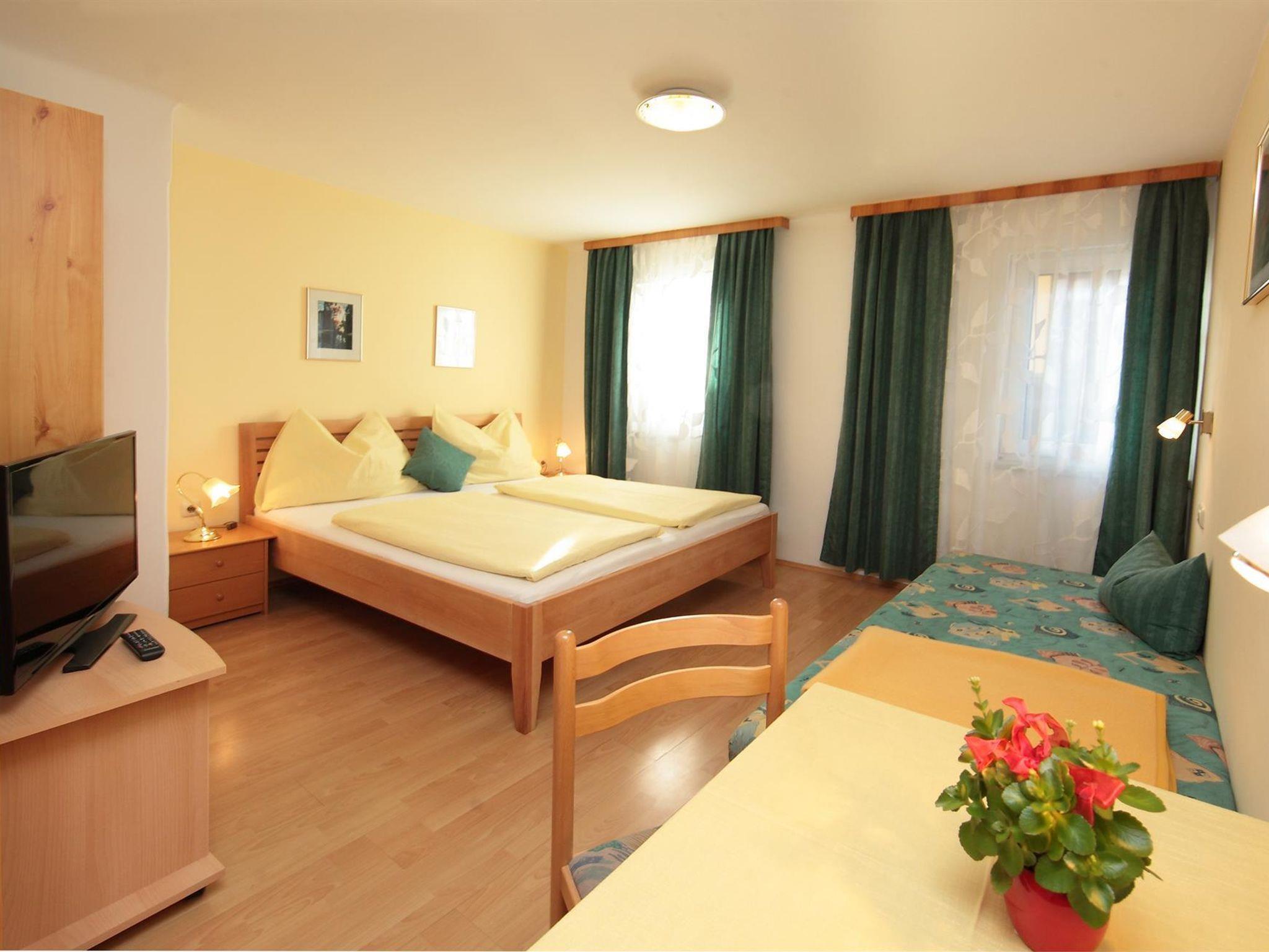 Gemütliches Dreibettzimmer mit Doppelbett und Einzelbett in ruhiger Lage. Das Zimmer ist ausgestattet mit DU/WC, Haarföhn, kostenloses WLan und HD-Flachbildfernseher.