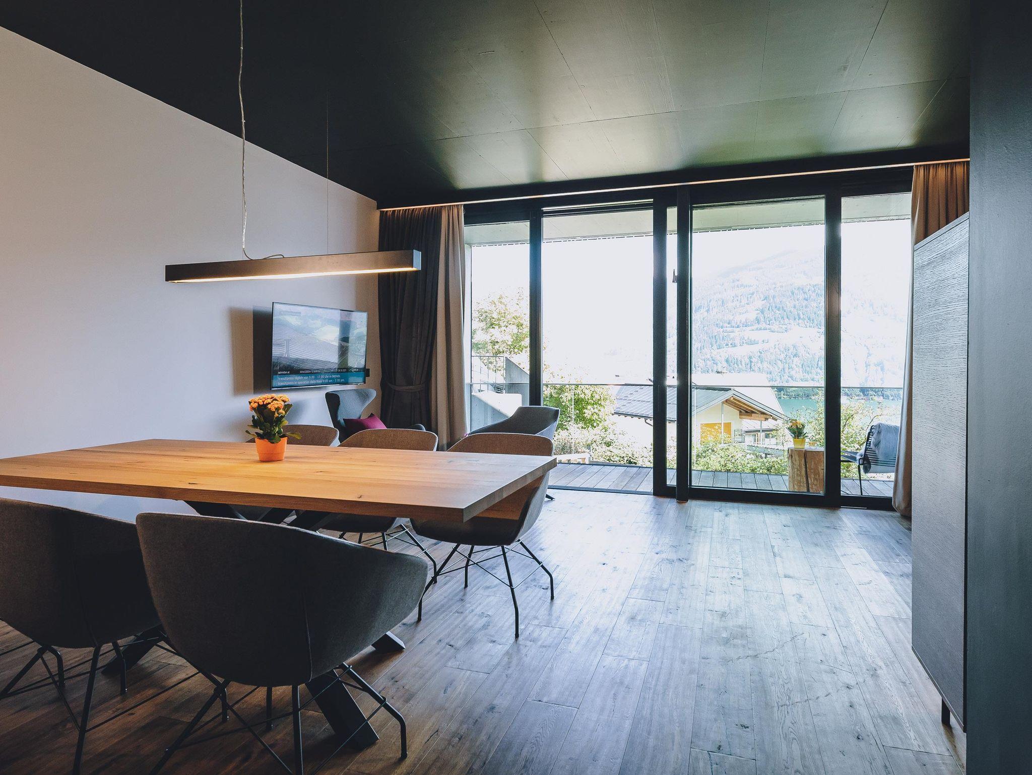 Der Balkon ist möbliert, bietet einen traumhaften Bergblick und lädt zum Verweilen ein.