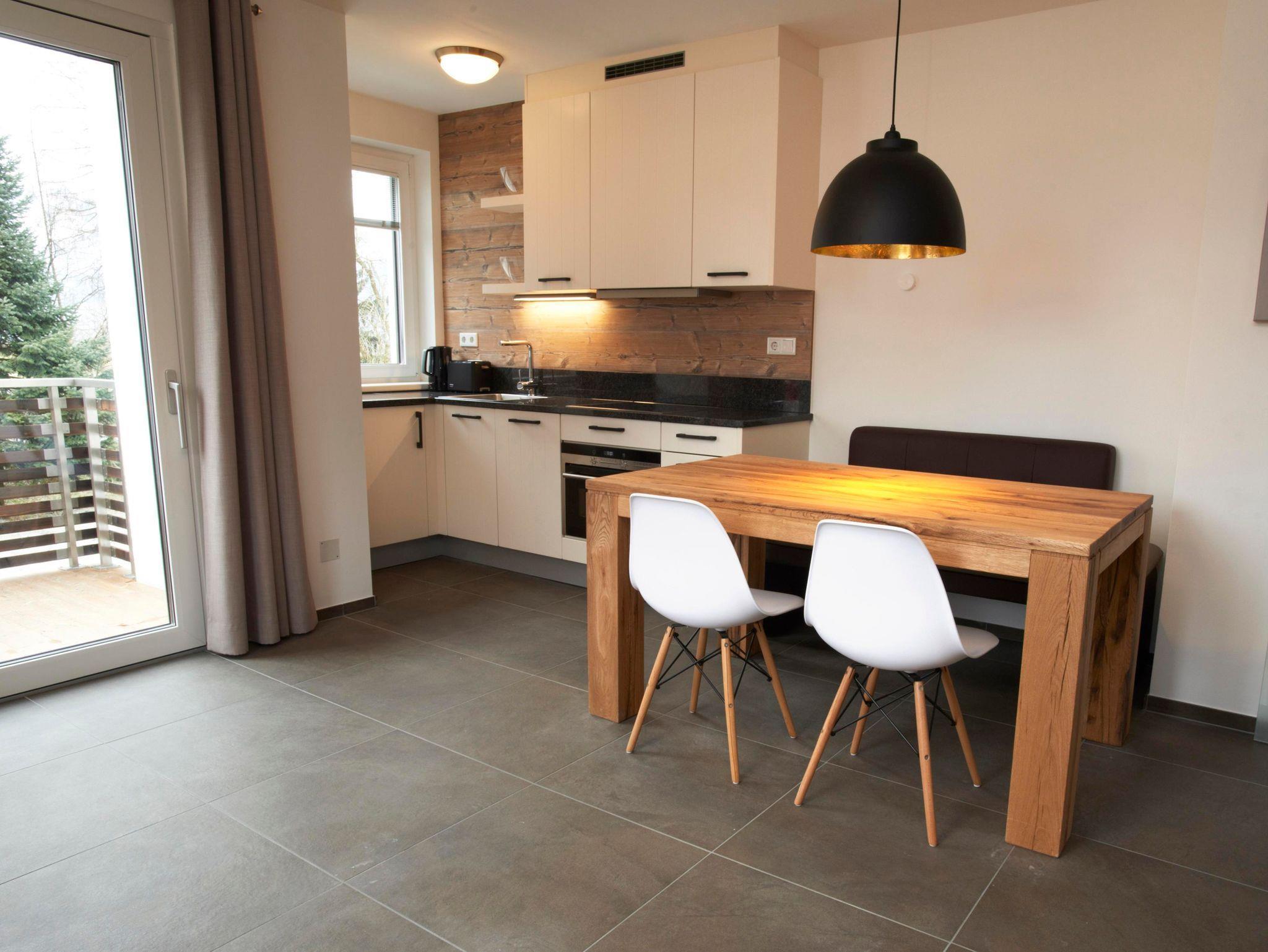 Das Apartment verfügt über ein Schlafzimmer mit Doppelbett sowie zwei Badezimmer. Im gemütlichen Wohnraum gibt es eine Sitzecke, einen Esstisch und eine offene, voll ausgestattete Küche. Über das Wohnzimmer erreicht man den Balkon mit Sitzgelegenheit.