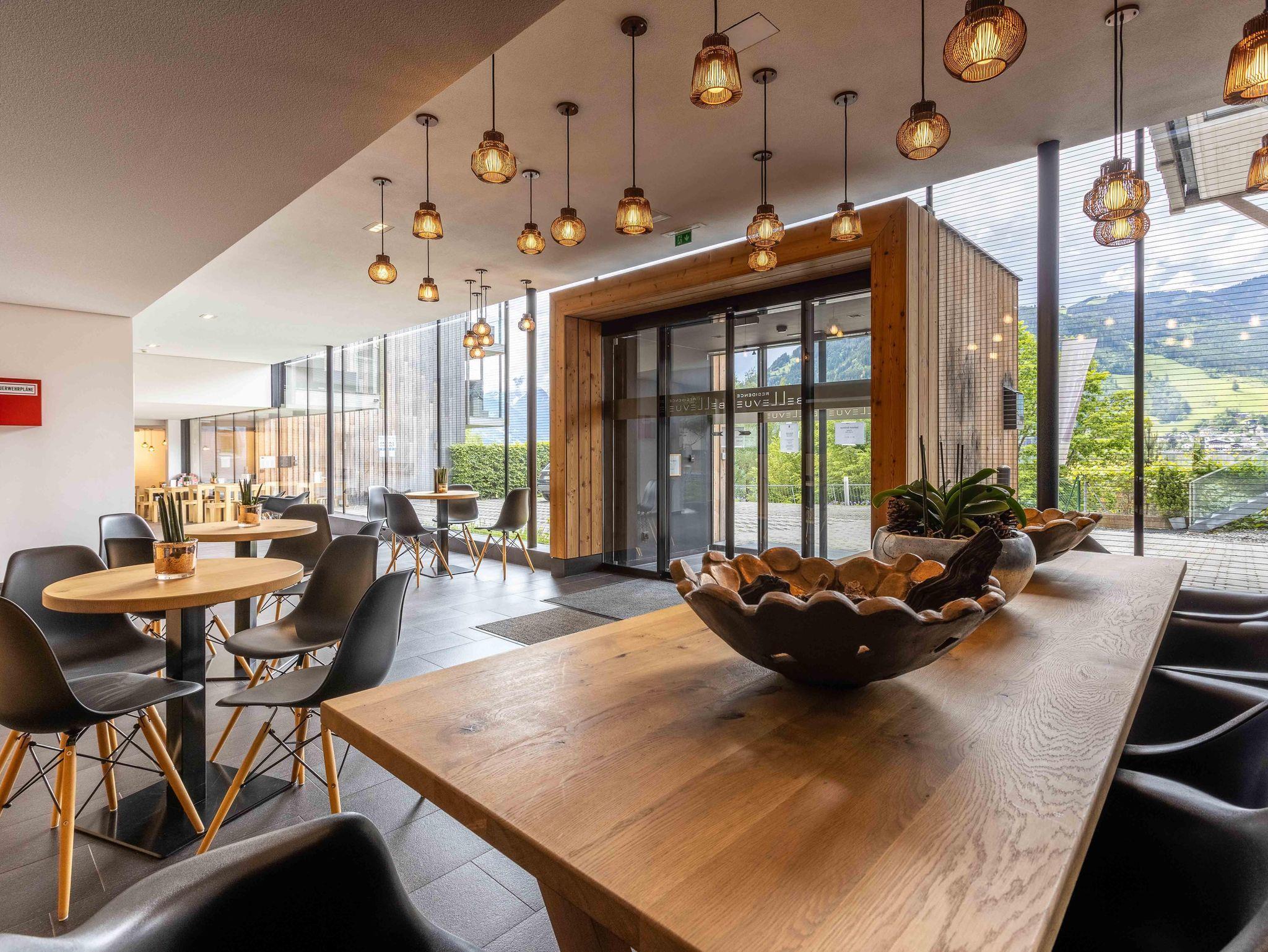Herzlich willkommen in den Bellevue Residences! Wir bieten geräumige Appartements und Suiten mit jeweils zwei Schlafzimmern, Balkon und/oder Terrasse. Das Highlight ist der atemberaubende Blick auf den See und die umliegenden Berge. Hochwertige Materialien, stilvolles Design und großzügige Räume laden zum Verweilen ein. Zwei Saunen, ein eigener Parkplatz, ein beheizter Skikeller und eine Waschküche sind ebenfalls vorhanden. Außerdem bieten wir unseren Gästen eine geräumige, voll ausgestattete Küche und kostenloses WLAN. Freue dich auf einen unvergesslichen Aufenthalt in den Bellevue Residences!