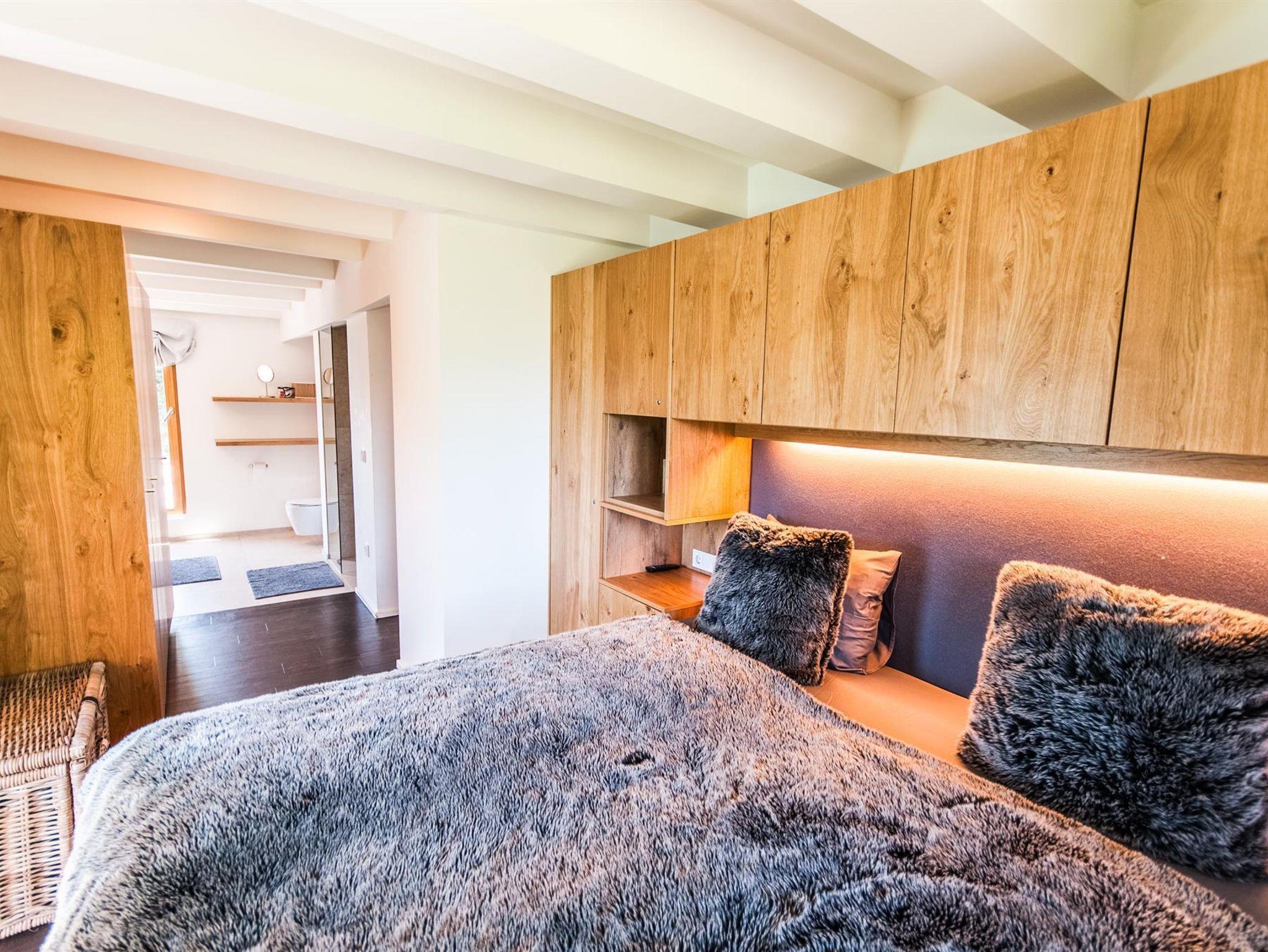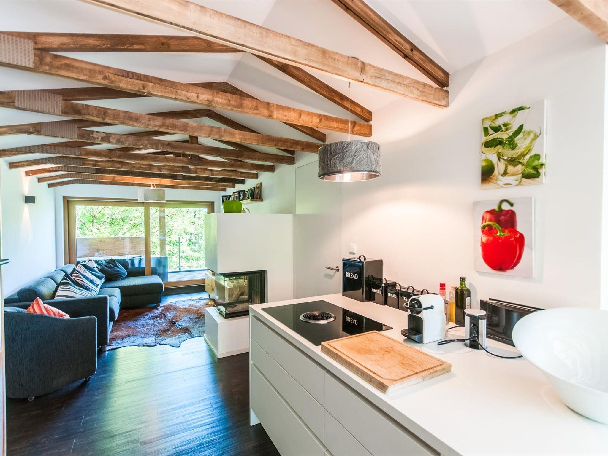 Im 2. OG: 1 Schlafzimmer, Küche mit Esstisch für 12 Personen & Wohnbereich mit Kamin. Vom Wohnzimmer geht es direkt auf die beheizte Sonnenterrasse mit Loungemöbeln.