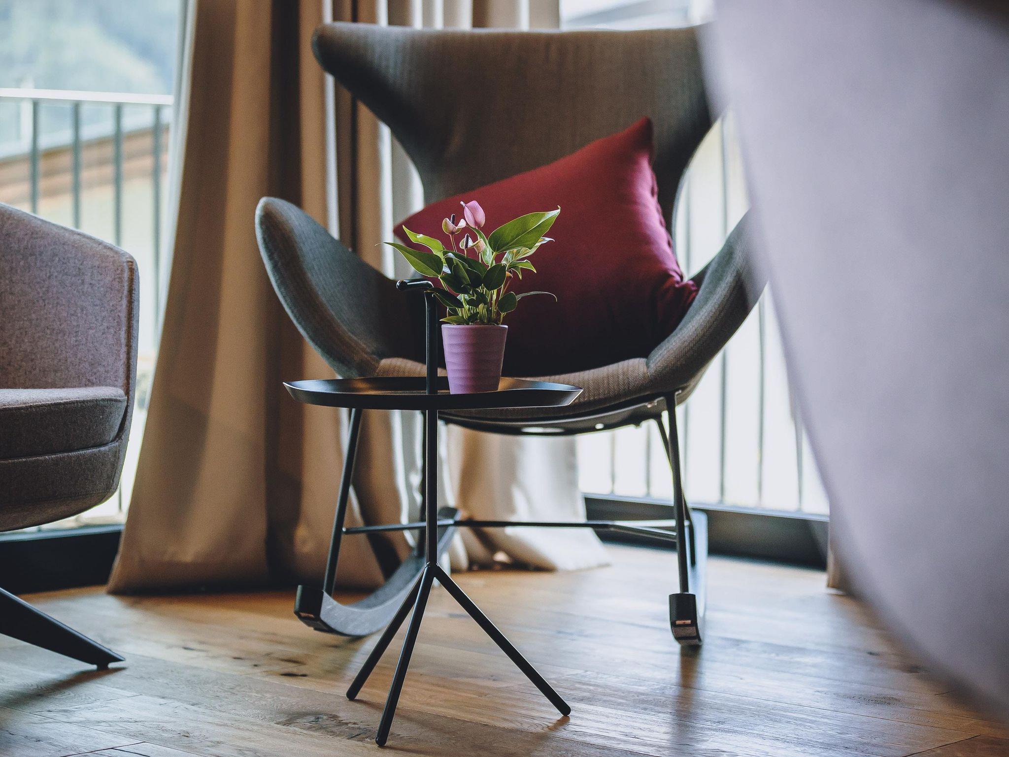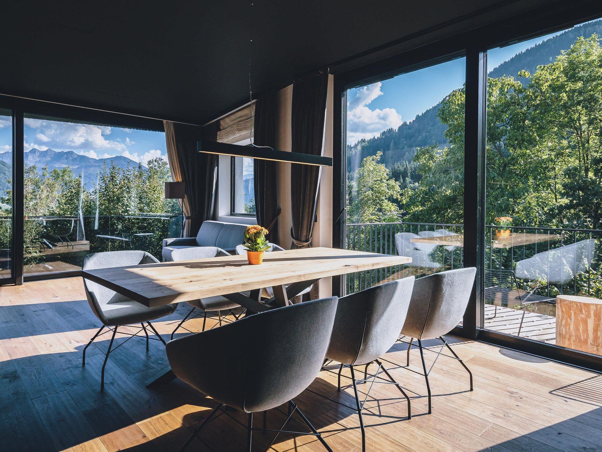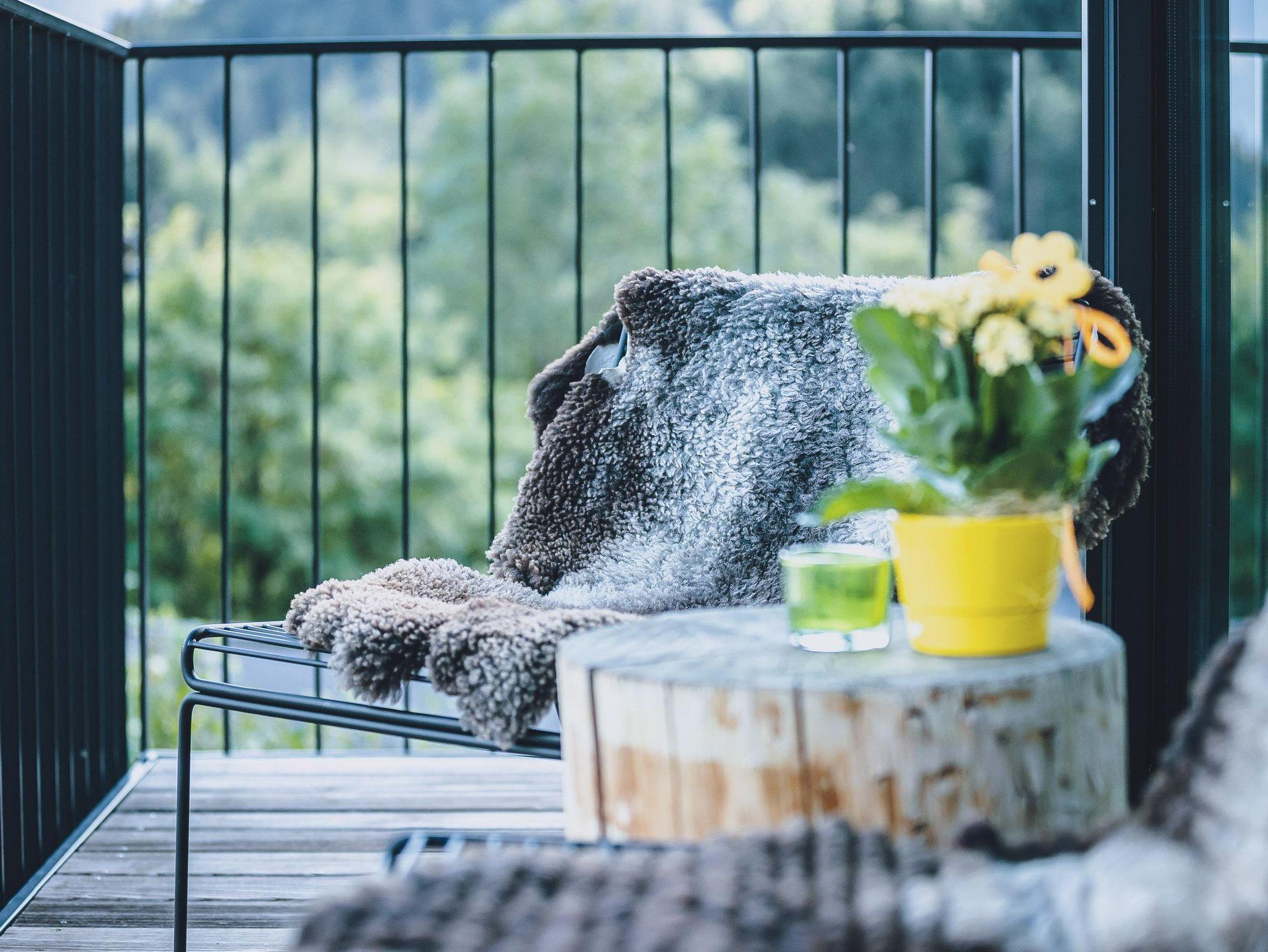 Der Balkon ist möbliert, bietet einen traumhaften Bergblick und lädt zum Verweilen ein.