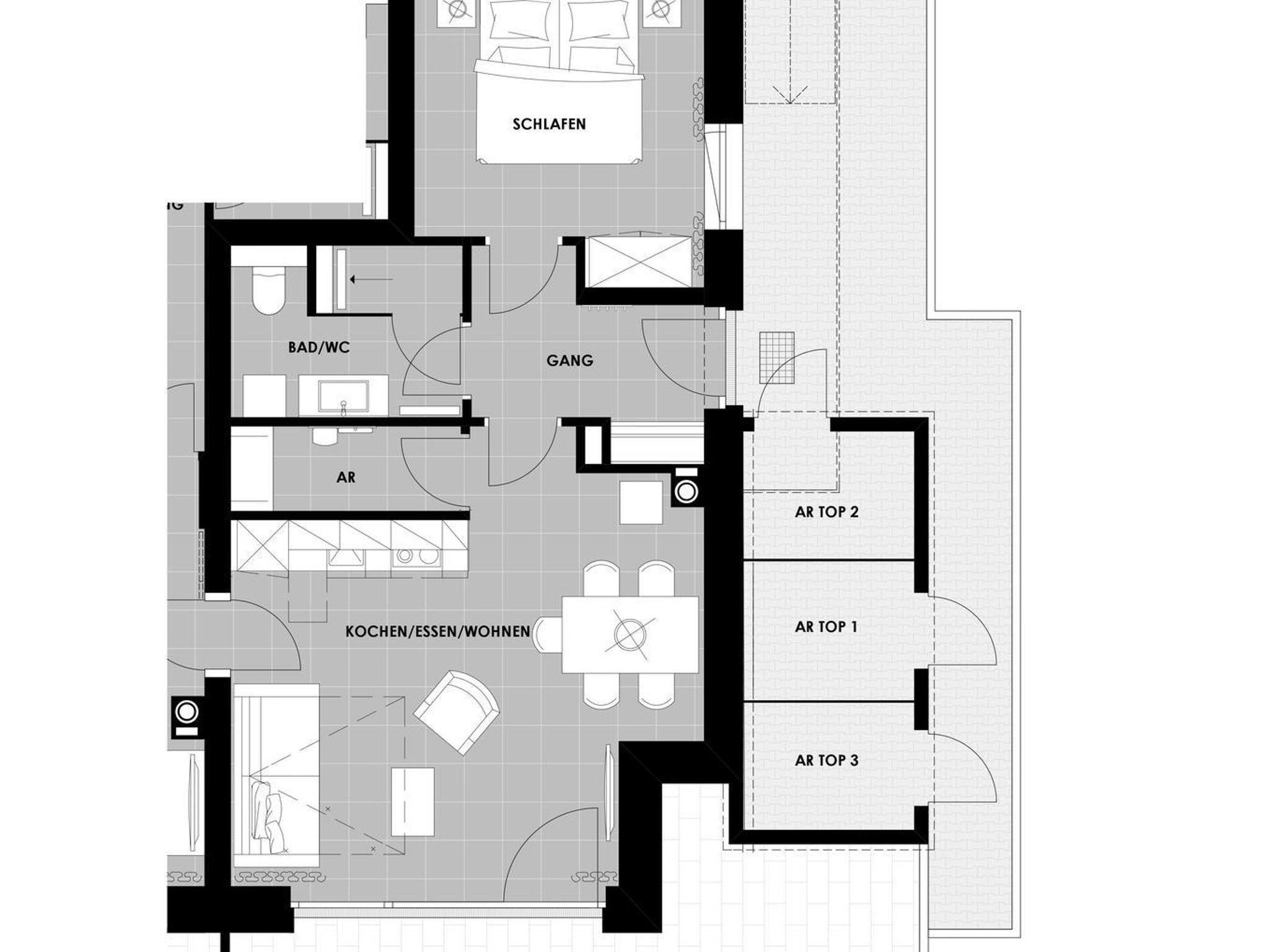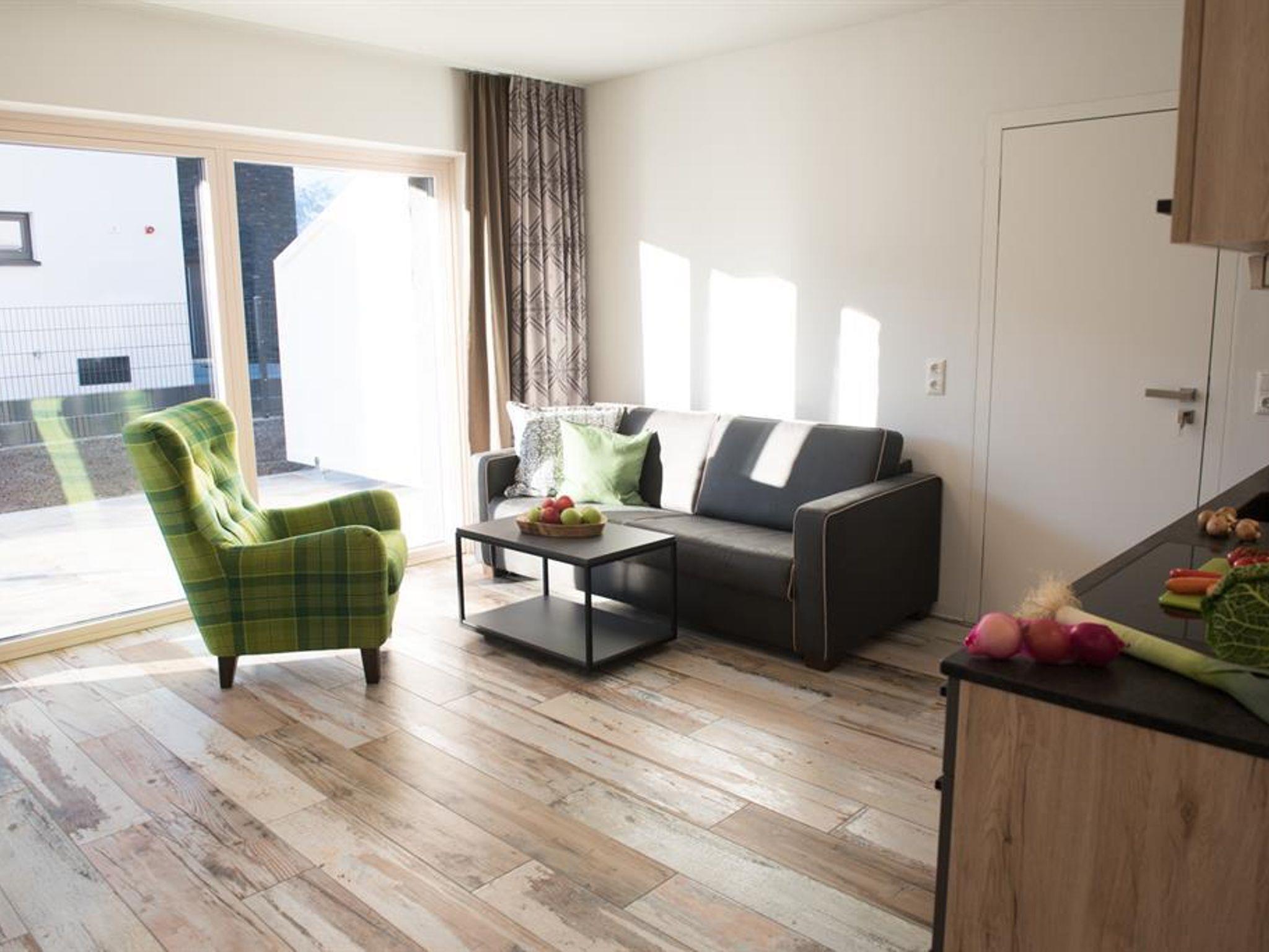 Das modern-rustikal eingerichtete Appartement besteht aus einem Schlafzimmer (1 x Doppelbett), einem Bad mit Dusche und WC, großer Wohn- und Kochbereich mit einer ausziehbaren Schlafcouch, die mit einem Handgriff in ein vollwertiges Doppelbett für 2 Personen umfunktioniert werden kann, Abstellraum und Flur.