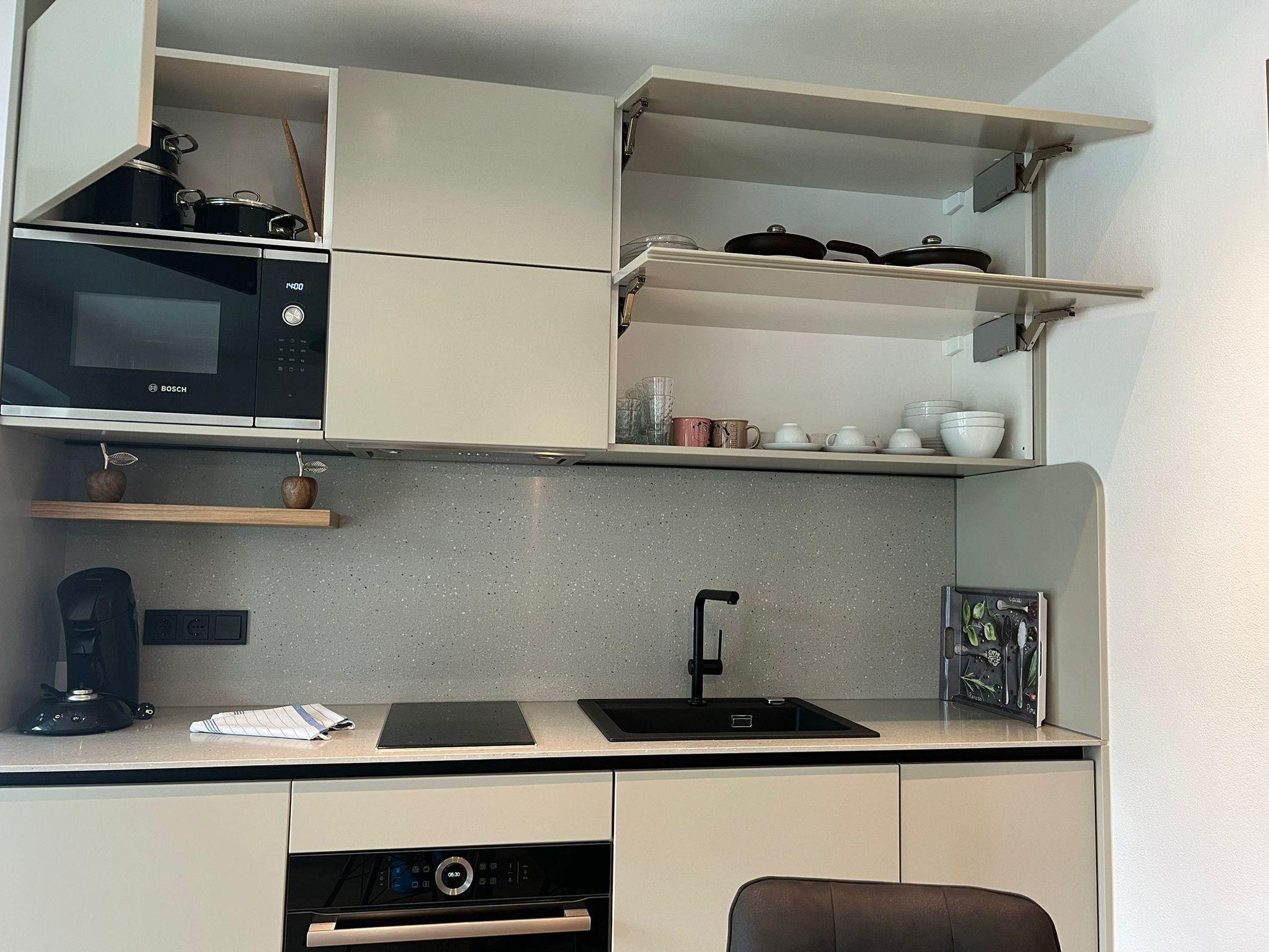 • Küche: Voll ausgestattete Küche mit modernen Geräten (Herd, Backofen, Mikrowelle, Kühlschrank, Geschirrspüler), Essbereich für vier Personen.