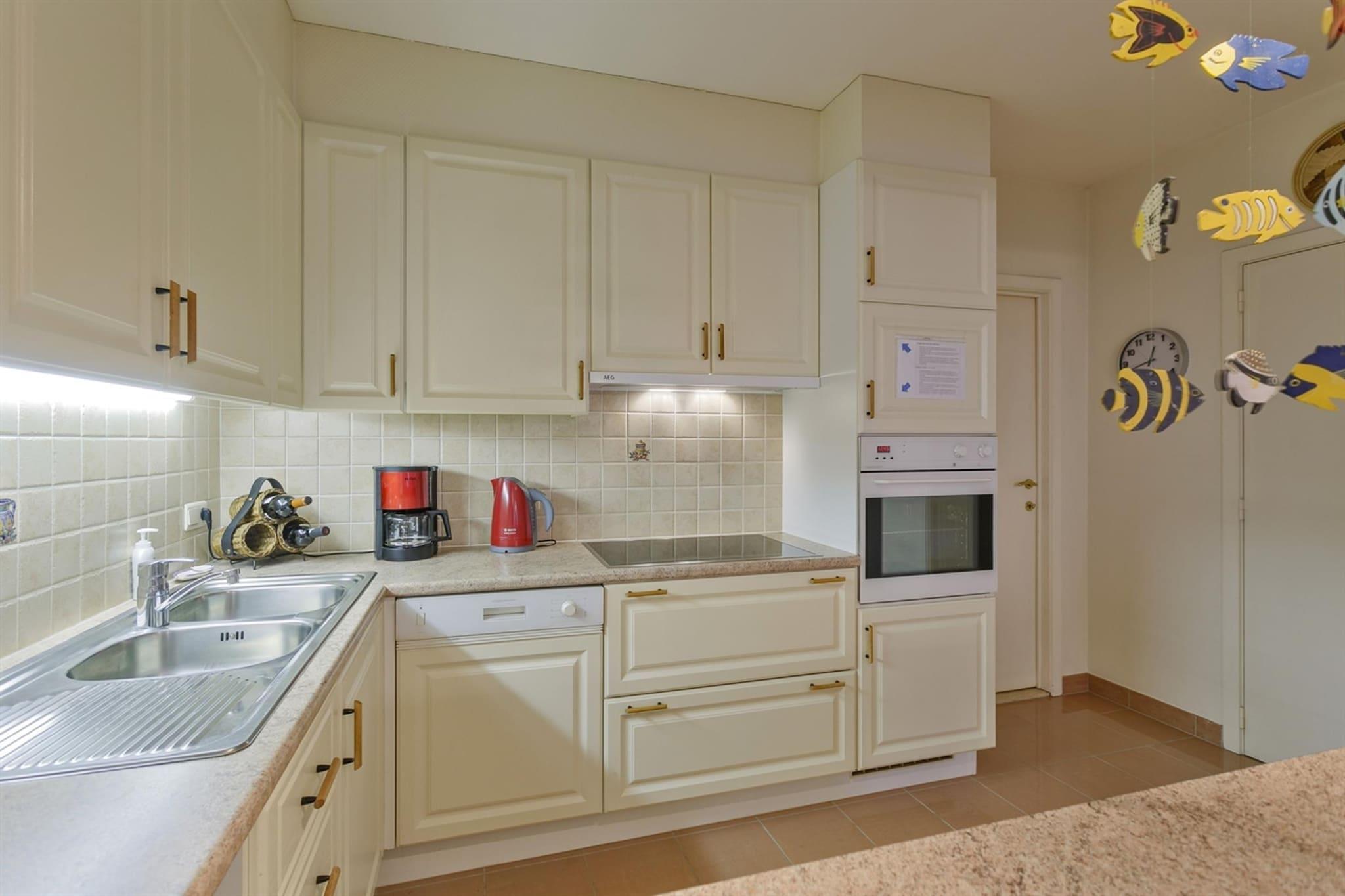 Denna rymliga och soliga lägenhet med två sovrum är idealiskt belägen nära centrum och bara några steg från havet. Det ljusa vardagsrummet har en bekväm hörnsoffa, ett matbord för sex personer och en platt-TV med digitalkanaler. Härifrån går du in på den trevliga terrassen, perfekt för att varva ner med uteplatsstolar. Det första sovrummet har en dubbelsäng, medan det andra sovrummet har två enkelsängar, med en extra madrass tillgänglig för extra komfort. Husdjur är inte tillåtna, vilket säkerställer en ren och allergenfri miljö. Ett cykelskjul finns tillgängligt för den som vill utforska omgivningarna på två hjul. Blankenberge erbjuder en perfekt blandning av historia, kultur och rekreation. På Belle Epoque Centrum kan du lära dig om stadens uppgång som en chic badort med utställningar om arkitektur, mode och konst. Utforska det historiska huset Majutte, det äldsta fiskarhuset på den belgiska kusten, eller besök SEA LIFE för att se över 2 500 havsdjur. Njut av natursköna vyer från Belgiens pir eller Oosterstaketsel, perfekt för fotografering och fiske. Hamnfestivalen och Paravang-festerna hyllar stadens maritima traditioner och Belle Époque-arv. För avkoppling kan du varva ner på Riant d"Eau Wellness eller Bloso Blankenberges bastuanläggning. Vattensportsentusiaster kan besöka O"Neil Beachclub, medan sportälskare kan njuta av tennis, padel eller petanque på Tennis Club. Glöm inte en rolig kväll med bowling på Bowl Inn! Lägenheten är designad för bekvämlighet och har ett fullt utrustat kök med moderna apparater, vilket garanterar problemfri måltidsberedning. Badrummet har ett badkar, dubbla handfat och toalett för extra komfort. Ett förråd med tvättmaskin och torktumlare erbjuder extra bekvämlighet, vilket gör denna lägenhet till ett välutrustat hem hemifrån.