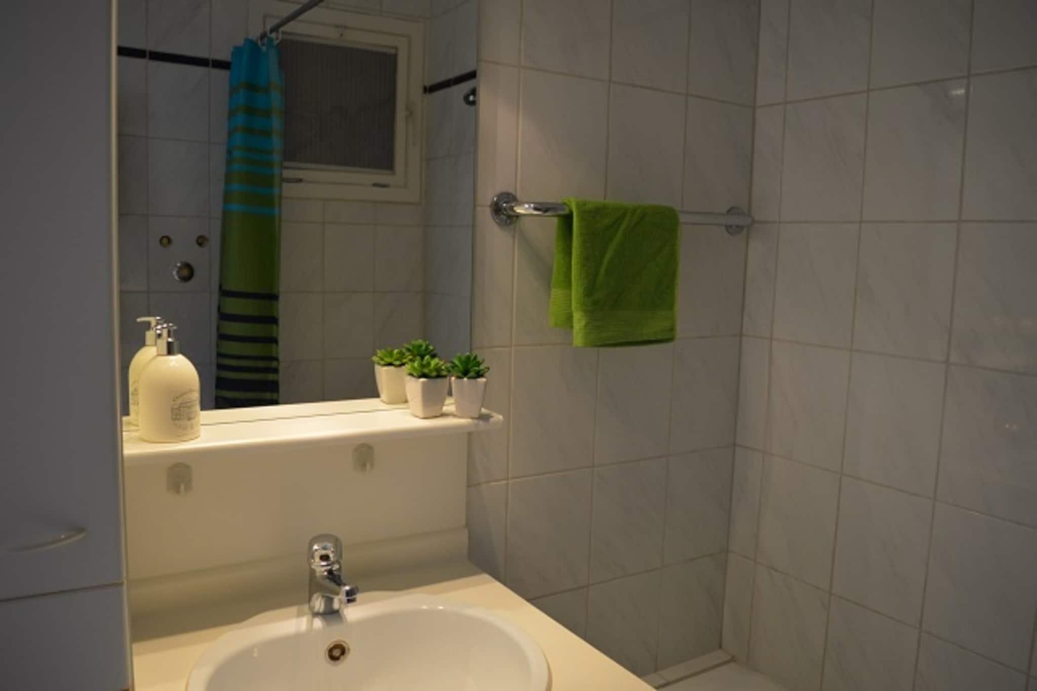 På 7: e vån.: (Kök(Kokplattor(elektrisk), vattenkokare, kaffebryggare(kaffetratt, kaffekapslar), ugn, mikrovågsugn, kyl och frys, ), ardags- och matrum(bäddsoffa, TV(platt-tv, digital), matbord, radio), sovrum(dubbelsäng(dubbeltäcke, 140 x 200 cm)), sovrum(enkelsäng(däcke), enkelsäng(däcke)), badrum(badkar med dusch, handfat), WC(toalett ), Tillgång till Internet) balkong, värme(central), cykelförvaring, hiss, strykjärn