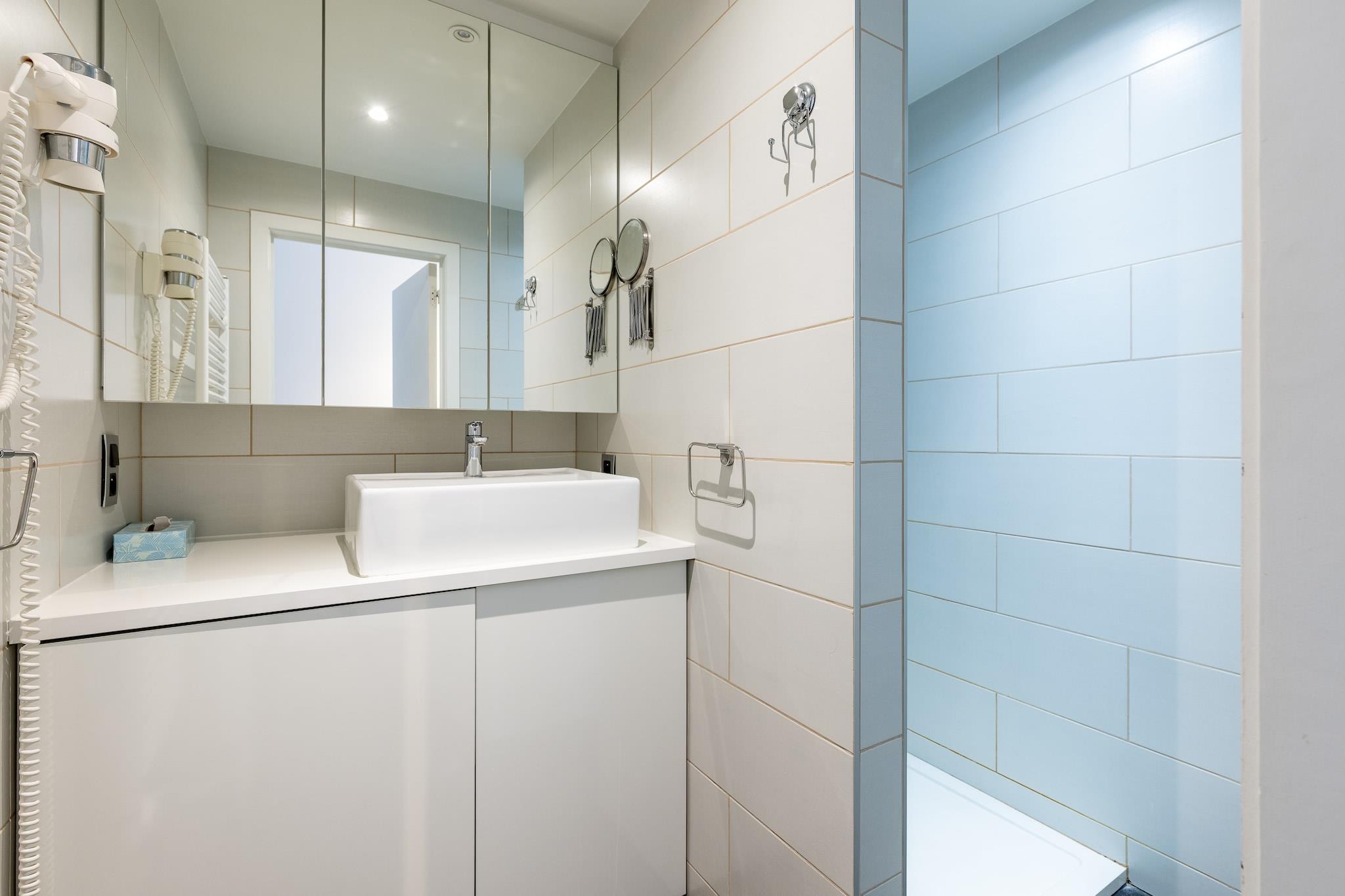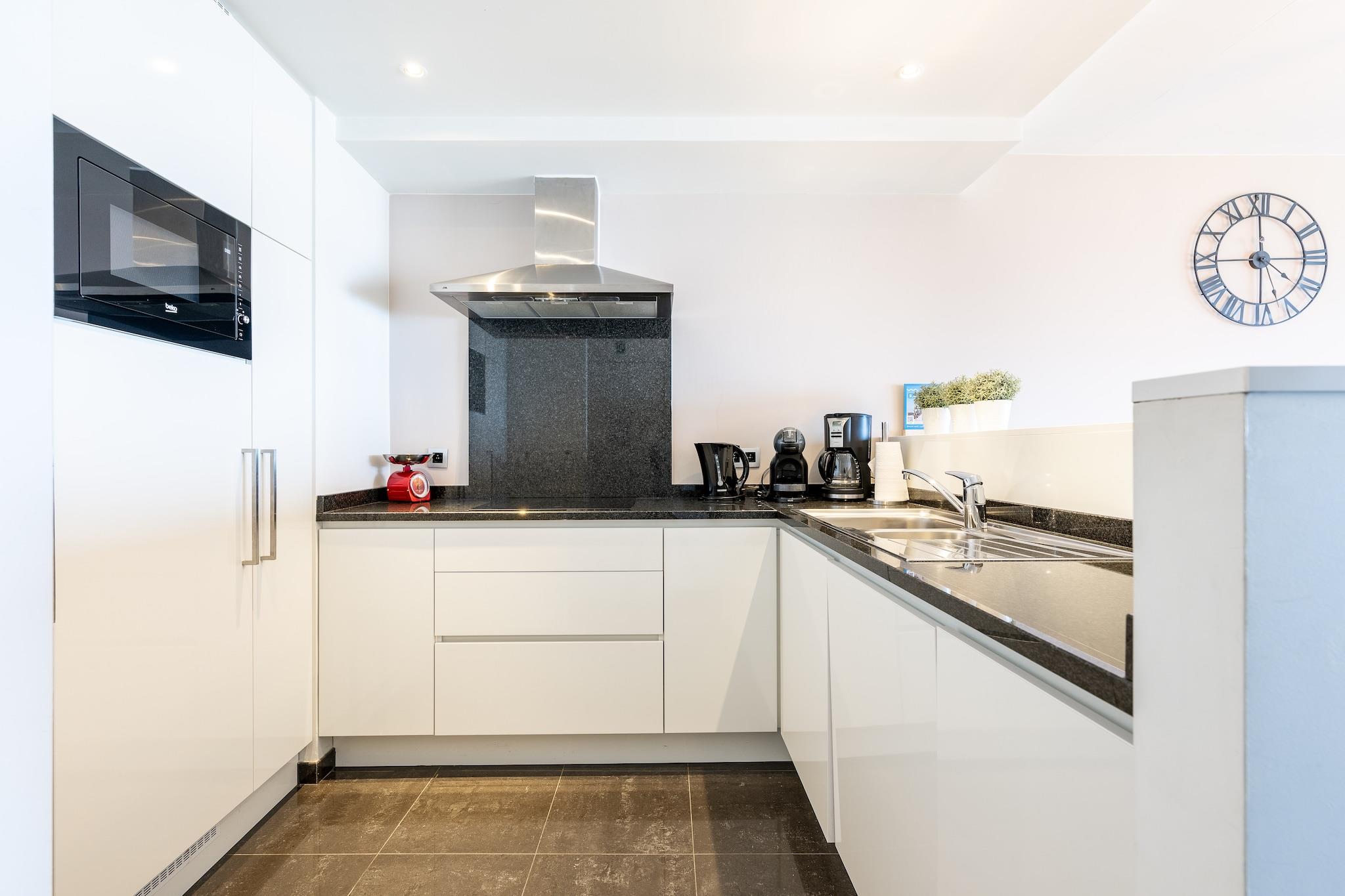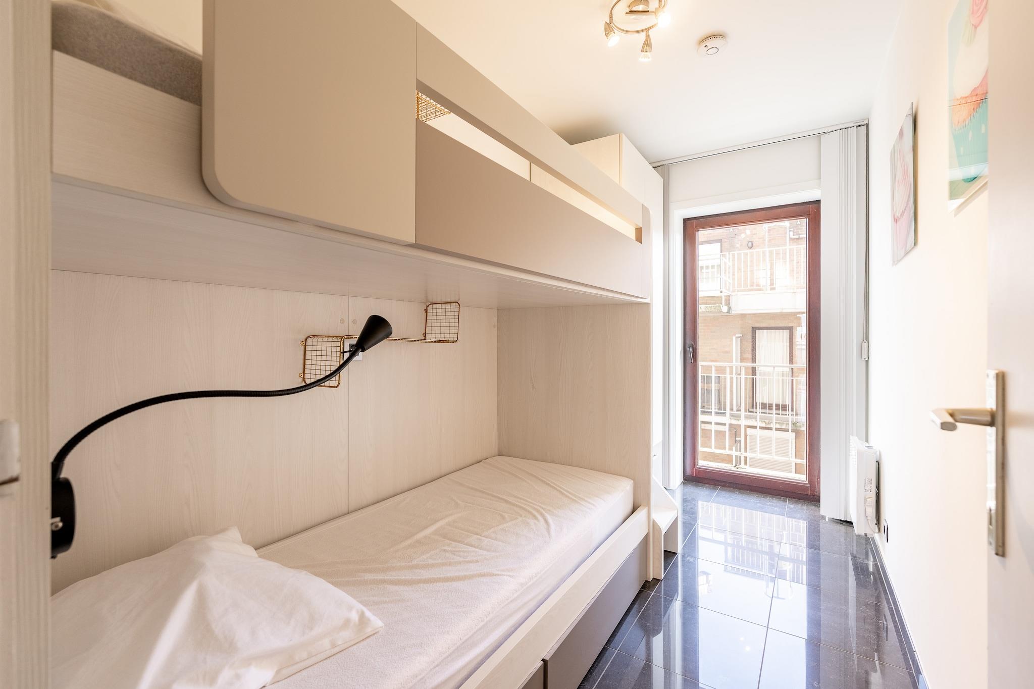 Denna moderna och stilfullt möblerade lägenhet är den perfekta blandningen av komfort och läge. Belägen på 5:e våningen längs Zeedijk i centrala Blankenberge, erbjuder den både en vacker terrass med havsutsikt framtill och en solig terrass i söderläge baktill, perfekt för en strandsemester med vänner eller familj. Lägenheten rymmer upp till 6 personer och har två sovrum: ett med en enkelsäng (2 madrasser på 80 cm) och det andra med en våningssäng. I vardagsrummet finns en bekväm bäddsoffa. Dunfiltar, kuddar och madrasskydd finns tillgängliga. Badrummet har dusch och handfat, med en separat toalett för extra bekvämlighet. Du hittar allt du behöver i det välutrustade köket, inklusive keramikhäll, mikrovågsugn, kylskåp med frys, diskmaskin, filterkaffebryggare, Dolce Gusto-maskin, vattenkokare, brödrost, mixer och alla nödvändiga köksredskap. Bekvämligheter inkluderar platt-TV, digital-TV, WiFi, tvättmaskin, torktumlare, strykjärn och dammsugare. Kliv ut och du är bara några minuter från Belgium Pier, Sea Life, Belle Epoque Centre, strandkaféer, minigolf och den livliga strandpromenaden. Med fantastisk utsikt och ett utmärkt läge erbjuder denna lägenhet allt du behöver för en avkopplande kustsemester. Små husdjur är varmt välkomna här! Upp till ett per vistelse, gratis så att din lurviga följeslagare också kan njuta av kustsemestern! Lägenheten är rökfri, rullstolsanpassad via hiss och har ett praktiskt cykelrum för gästerna.