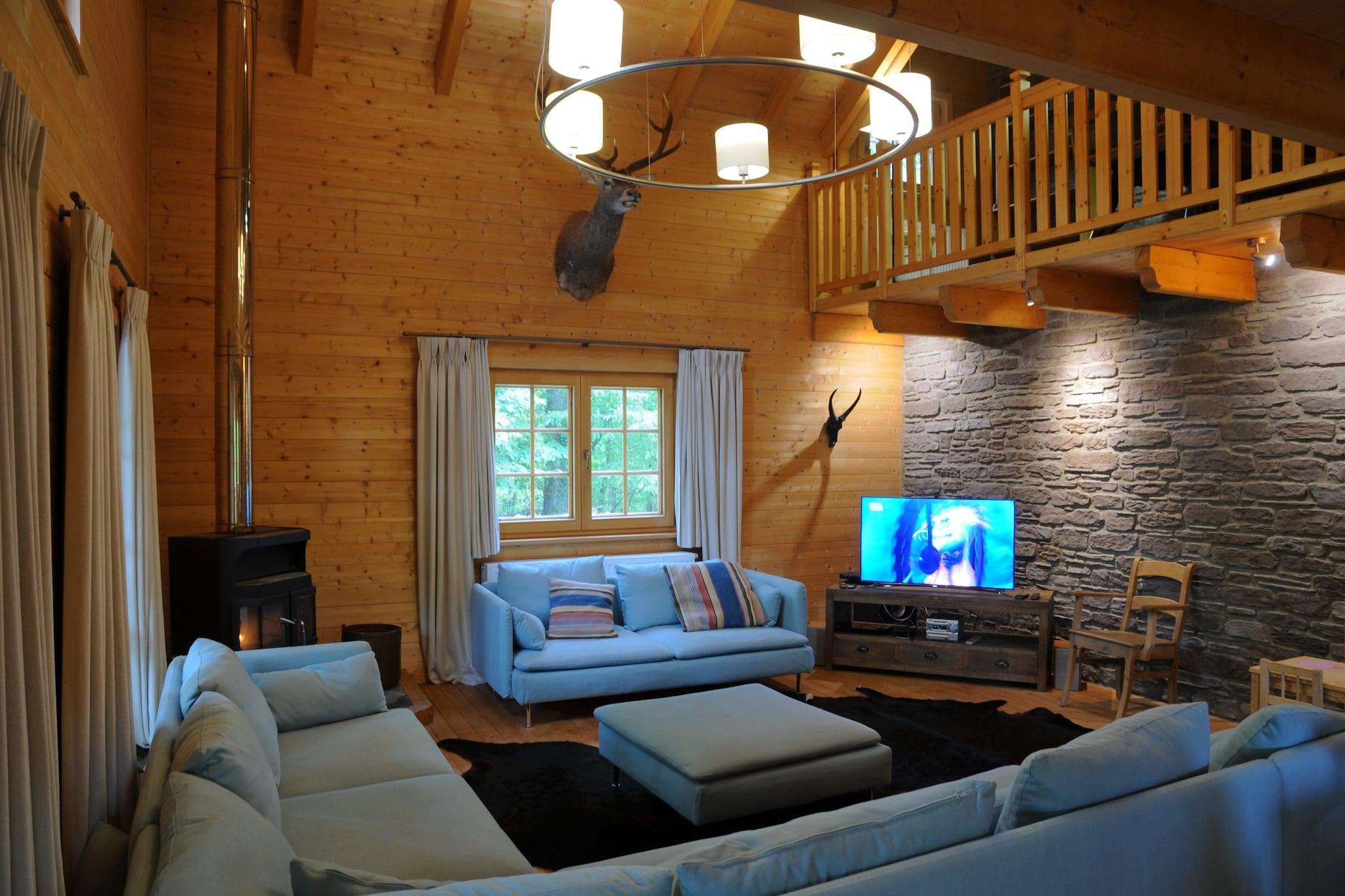 Bottenvåningen: (öppet kök(matbord, spis(gas), kaffebryggare(kaffekapslar), ugn, mikrovågsugn, diskmaskin, kylskåp, frys), ardags- och matrum(TV, matbord, Braskamin(trä), sitthörna, DVD-spelare), sovrum(dubbelsäng), sovrum(våningssäng), badrum(dusch, handfat), WC) På våning 1: (sovrum(dubbelsäng), sovrum(dubbelsäng), sovrum(dubbelsäng), sovrum(dubbelsäng), badrum(badkar, dusch, handfat), toalett ) Vindsvåning: (aktivitetsrum(fotbollsspel)) torktumlare, tvättmaskin, värme(central), terrass, trädgård, trädgårdsmöbler, grill, parkering, solstolar