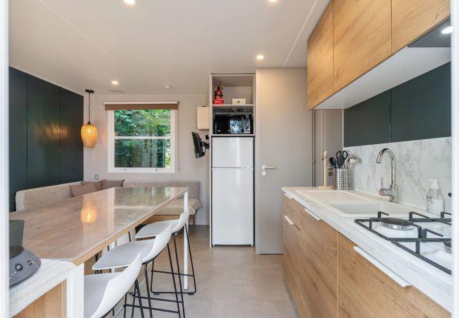 The holiday home has multiple bedrooms, a fully equipped kitchen and a cosy living area where you can relax together. Outside, you'll find a private terrace with a view of the greenery – perfect for breakfast in the sun or a relaxed evening with a drink.