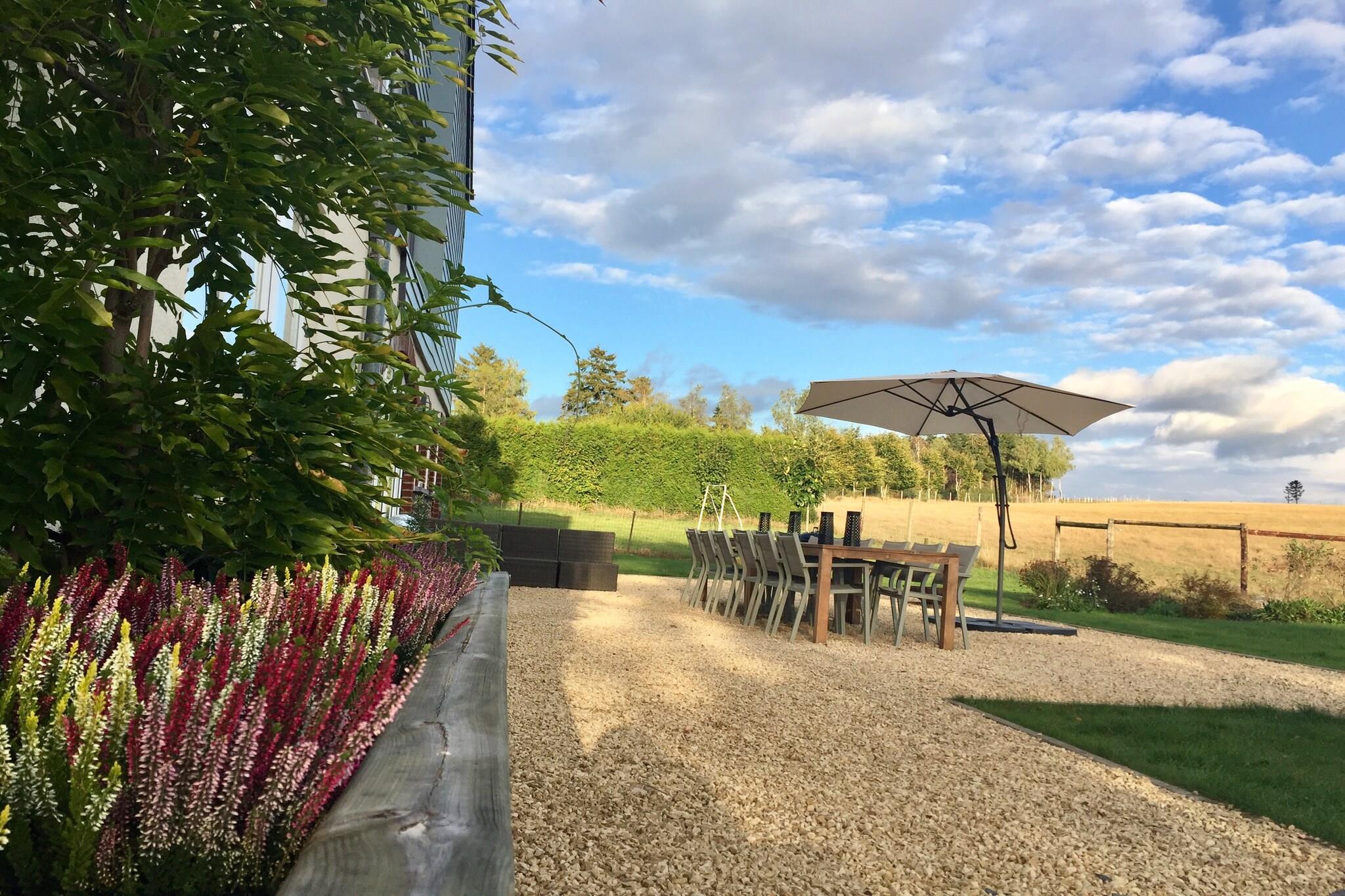 Een zalig weekend gehad in dit huis, we waren met 6 koppels. Genoeg ruimte. Prachtige vergezichten. Mooie wandelingen. Extreem rustig. In de tuin staan herten wat toch redelijk uniek is. Het zwembad en het interieur zijn receht opgefrist, dat is nog niet te zien op de foto's. Het ontvangst was persoonlijk en hartelijk. Enige kleine minpuntjes zouden kunnen zijn: Voor de zesde slaapkamer moet je door de vijfde heen. Het verhuurde gedeelte is het gelijkvloers en niet het hele gebouw zoals op de foto's. Hert dichtsbijzijnde cafeeetje is op meer dan 5 km.