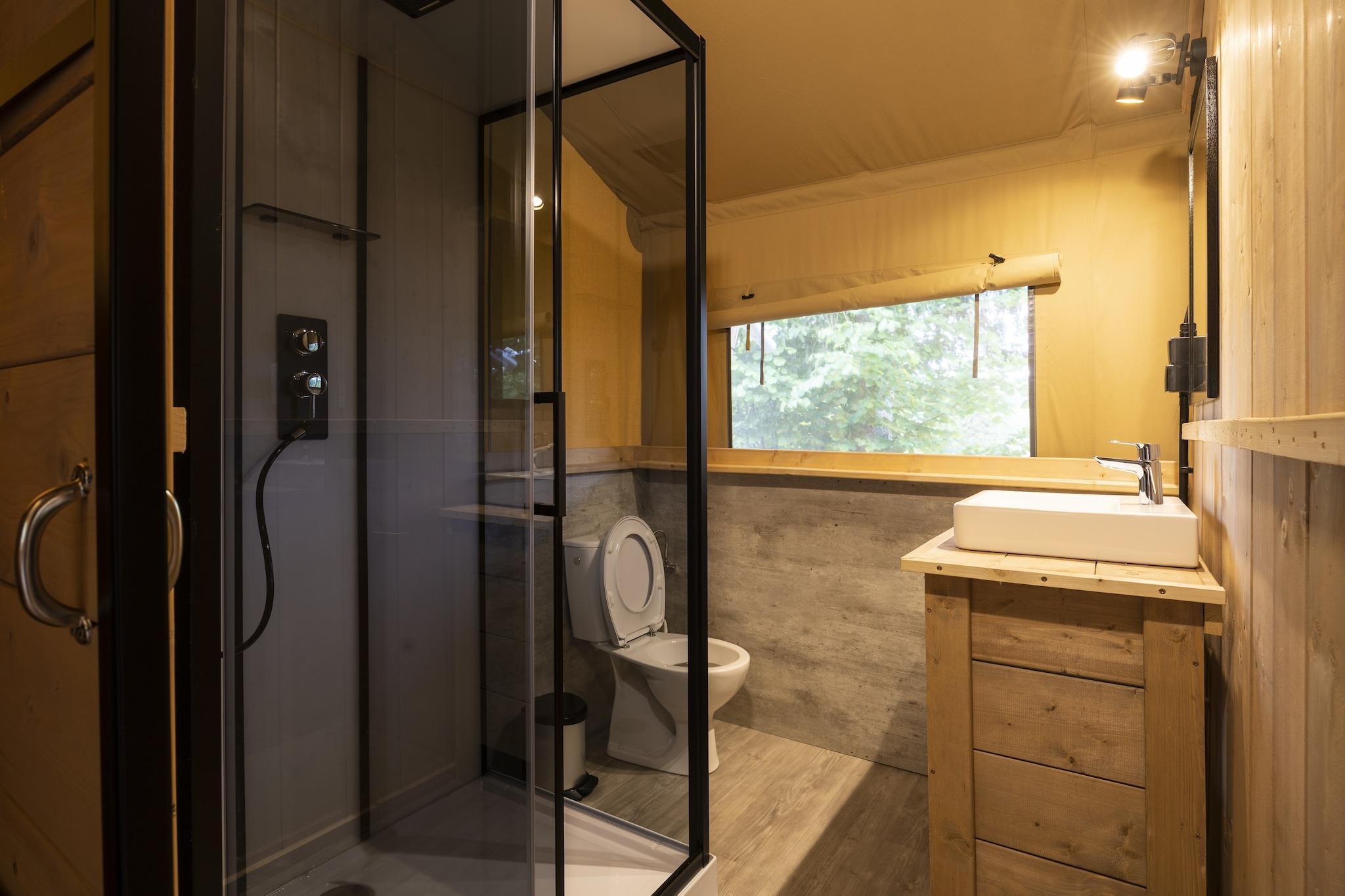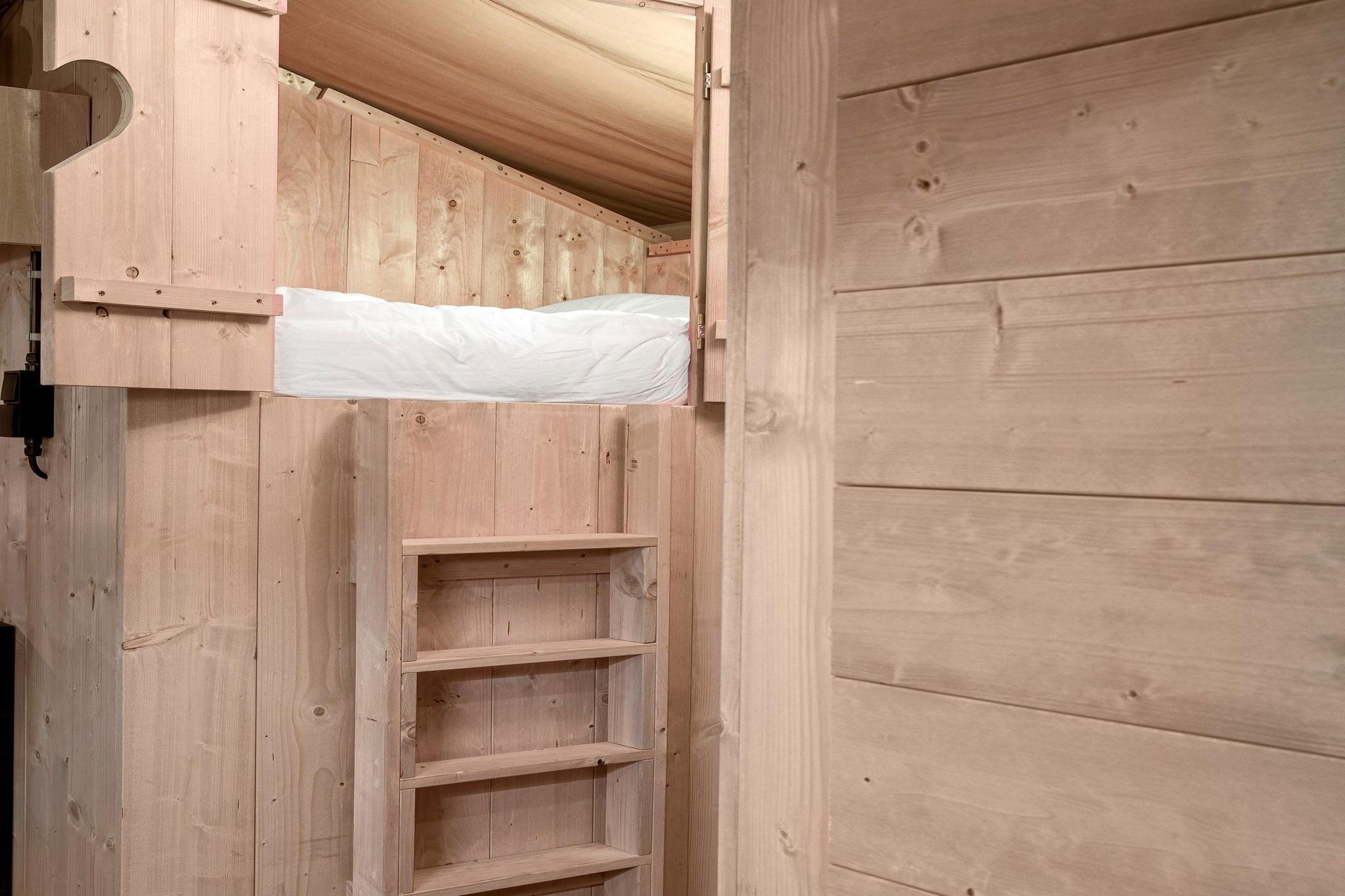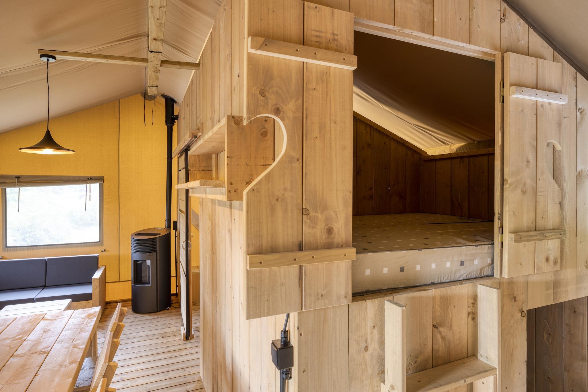 Semester med barnen Detta boende är fullt utrustat och ligger i hjärtat av vår familjecamping. Perfekt för att bo med barn. Tälten är placerade på rymliga ställplatser utan staket, vilket gör dem intressanta att bo med flera familjer bredvid varandra. Du kan parkera din bil precis bredvid dem. Tältet är utrustat med 3 sovrum. Ett master bedroom med dubbelsäng. Det andra sovrummet har två enkelsängar och en våningssäng för ett barn (max 30 kg). Vårt Dreamer 49-tält för personer är utrustat med: Föräldrarum med dubbelsäng Andra sovrummet med två enkelsängar och en våningssäng för ett barn som väger upp till 30 kg. Tredje sovrummet med två enkelsängar/hög sovplats och 1 dubbelsäng Täcken, kuddar och sängkläder finns i sovrummen Vardagsrum med sittgrupp och matbord Pentry med kyl, mikrovågsugn, kaffebryggare och elspis Porslin, bestick och köksredskap Toalett , dusch och tvättställ Loungeset Pelletskamin Husdjur tillåtna Gratis parkering för 1 bil