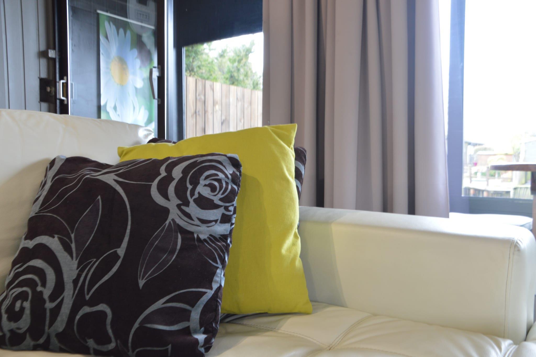 Bottenvåningen: (öppet kök(brödrost, spis(gas), kaffebryggare, ugn, mikrovågsugn, kyl och frys), ardags- och matrum(TV(kabel), DVD-spelare, stereo), sovrum(dubbelsäng), badrum(dusch, handfat, toalett )) Viksäng 1 pers., Viksäng 1 pers., dusch eller badkar, uteplats, värme(elektrisk), luftkonditionering, terrass(tak), trädgård(inhägnad), trädgårdsmöbler, solstole, grill, parkering, solstolar, spjälsäng