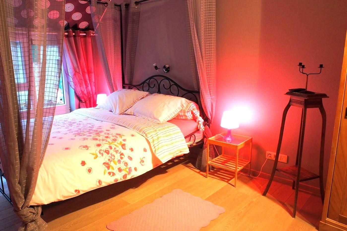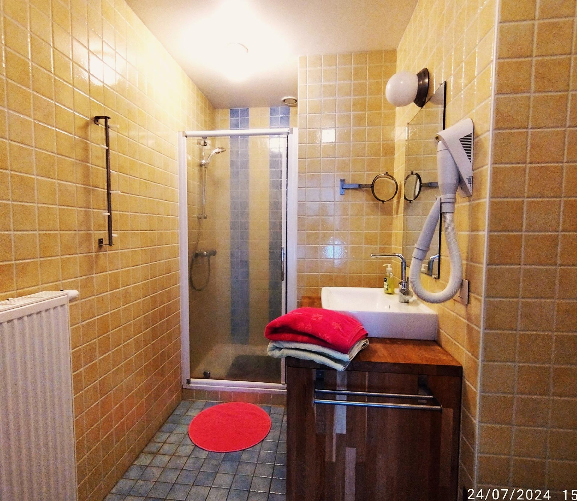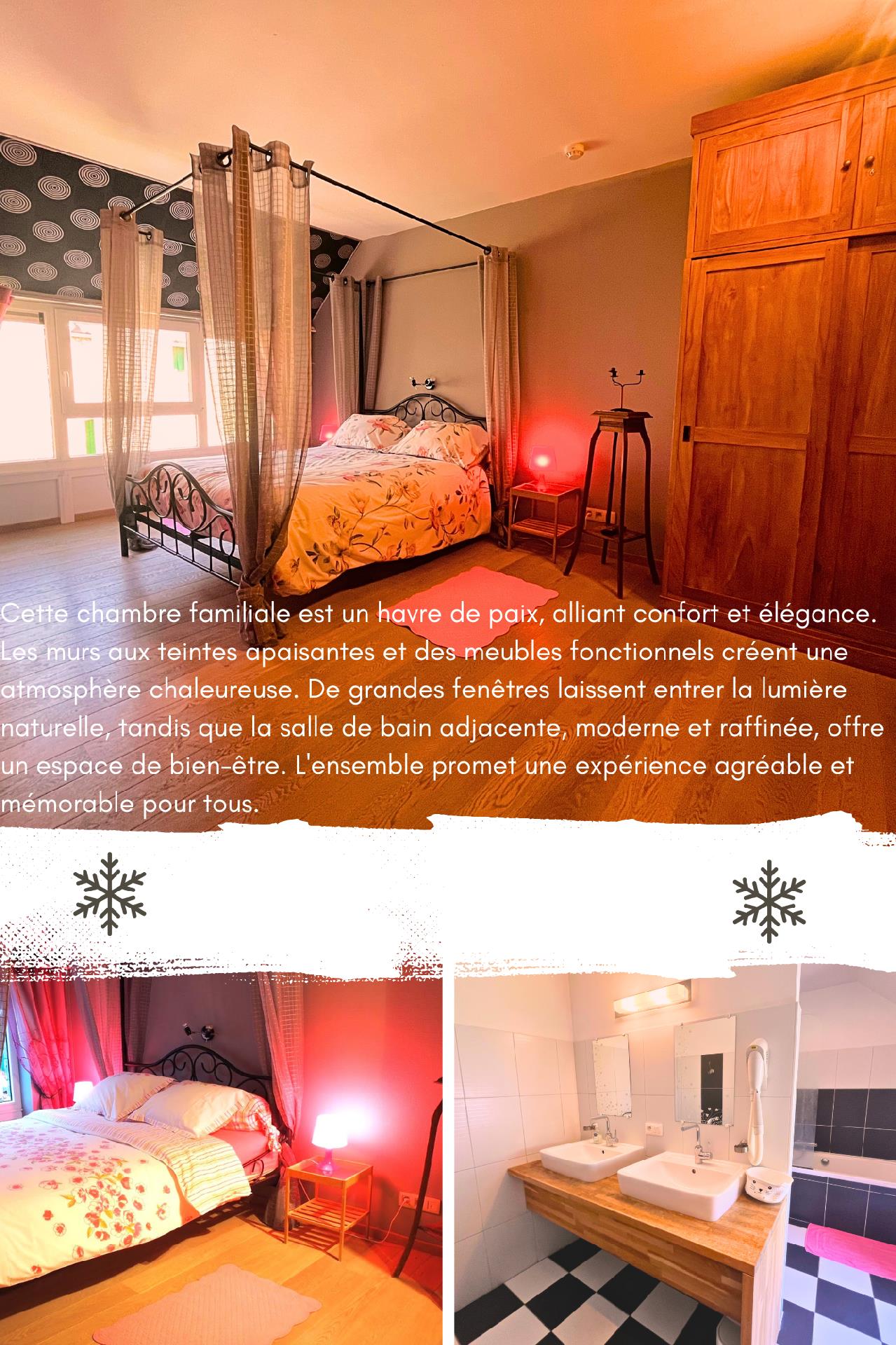 The interior of the gîte features a successful blend of tradition and modernity. Enjoy a spacious living room with a beautiful bar and ice-cube freezer, a professional stainless steel kitchen, board games, lots of books and a giant flat-screen TV. Comfort is king, with underfloor heating, a pellet stove for a cosy atmosphere and free Wi-Fi. For your privacy, each room has a TV/DVD and a private bathroom, some with a shower, WC and washbasin, others with a large bath, WC and double washbasins.