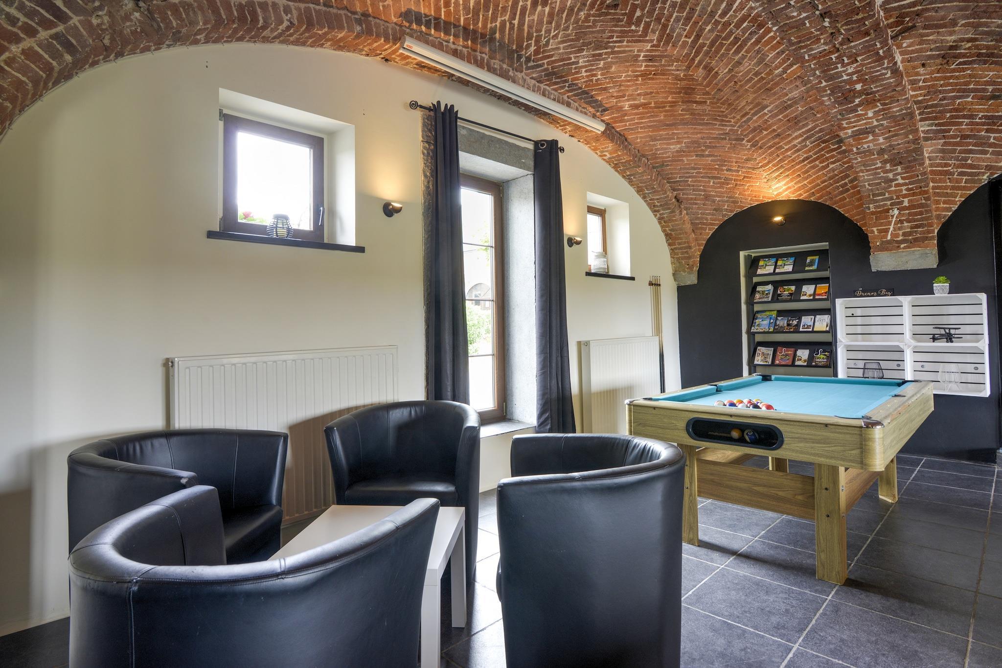Fördjupa dig i den tidlösa charmen i de belgiska Ardennerna på La Ferme d'Harroy, ett autentiskt före detta bondgårdshus som kärleksfullt omvandlats till en rymlig semesterort vid Lesses fridfulla strand. Designad för att vara värd för upp till 30 gäster, är det den perfekta miljön för familjeåterföreningar, företagsseminarier eller längre sammankomster med vänner. Med 9 bekväma sovrum, alla med eget badrum, och 2 angränsande familjevänliga rum, njuter varje gäst av både avskildhet och bekvämlighet. Tillgänglighet är också en prioritet här, med rullstolsanpassade faciliteter och en hiss som säkerställer att alla känner sig hemma. Husets hjärta är skapat för gemenskap: ett professionellt kök för att enkelt laga mat, en välkomnande matplats för gemensamma stunder och en mysig lounge med bar och biljard för kvällsnöje. Gå ut och upptäck en värld av fritid - njut av utsikten från terrassen, spela boule eller bordtennis, elda grillen eller låt barnen utforska lekplatsen. Perfekt beläget nära den kungliga egendomen Ciergnon, öppnar denna oas dörren till några av regionens skatter, från naturreservatet Furfooz och de legendariska Han-grottorna till det sagolika slottet Lavaux-Sainte-Anne. Oavsett om du är här för äventyr, avkoppling eller teambuilding, lovar La Ferme d'Harroy en oförglömlig vistelse. Vårt semesterhus är främst anpassat för familjer - föräldrar, barn och mor- och farföräldrar - samtidigt som det välkomnar företag för seminarier eller teambuilding-helger. För professionella grupper krävs bevis på företagsstatus.