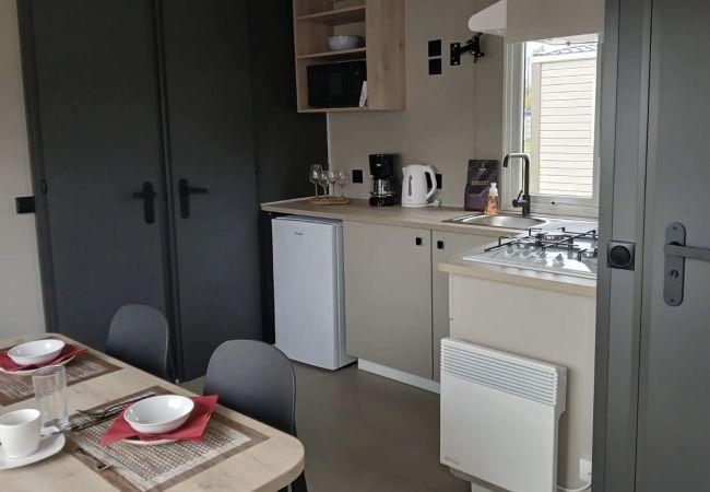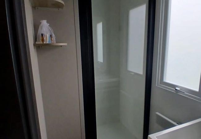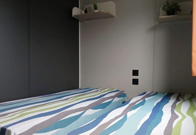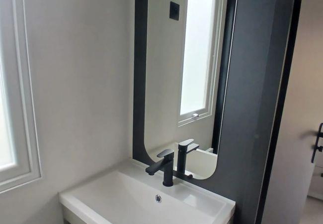 Outside, you can enjoy an elevated wooden terrace where you can sit comfortably, surrounded by a spacious plot of at least 125 m². This gives you all the space to enjoy your holiday in complete tranquillity..