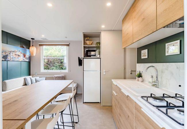 The house accommodates up to six people and features a modern interior, three bedrooms, a fully equipped kitchen, and a cosy living space. Thanks to the private terrace and quiet location, you can relax here wonderfully – whether you choose breakfast in the morning sun or a long summer evening with a view of the greenery.
