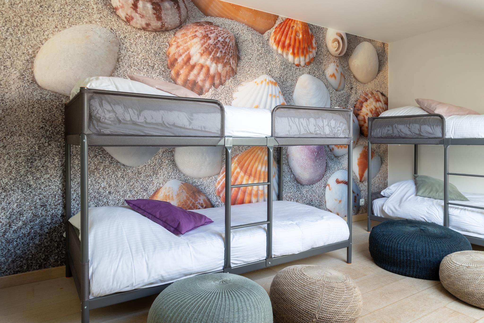 Bottenvåningen: (Hall, Korridor(toalett ), Kök(Kokplattor, vattenkokare, Fläkt, kaffebryggare(kaffetratt), ugn, mikrovågsugn, diskmaskin, kylskåp, frys), ardags- och matrum(TV, matbord, sitthörna), sovrum(enkelsäng, enkelsäng), sovrum(dubbelsäng, vagga, balkong eller terrass, skötbord), badrum(badkar, dusch, handfat, toalett ), inglasat uterum(grill)) På våning 1: (sovrum(våningssäng, våningssäng), sovrum(dubbelsäng), sovrum(dubbelsäng), sovrum(enkelsäng, enkelsäng), sovrum(enkelsäng, enkelsäng), badrum(dusch, handfat, handfat), badrum(badkar, dusch, handfat, toalett ), Öppen övervåning(dusch, toalett )) fransk balkong, terrass, trädgård, trädgårdsmöbler, parkering, swimmingpool(privat, uppvärmd, inomhus), rutschkana, Gungställning