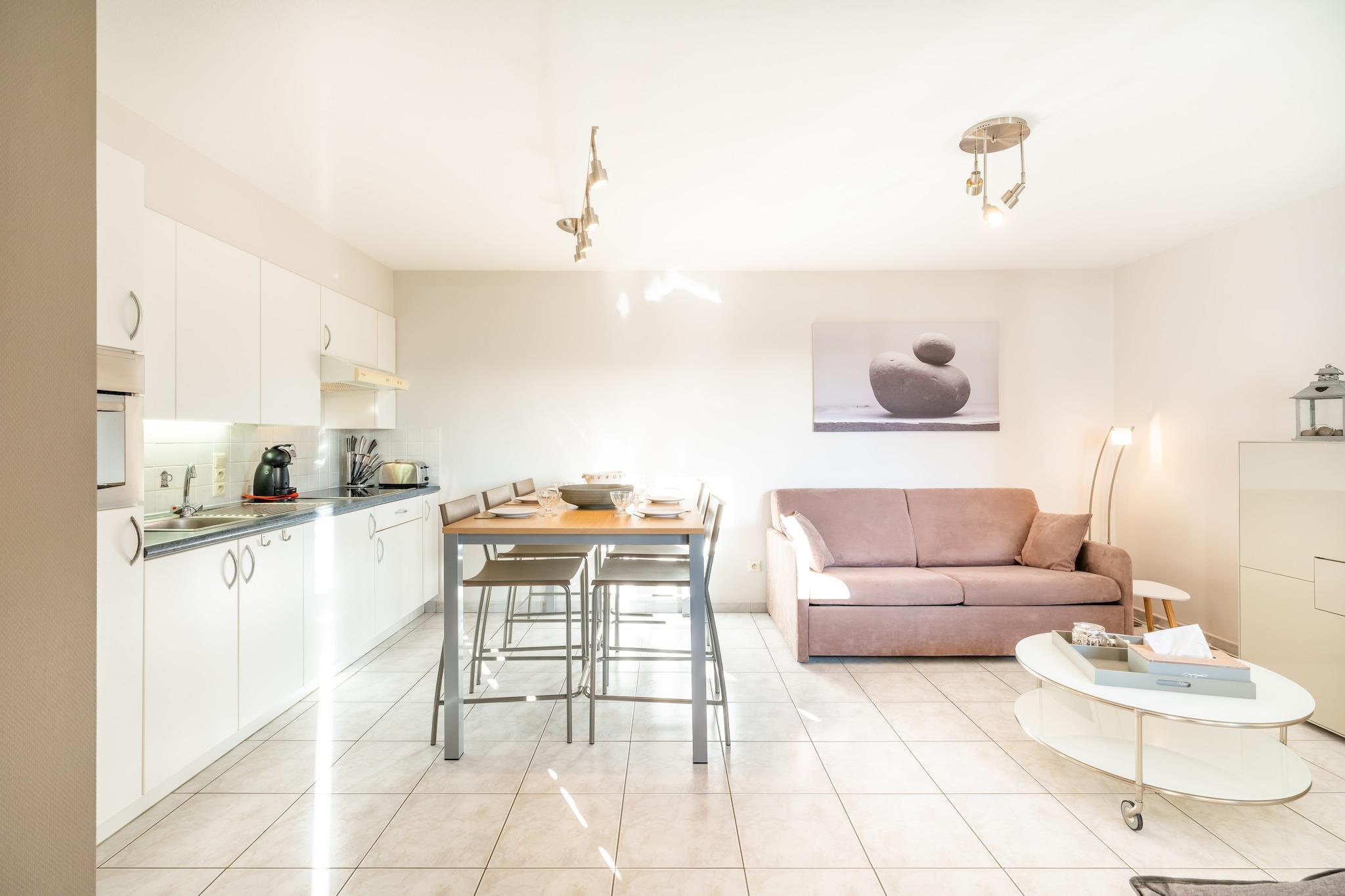 Charmig lägenhet med ett sovrum inom gångavstånd från havet (ingen större gata att korsa). Lägenheten ligger mellan Koksijde och St-Idesbald, på Residence Koksijde Promenade i sanddynerna. Spårvagnshållplats i närheten. Perfekt att röra på sig under din vistelse. Du kan hitta planen för lägenheten på bilderna. Denna bekväma och snygga lägenhet består av en hall med en sovalkov, ett vardagsrum med ett öppet fullt utrustat kök, en rymlig och möblerad solig hörnbalkong med utsikt över trädgården, ett sovrum, ett badrum med dusch, inga husdjur tillåtna, ingen rökning, parkeringsplats ingår. OBS: underjordisk parkering för små bilar och bra förare! Obs: Det är en rabatt på 10 % som införs på grund av pågående byggnadsarbeten som innebär buller och kan påverka lugnet och lugnet i området.