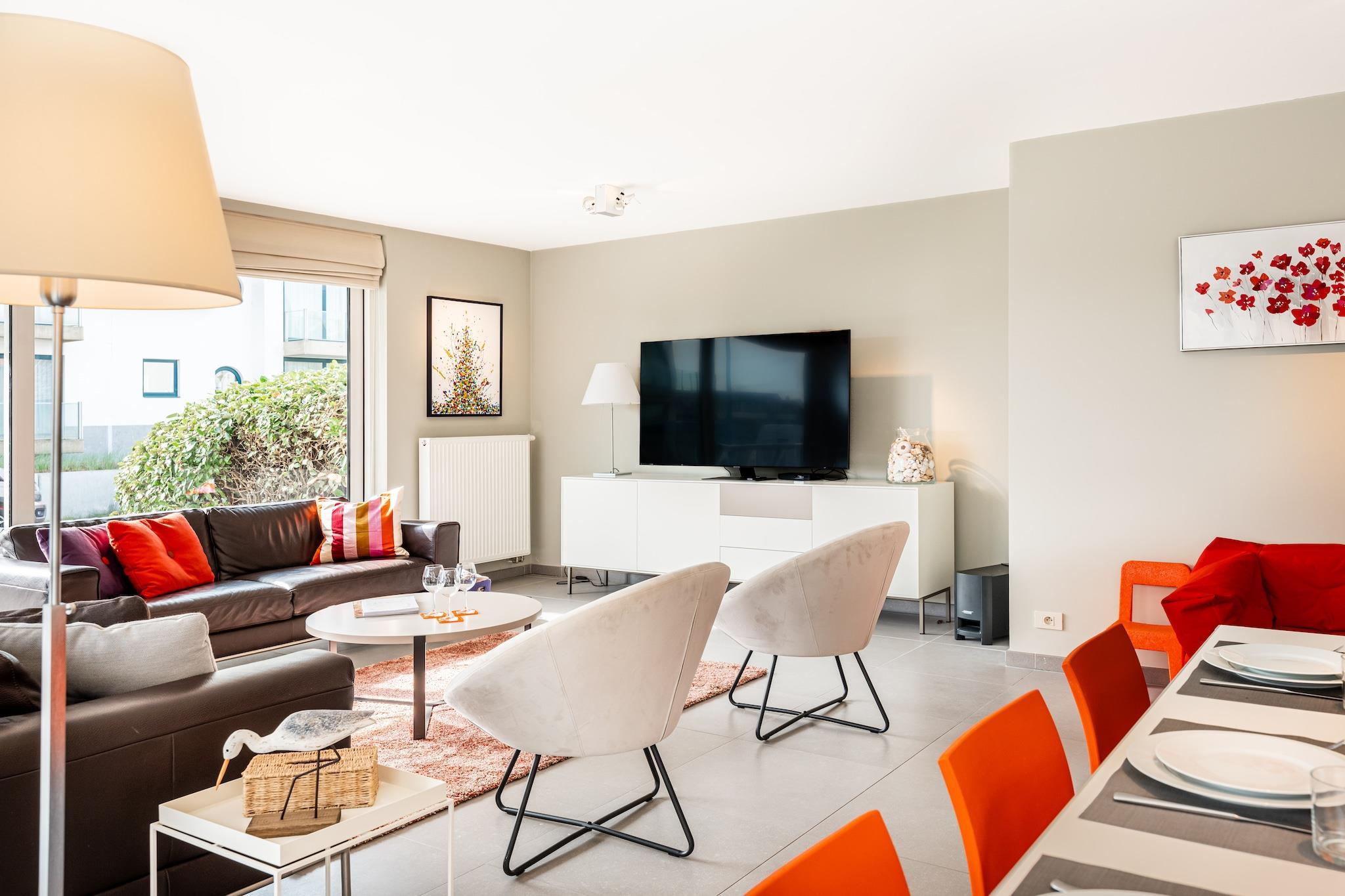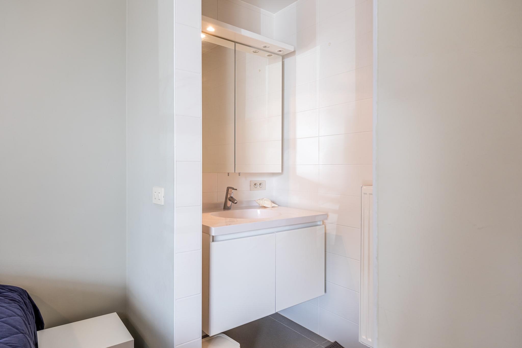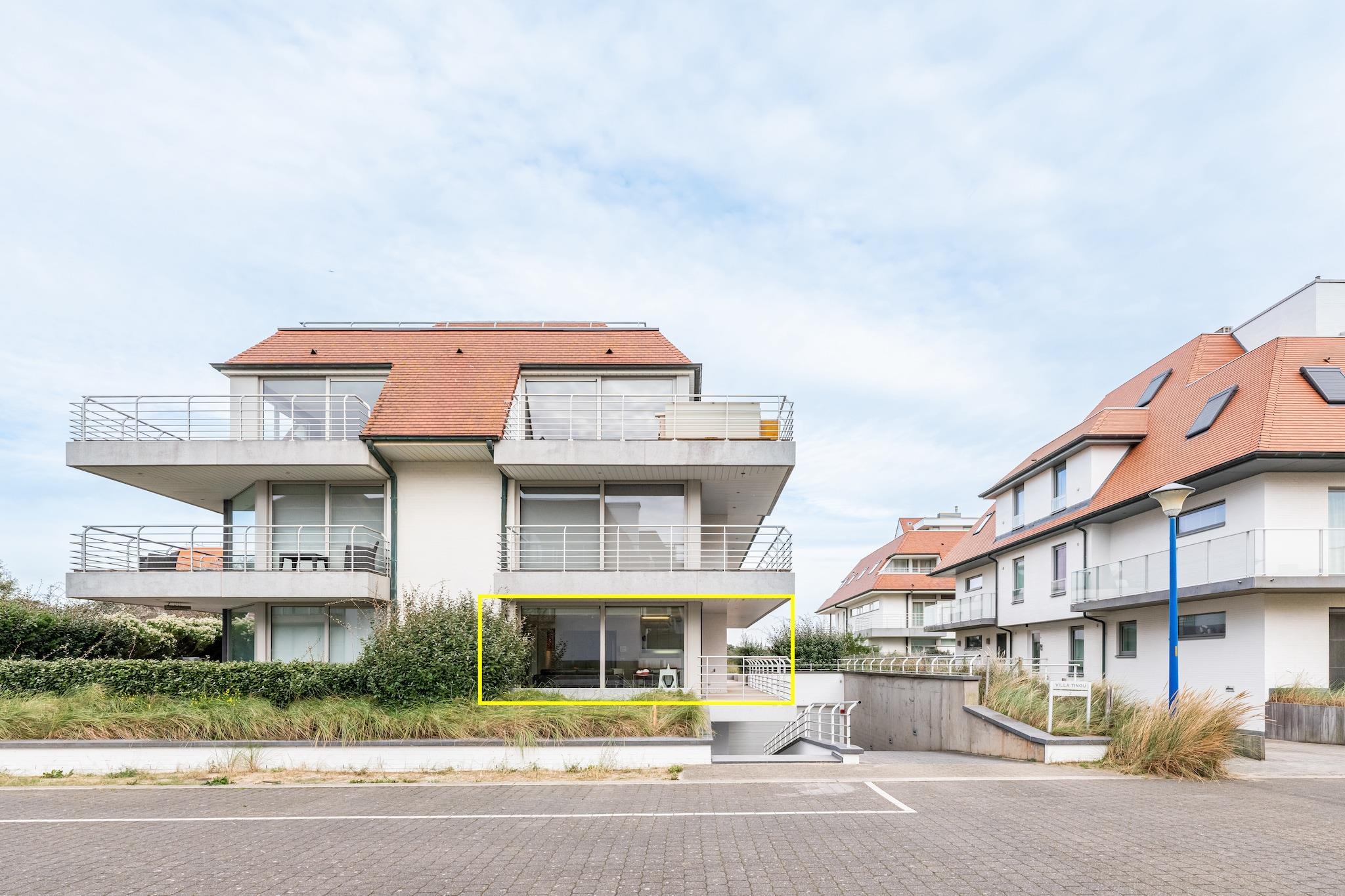 20 m från sanddynerna/havet med 2 sovrum - 6 personer Denna rymliga, soliga och trendigt inredda lägenhet i Villa Tinou ligger precis bakom sanddynerna mellan Koksijde och Oostduinkerke. Lägenheten är utrustad med alla bekvämligheter, har WiFi & digital-TV, 2 sovrum, 2 badrum, tillräckligt med förvaringsutrymme och en rymlig terrass. Det är väldigt tyst. Den privata parkeringsplatsen för en bil och flera cyklar under byggnaden är ett stort plus. Layout Gå in i entréhallen med separat toalett och förråd/tvättstuga med tvättmaskin, torktumlare & torkställning. I det rymliga vardagsrummet och matsalen kan du njuta av en trevlig film med hela familjen i tv-hörnan, äta bekvämt och njuta av matlagning i det öppna köket med vitrokeramikhäll, kombinerad mikrovågsugn, diskmaskin, kyl med frys. Från vardagsrummet har du tillgång till den soliga balkongen på framsidan och altanen med bord/stolar/parasoll på sidan. Det finns 2 rymliga sovrum vardera med eget badrum. Det första rummet har 2 enkelsängar med resårmadrasser (90x200), 2 kuddar och täcke (240x220) samt dusch och handfat. Detta rum ger dig direkt tillgång till terrassen. Det andra stora rummet har även 2 enkelsängar med resårmadrasser (90x200) och ytterligare en våningssäng (2x 80x200). Det finns 4 kuddar och 3 täcken (2 x 140x90 och 1 240x220). Detta rum har ett eget badrum med badkar, dubbla handfat och toalett. Det finns tillräckligt med utrymme i båda rummen för att lägga till en babysäng.