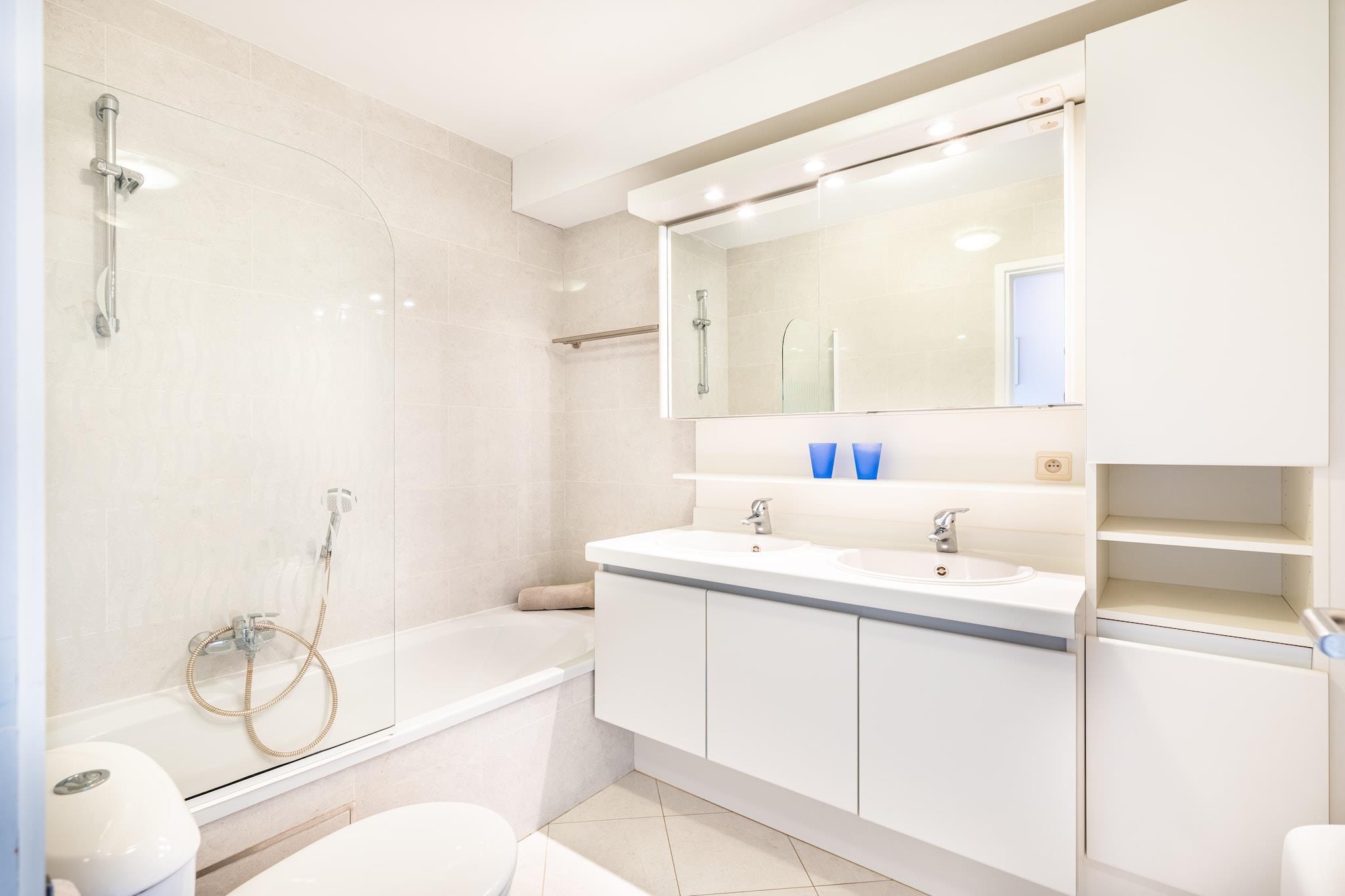 300 meter från havet - 3 sovrum - 8 personer Denna rymliga och lyxigt inredda lägenhet ligger precis bakom sanddynerna, mellan Koksijde och Saint-Idesbald. Lägenheten erbjuder all nödvändig komfort, med WiFi och digital-tv, 3 sovrum, 2 badrum, gott om förvaringsutrymme och en stor hörnterrass. Det ligger på en mycket lugn plats. Garageboxen och utomhusparkeringen är betydande fördelar. Layout Till lägenheten hör en hall med separat toalett, garderob, vardagsrum med omgivande balkong/terrass, öppet och utrustat kök med keramikhäll, diskmaskin, kombinerad mikrovågsugn, kyl med frys. Ett förråd med tvättmaskin, torktumlare, strykjärn, strykbräda, torkställning. Matplats med bord och 8 stolar, 2 stolar + ottoman (Ikea Pello-modell), bäddsoffa för 2 personer i vardagsrummet, 1 sovrum med 1 dubbelsäng och privat angränsande badrum med dusch, 2:a sovrummet med våningssäng och utdragbar lamellbotten + madrass för en person, 3:e sovrummet med 2 enkelsängar bredvid varandra, 2:a badrum med badkar, toalett och handfat.